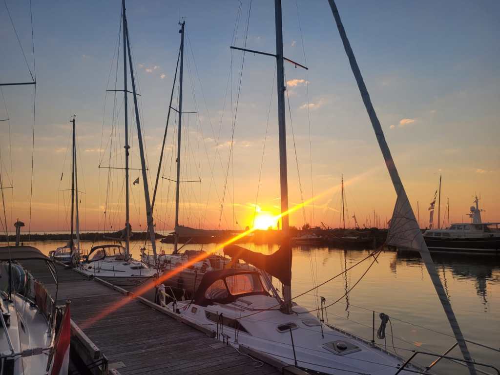 Und wieder haben wir tollen segelwind und können das Meiste der 22sm auf natürlichem Wege bewältigen. Wir kommen recht spät in Stavoren an und bekommen einen der letzten Plätze in der Marina am Anmeldesteg. Ansonsten hätten wir auch ankern können, aber da wir unser Dingi nicht dabei haben würden wir nicht mehr in den Ort gehen können. Nach einem Abendessen an Bord, schlendern wir auf der Suche unter anderem nach einem Eis durch den netten, mit Booten allerdings auch überfüllten Ort. In der Mitte durchquert Stavoren ein Kanal in den man durch eine Schleuse hineinfahren kann. Aber dort einen Platz quasi mitten im Geschehen zu bekommen ist relativ aussichtslos. Am Rande des Ufers finden neben den Booten überall Grillevents mit guter Laune statt. Wir finden tatsächlich auch keinen Platz in einem Biergarten, aber dafür haben wir ja noch unser Cockpit.