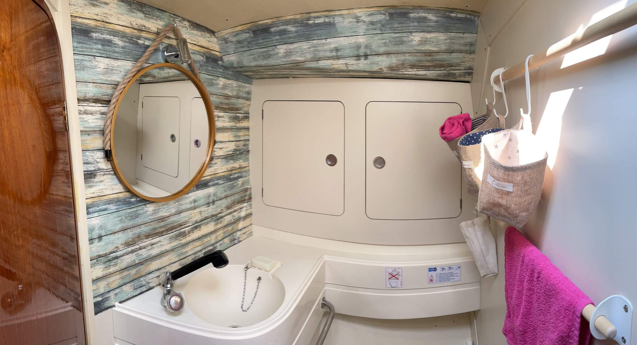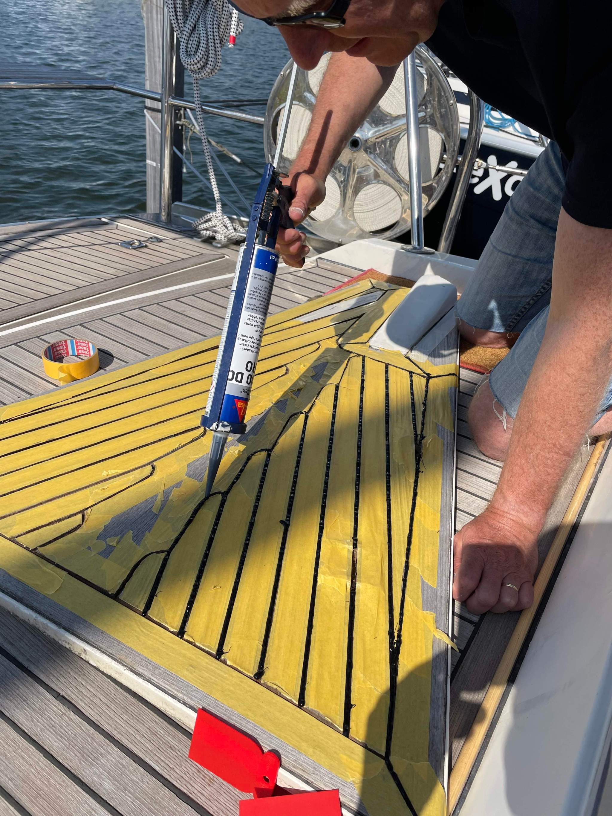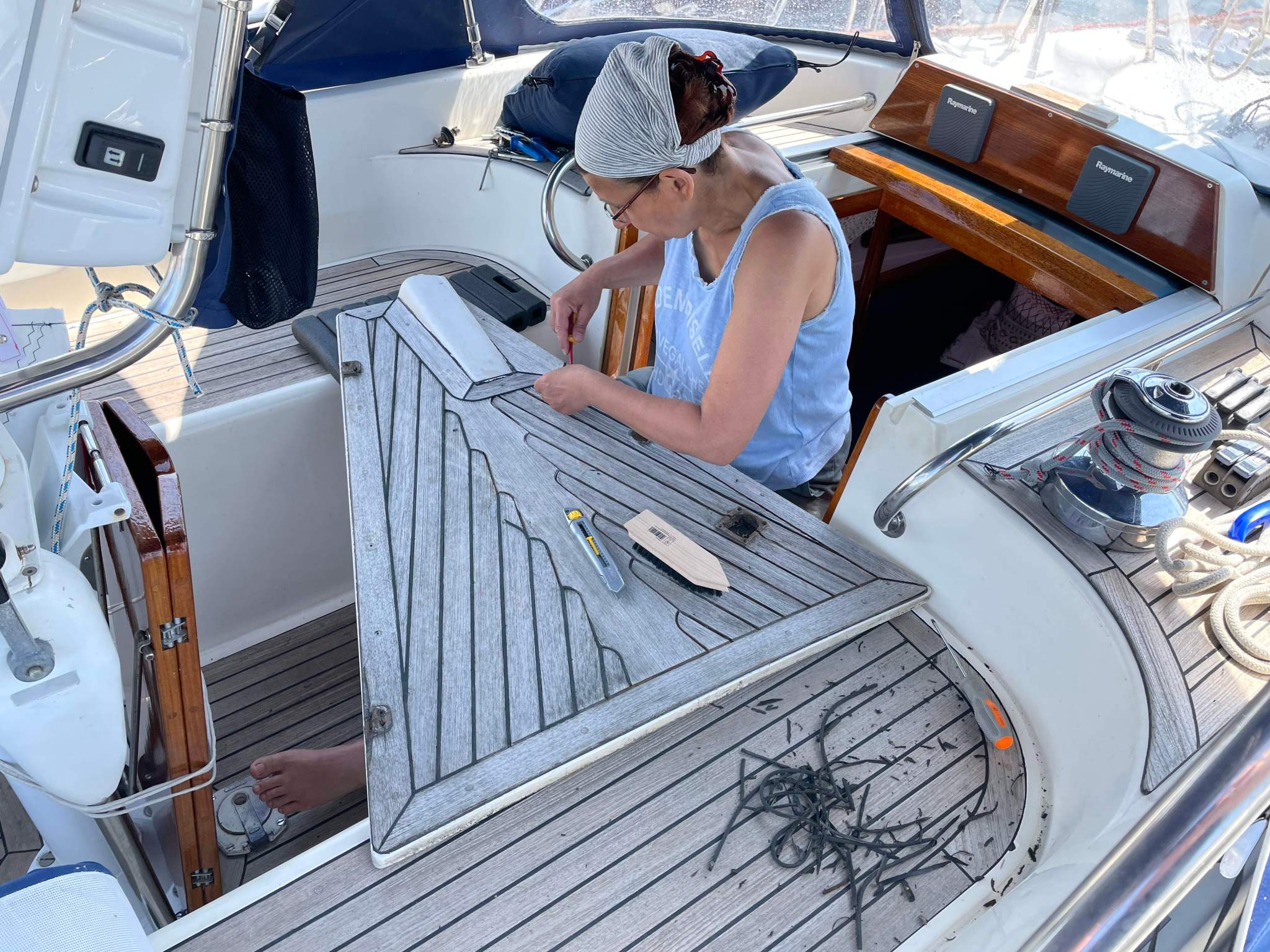 In den ersten Tagen erledigen wir im Hafen einige sehr konstruktive Dinge. Die Badezimmer werden aufgehübscht, in dem wir die Wände schick bekleben und einigen nützlichen Schnick Schnack aufhängen. Dann wird z.B. der Radar mit einer neuen Adapterplatte am Heck montiert und neue Relingseile werden angebracht. Wir versuchen auch mal die Ankerklappe neu zu verfugen. Wir verwenden dafür Sikaflex was für so einen kleinen Bereich ok ist aber für das gesamt Deck undenkbar viel Arbeit bedeuten würde.