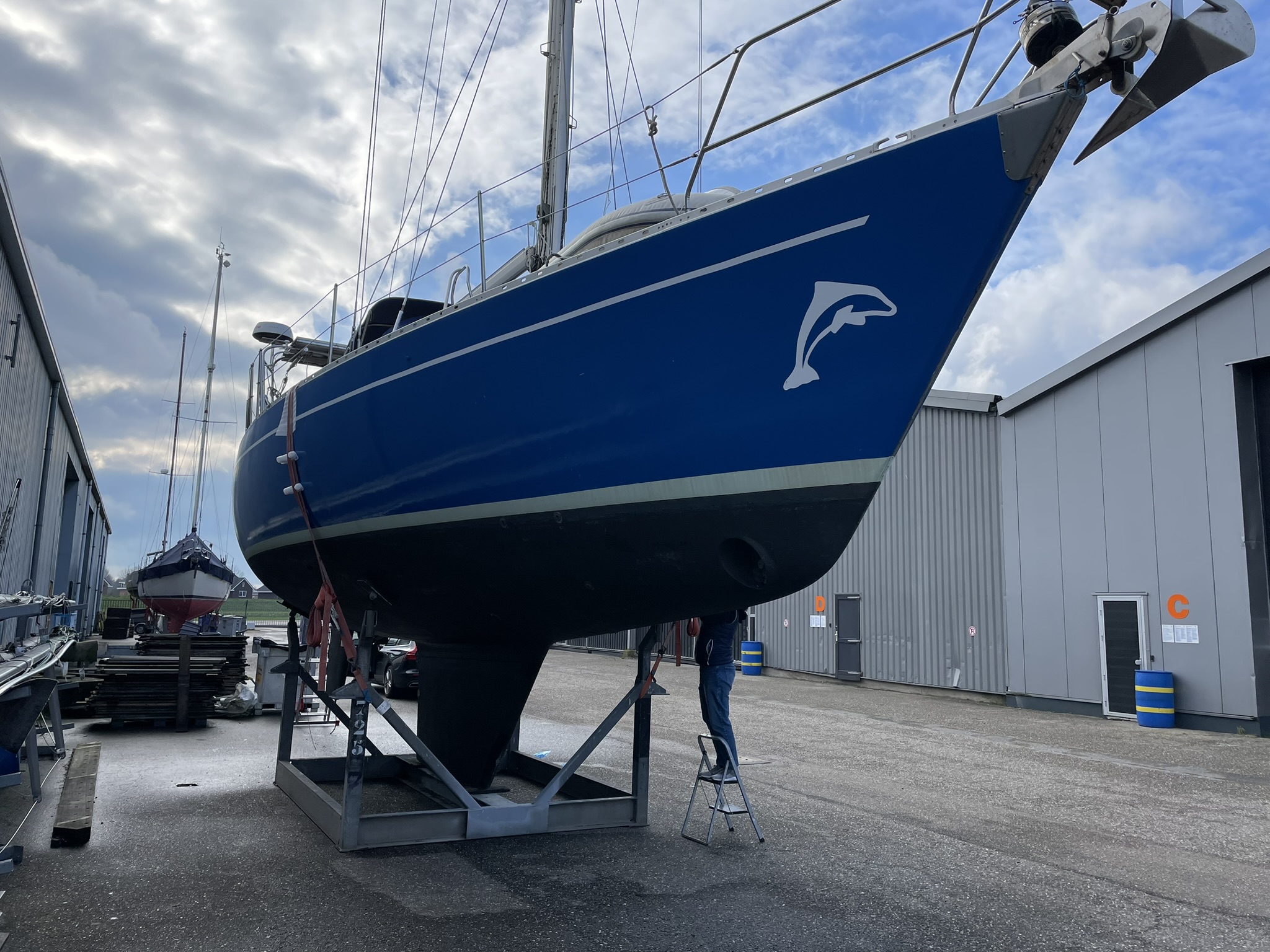 Da auch wir bald ins Wasser gelassen werden, wird es Zeit Auryn einen neuen Unterwasseranstrich zu verpassen. Wir machen uns also mal wieder auf in die Flevo Marina. Als wir am Boot ankommen, steht es übrigens nicht mehr zwischen den anderen hunderten von Booten auf dem Parkplatz sondern neben den Werfthallen. Das ist ein gutes Zeichen, heißt es doch dass die Werft angefangen hat die Aufträge abzuarbeiten.