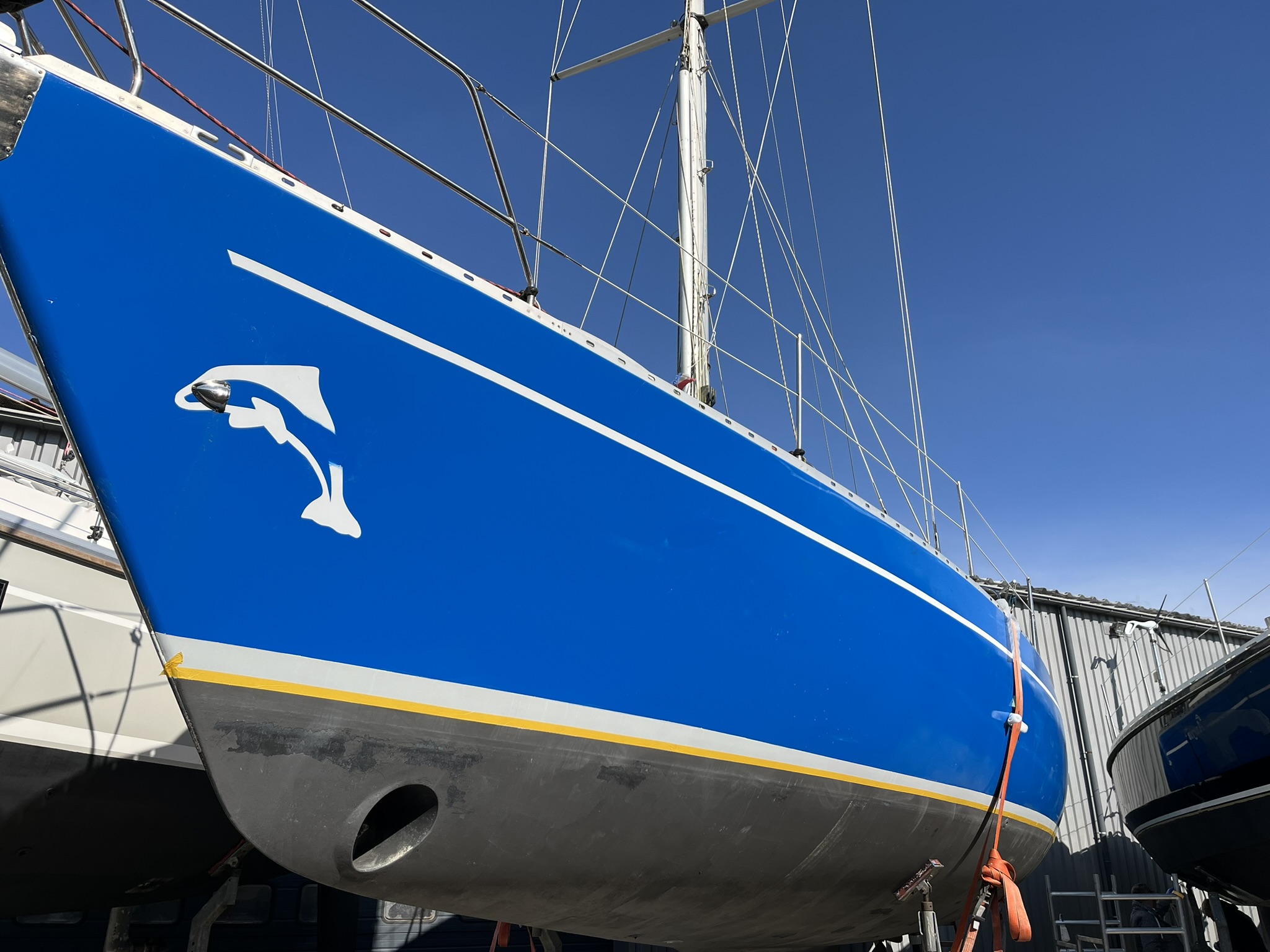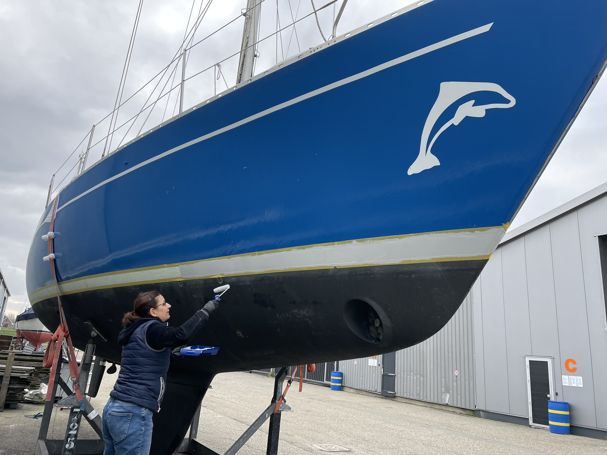 Dann hatten wir noch ein paar unschöne Macken an den Seiten. Zum Glück war noch etwas von der blauen Farbe vom letzten Anstrich übrig mit der die ausgebessert werden konnten. Eine ging tragischerweise mitten durch den Delfin, ist aber fast wieder behoben (Das Weiß kommt nächste Woche dran).