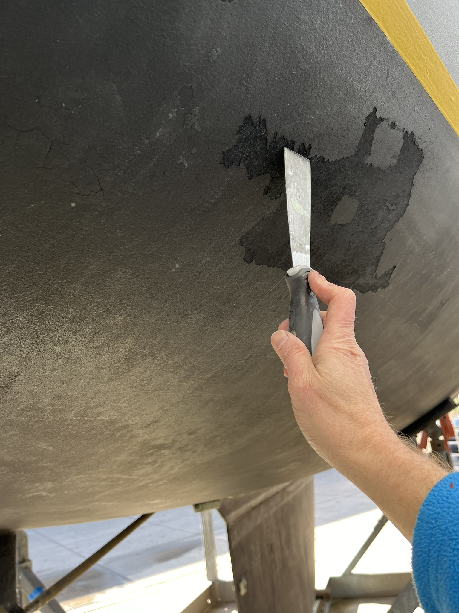 Etwas schwieriger ist eine Woche später das Unterwasserschiff selber. Der alte Belag ist nicht mehr im besten Zustand und blättert an einigen Stellen ordentlich ab. Das ist nicht grundsätzlich schlimm. Man kratzt es mit einem Spachtel ab und schleift danach mit der Hand kräftig nach, damit die Übergänge glatt werden. In diesem Fall ist es aber schon grenzwertig. Wir werden in den nächsten 1-2 Jahren das Boot aus dem Wasser holen müssen, und vor dem Anstrich den Rumpf einmal komplett abschleifen.