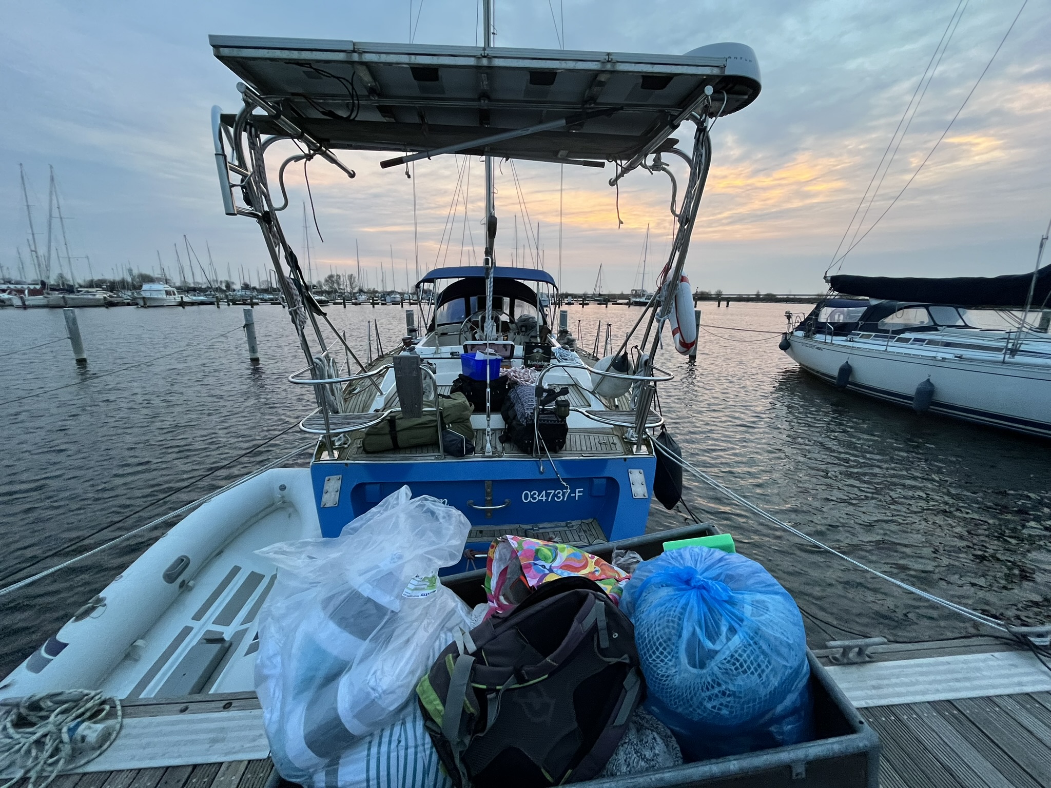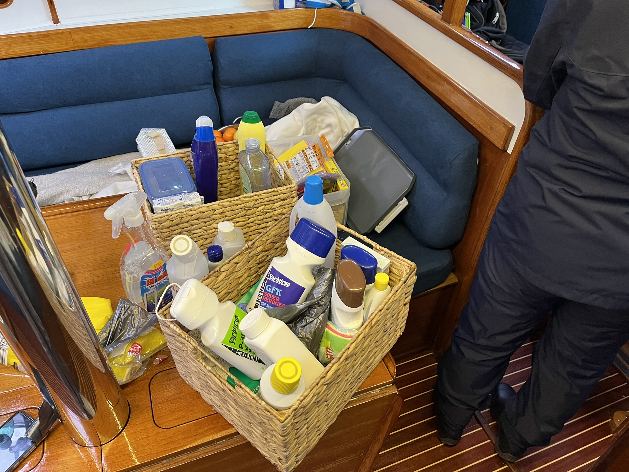 Als erstes werden die Wassertanks, die Küche und die Bäder gereinigt. Dann die Leitungen alle vom Frostschutzmittel freispülen und noch die Sachen an Bord schleppen und soweit es geht auspacken. Das Dinghi heben wir vom Vorderdeck ins Wasser um mehr Licht nach innen zu bekommen.