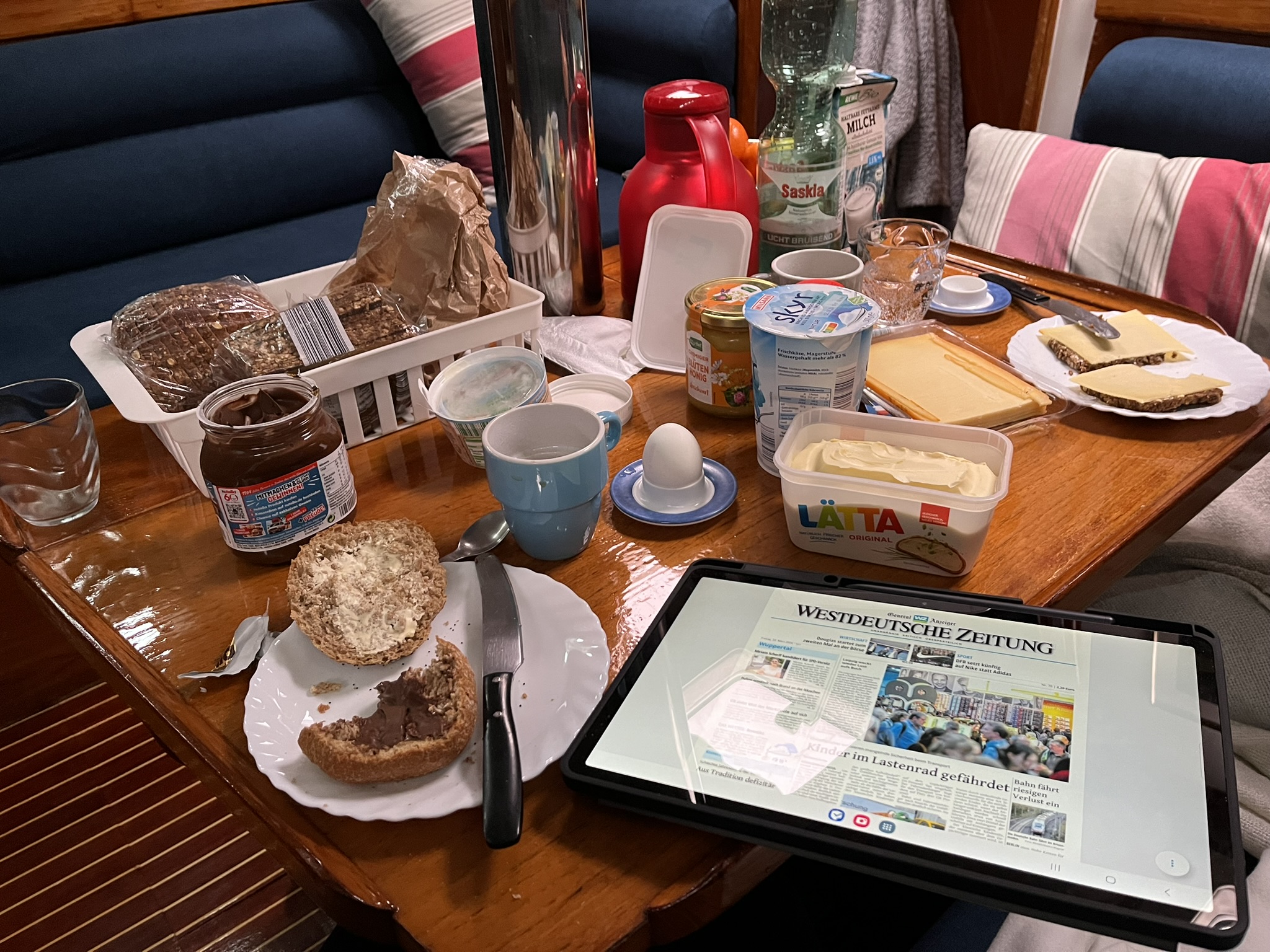 Hürde Nummer 3 klappte dann nicht so gut. Der Motor startet ohne mit der Wimper zu zucken aber das Bugstrahlruder funktioniert nicht obwohl der Elektriker neue Kabel ins Cockpit gezogen hat. Ohne Bugstrahlruder bei dem Wind einparken bringt es nicht, da sind Schäden an den ohnehin schon ramponierten Seitenwänden vorprogrammiert. Zum Glück finden wir den Elektriker der auf Fehlersuche geht. Nach einiger Zeit findet er eine defekte Sicherung und ein Kontakt in dem Gewirr ist auch lose. Na also Hürde 3 ist auch genommen. Die letzte Hürde ist dann unser Einparkmanöver (man kommt irgendwie schnell aus der Übung) welches auch ohne Hilfe einwandfrei hinhaut. Wir stehen rückwärts am Steg und sind echt froh. Auch die elementaren Dinge wie Kühlschrank und die Heizung funktionieren auf Anhieb.