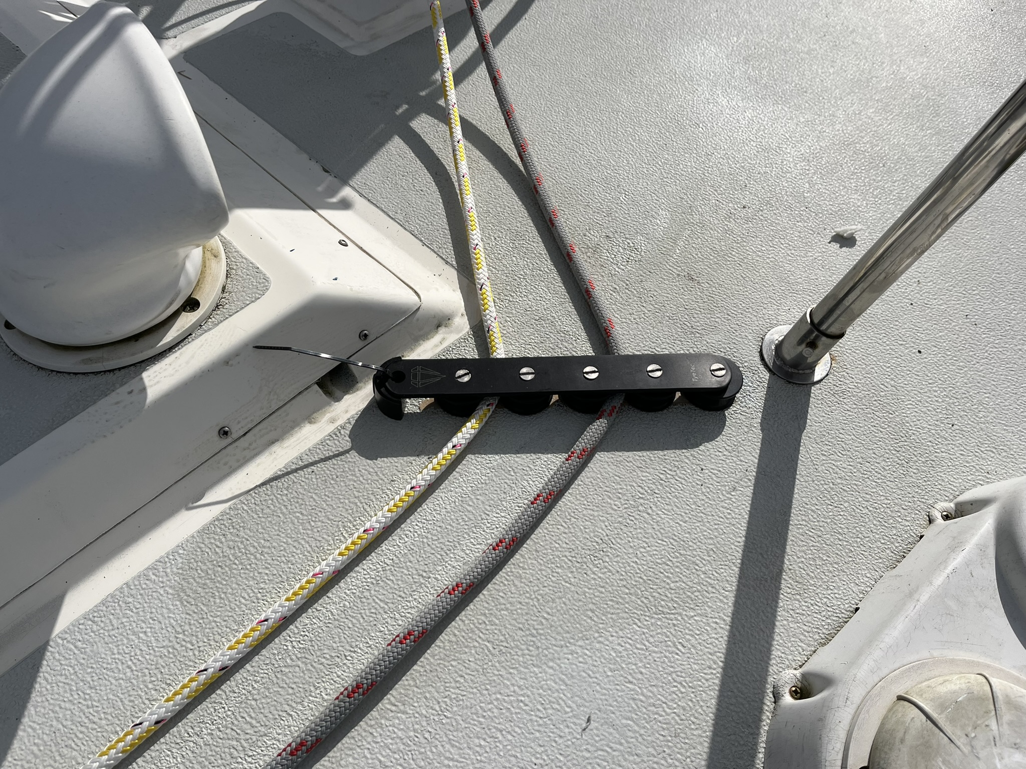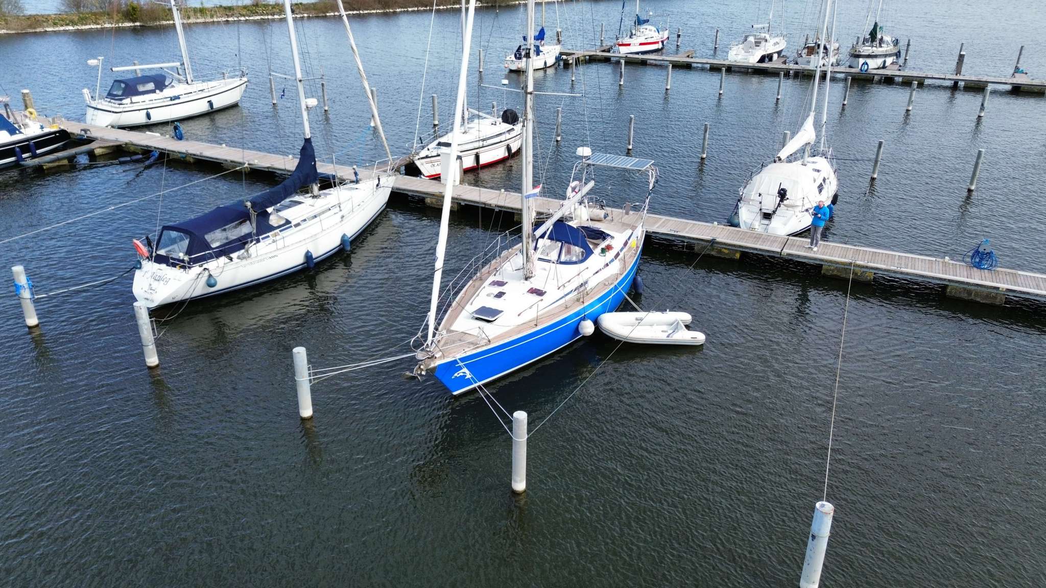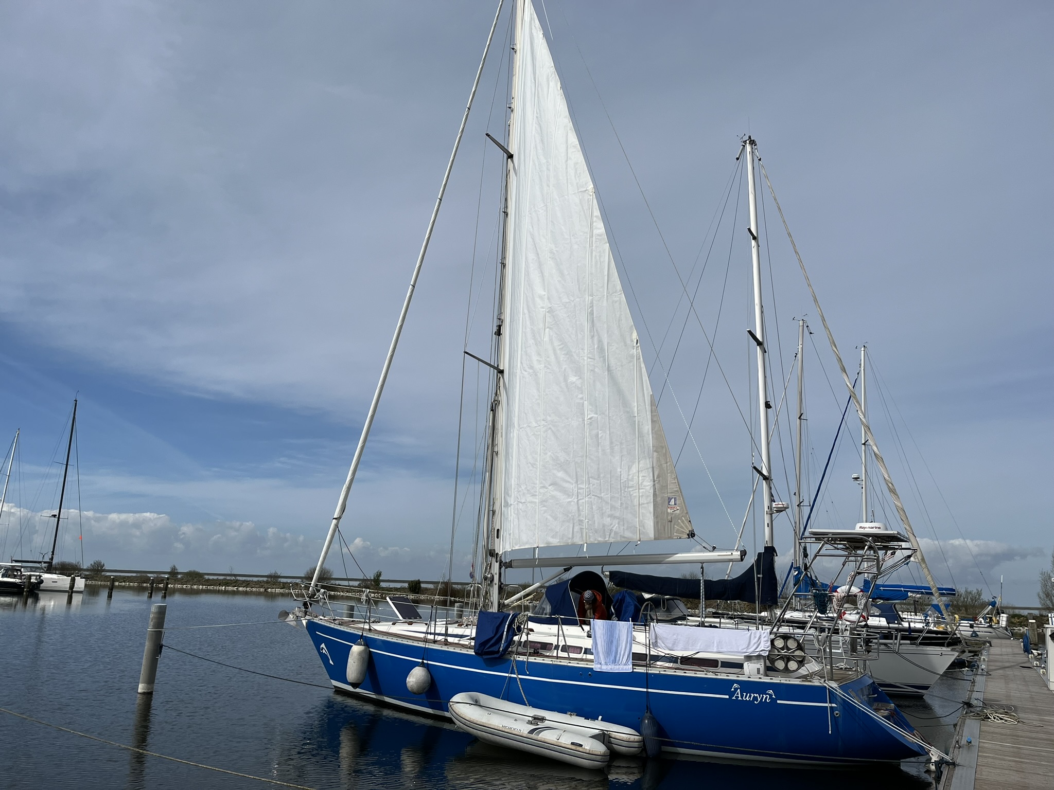 Dann ziehen wir ein paar neue Schoten für den Großbaum, die Genua, den Niederholer und die Dirk ein. Damit werden anschließend die Segel wieder hochgezogen. Gerade beim Großsegel ist das wegen den Längslatten eine etwas aufwändigere Geschichte. Wir haben aber Übung aus den letzten Jahren. Ein paar andere Seile am Heck wurden in der Waschmaschine einfach mal mit gewaschen und sehen danach wieder erstaunlich gut aus.