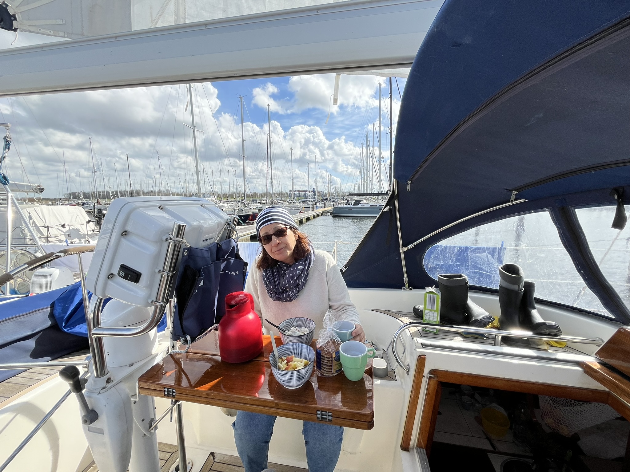 Kalt ist es an Bord und die Luftfeuchtigkeit vor allem morgens entsprechend hoch. Zum Glück haben wir letztes Jahr eine gute Dieselheizung einbauen lassen, damit ist es in einer halben Stunde muckelig warm. Inzwischen sind die Putzereien innen und außen abgeschlossen. Wir haben in Windboen von 5-6 Bft. und diversen Regenschauern auf den Knien stundenlang mit der Bürste die Planken und das Deck gebürstet. Das Deck glänzt wieder wie neu (na ja nicht ganz, ist ja schon über 30 Jahre alt), aber im Vergleich zu vorher eine neue Welt.