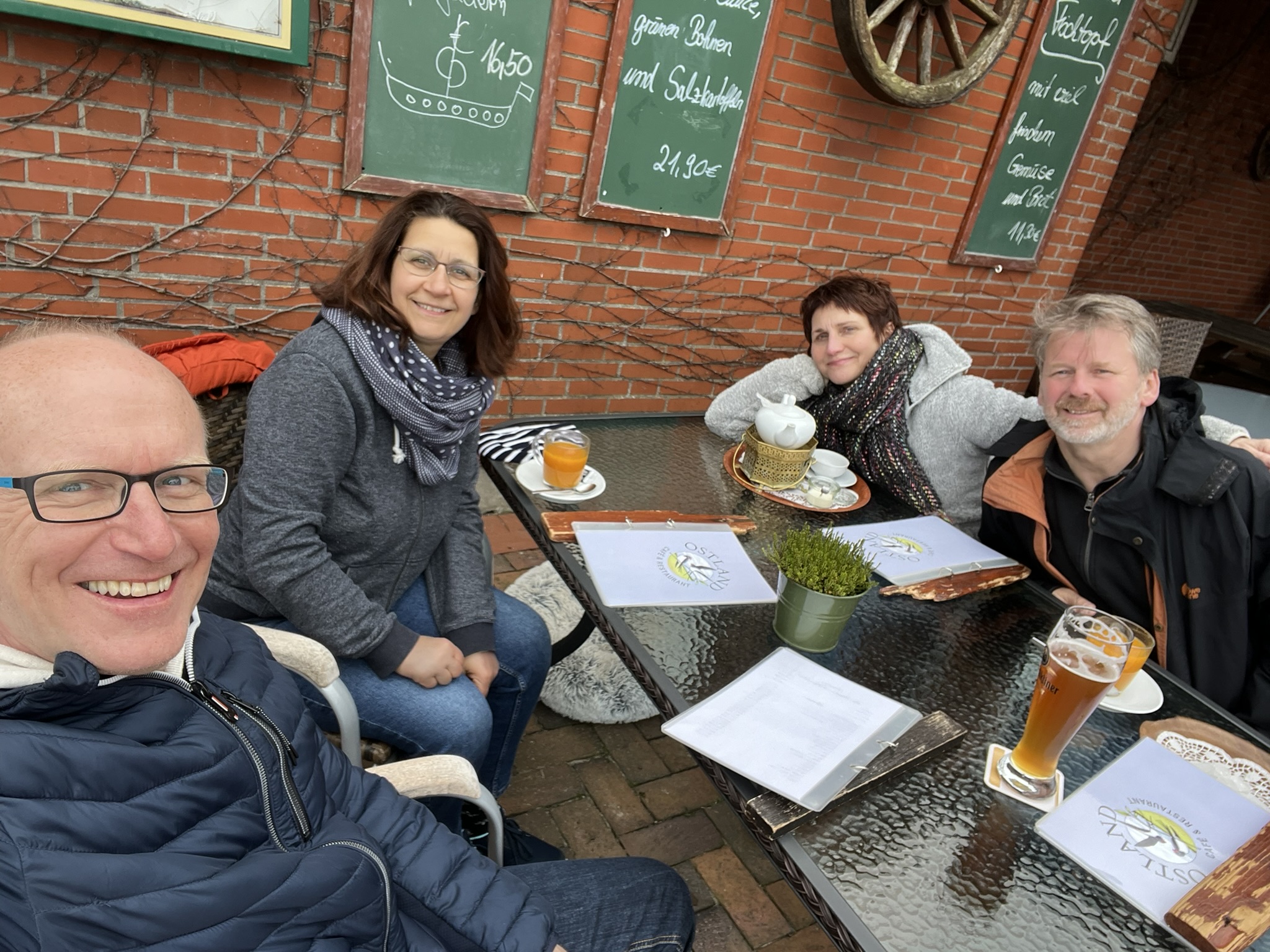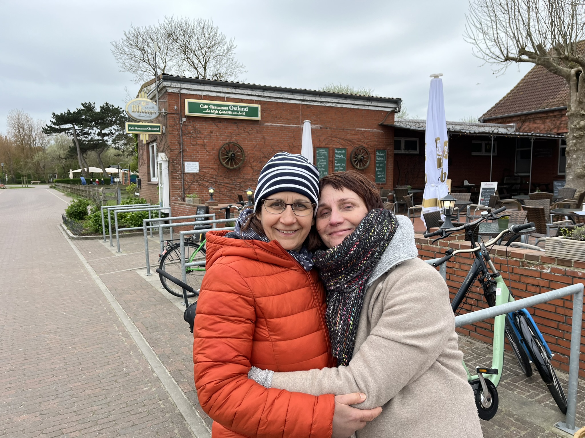 Am nächsten Morgen gibt es eine sehr freudige Überraschung. Unsere Freunde Dani und Willi sind auch auf Borkum und kurz danach sind sie an Bord zu Besuch und wir trinken Kaffee. Da die beiden mit den Rad hier sind, leihen wir uns spontan auch welche aus und bekommen die Insel gezeigt. Wir fahren durch die Naturschutzgebiete in den Osten der Insel und staunen über die unglaublich vielen Vögel in einer tollen Landschaft. Hier scheint die Welt noch in Ordnung zu sein. Am späten Nachmittag geht es dann noch in den Hauptort und zu der Seehundbank „Hohes Riff“. Die Seehunde sind anscheinend gerade woanders, schön ist es trotzdem. Wir waren beide entweder nur als kleine Kinder bzw. noch nie hier, sind aber von der Insel sehr angetan.