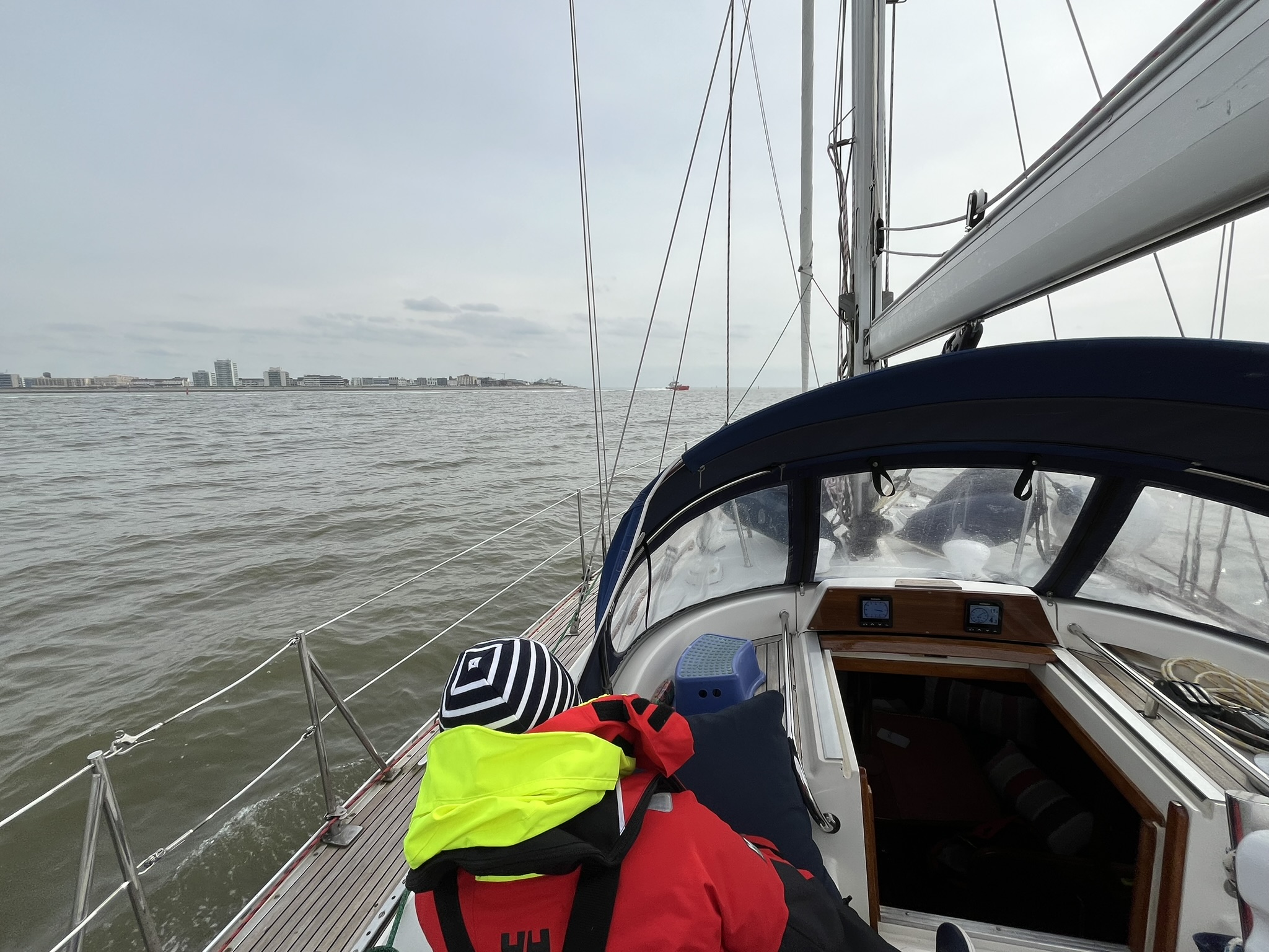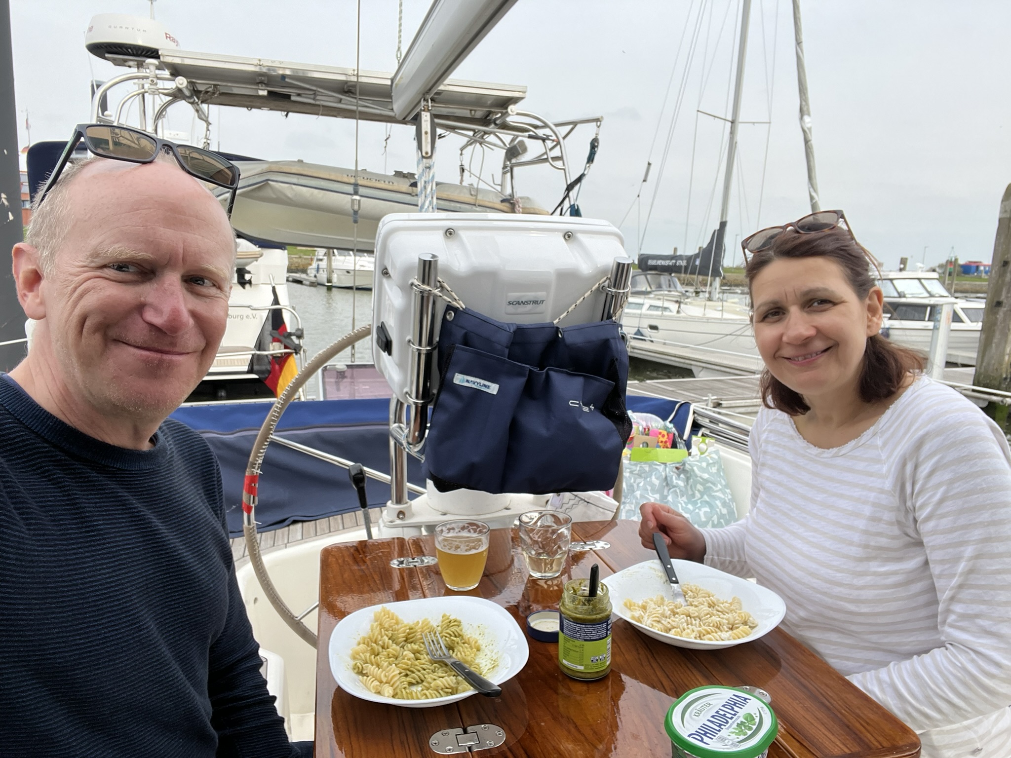 Die Strecke von Borkum nach Norderney war etwa 35sm lang, und wir mussten auf Grund einiger Flachstücke im Nordwesten von Borkum einen Umweg fahren um gut von der Insel wegzukommen. Der Wind versprach diesmal wohlwollend zu sein, was er auch eingehalten hat. Auch die See war deutlich angenehmer als beim Trip davor, so dass es am Ende ein sehr schöner Segeltag war. Die Kunst war diesmal zur Hochwasserzeit in Norderney anzukommen, weil die Anfahrt durch das Schluchter Fahrwasser für unsere Tiefe bei Niedrigwasser zu flach ist. Passte aber auch gut, weil das Hochwasser für den Nachmittag berechnet war. Der Hafen hier ist 2km außerhalb des Hauptortes und wir machen uns direkt auf, ein paar Einkäufe zu tätigen und den Ort anzuschauen. Sogar ein Snack im Cockpit ist noch drin.