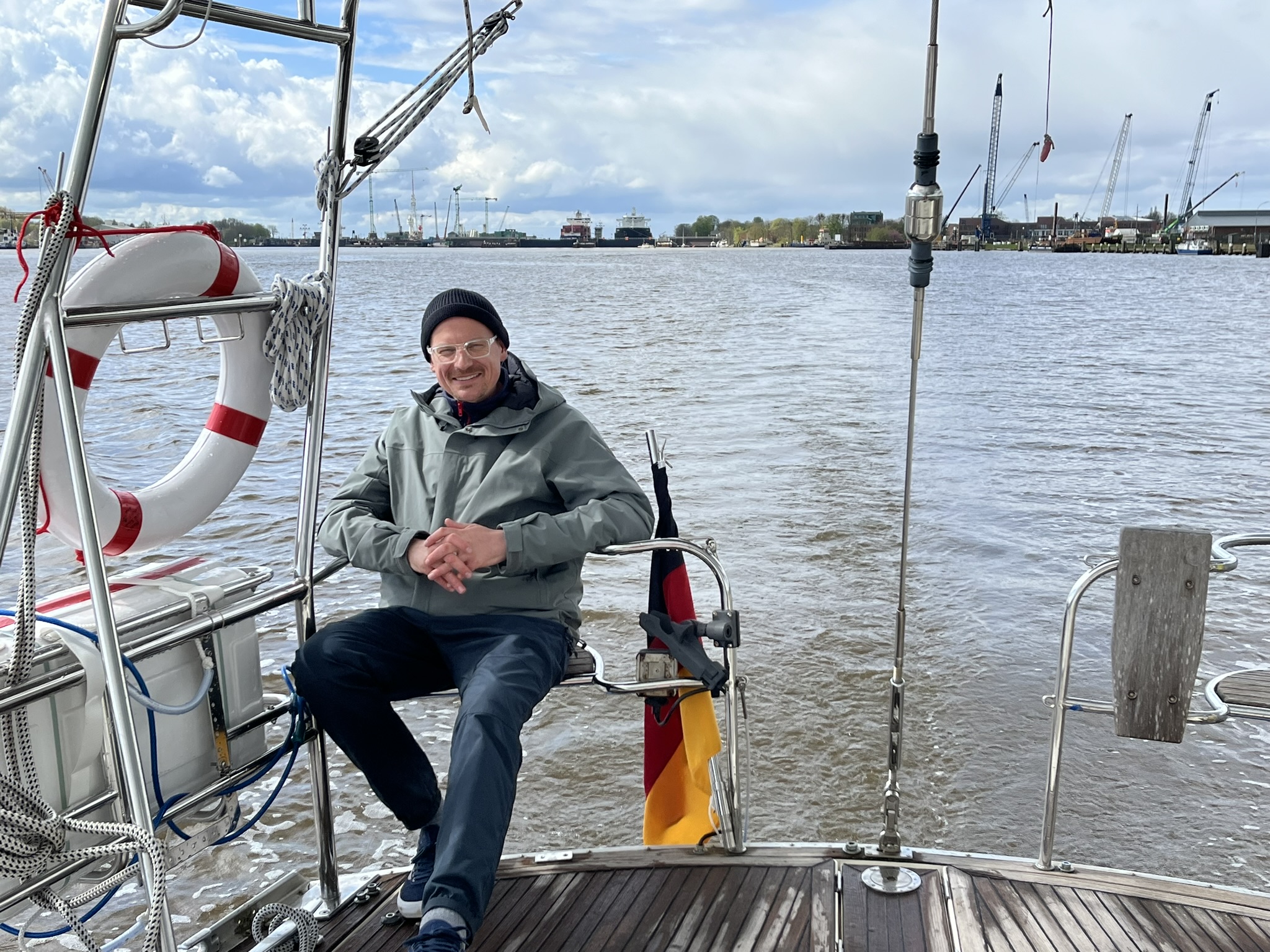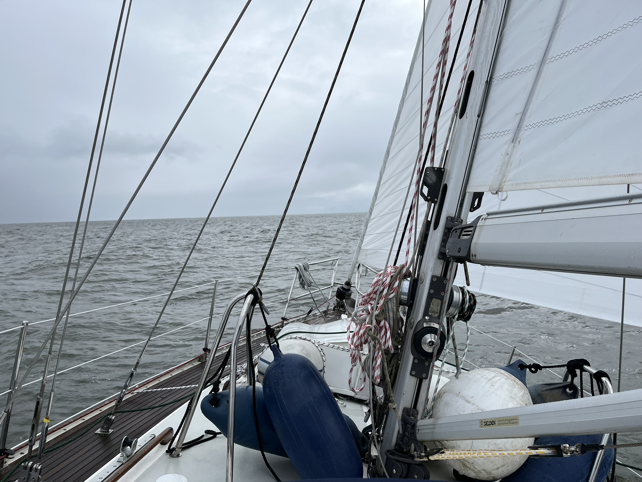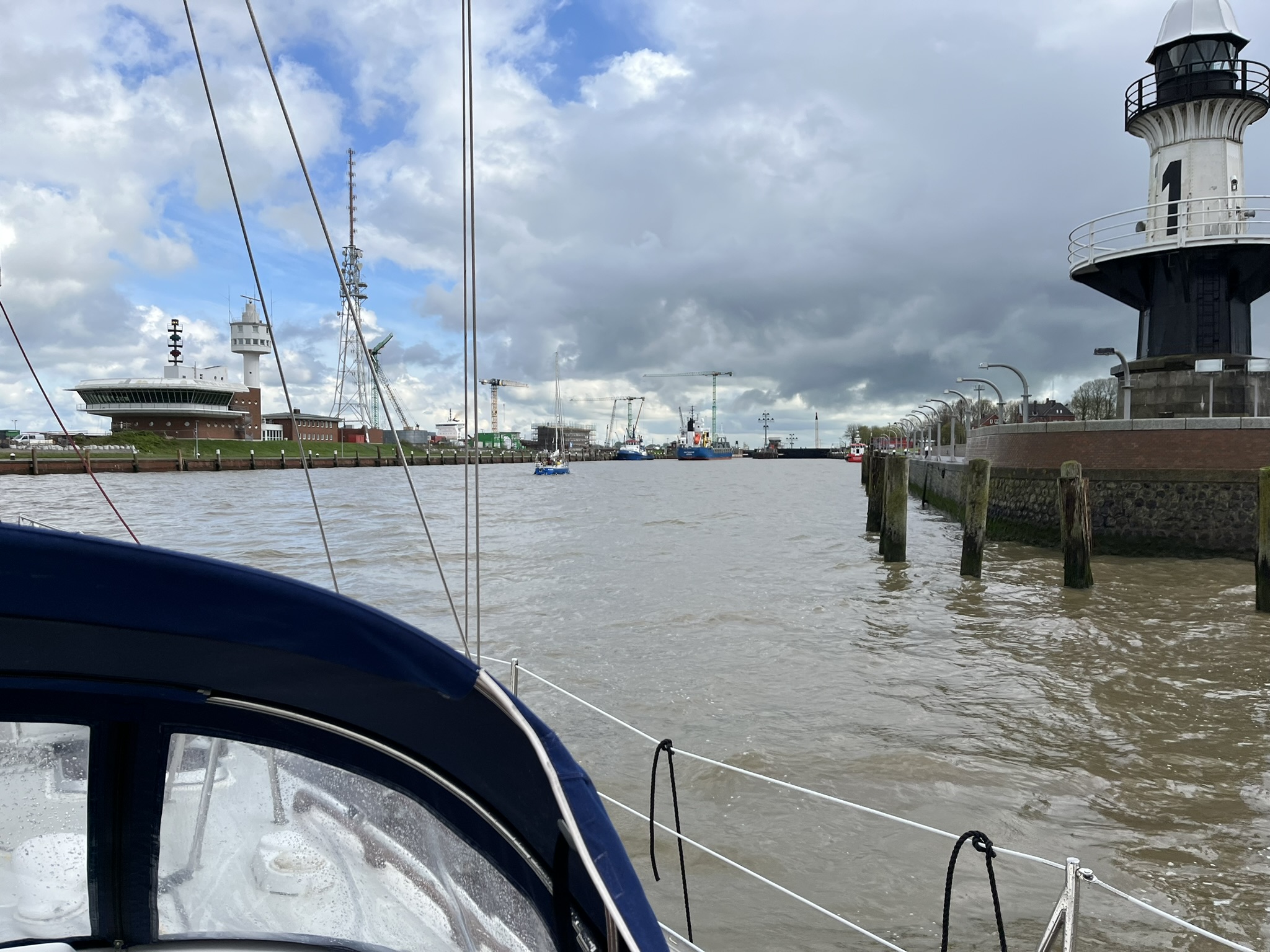 Um diesen letzten Abschnitt zu vollenden, müssen wir erstmal Norderney durch das Dove Fahrwasser verlassen. An diesem Tag ist immerhin günstiges Hochwasser am frühen Morgen was uns eine Passage ermöglicht. Wir stehen also um 05.00 auf und verlassen den Hafen kurz nach 06.00 mit dem ersten Licht am Morgen. Es wird ein sehr langer Tag, wir planen bis Cuxhaven zu kommen was ein Strecke von über 64sm sind, für die wir 13-14h einplanen. Als Abschiedsgruß gibt es von unserer Nordsee noch fieses, kaltes Schietwetter mit Regen und wenig Wind. Wir tuckern erstmal einige Stunden bis dann plötzlich Sonne und Wind kommen und es doch noch ein schöner Segeltag wird. Als Bonus haben wir auf dem Weg in die Mündung der Elbe den Strom mit uns der uns gute 3 Knoten zusätzliche Geschwindigkeit schenkt. Dadurch sind wir am Ende des Tages sogar noch etwas schneller als geplant und machen in Cuxhaven fest ohne groß das Boot zu verlassen. Wir sind groggy, essen noch was und schlafen früh.