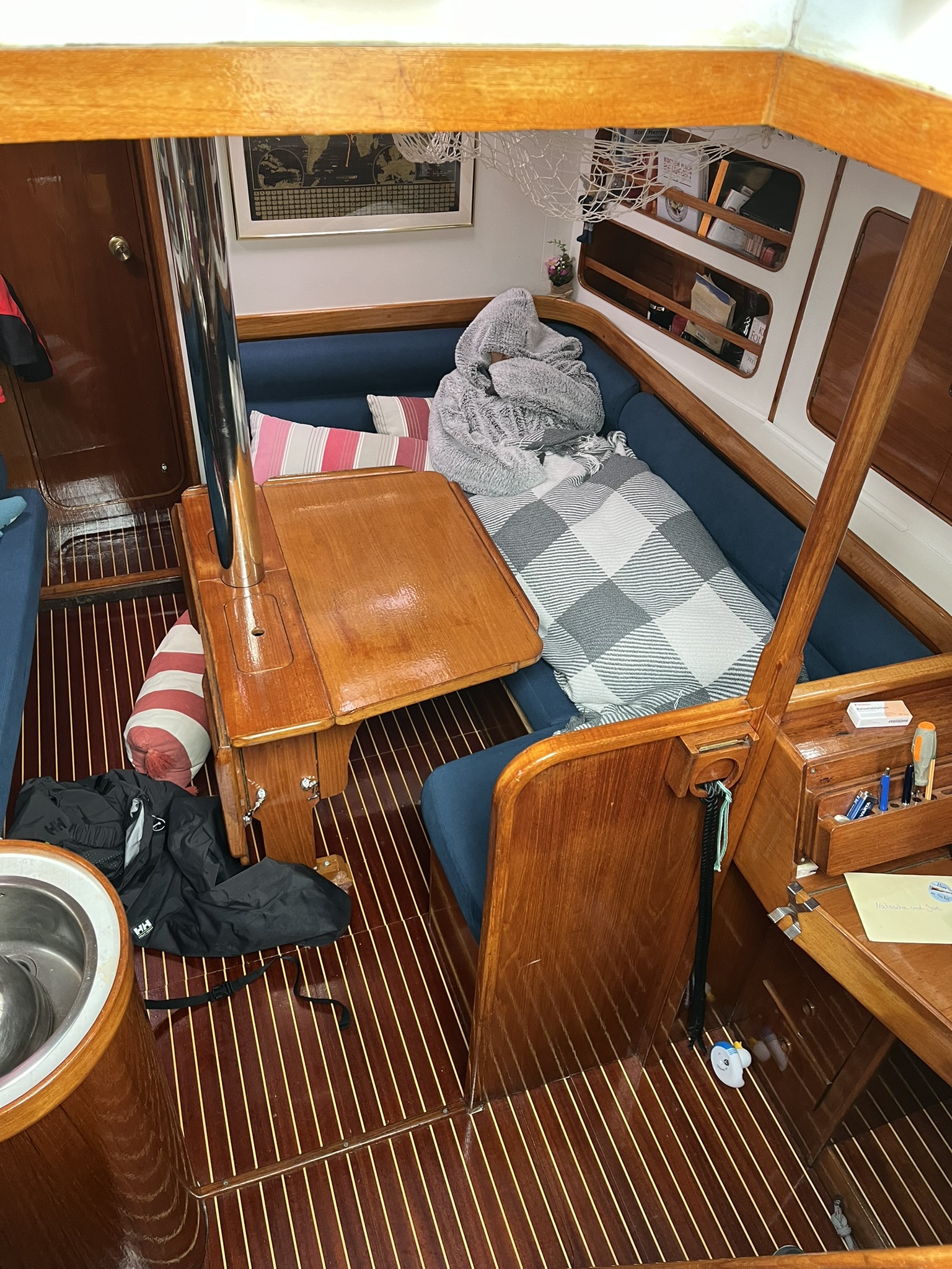 Wir machen am Abend einen Stopp in Rendsburg in einem kleinen Hafen und gehen noch in das nette Örtchen was trinken. Es scheint allerdings nur eine Kneipe hier zu geben die an einem verregneten Donnerstag offen hat. Und dann ist es am Freitag geschafft. Wir kommen gut durch die letzte Schleuse und sind in der Ostsee. Wir versuchen direkt auf der Kieler Förde nach der Diesel Orgie der letzten Tage mal etwas zu segeln, was aber wegen erst zu wenig und dann zu viel Wind schnell wieder scheitert. Egal, bald erreichen wir den kleinen Hafen in Strande, einem Örtchen 15km nördlich von Kiel. Hier gefällt es uns und wir werden ein paar Tage bleiben. Bens Freundin Melanie kommt auch noch für einen Tag vorbei und wir nutzen dreist am Samstag ihr Auto um bei SVB (Yachtausrüster) und bei Lidl die Vorräte aufzustocken. Da wir uns bald nach Skandinavien aufmachen, sollten wir wegen den höheren Preisen dort möglichst viel gebunkert haben.