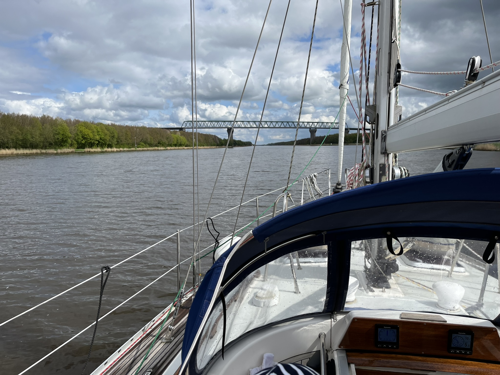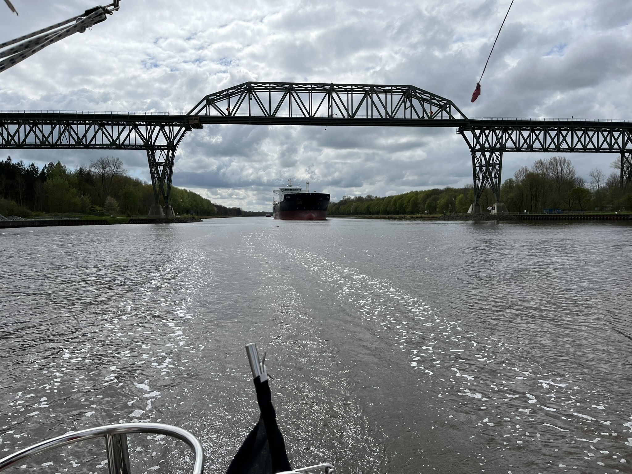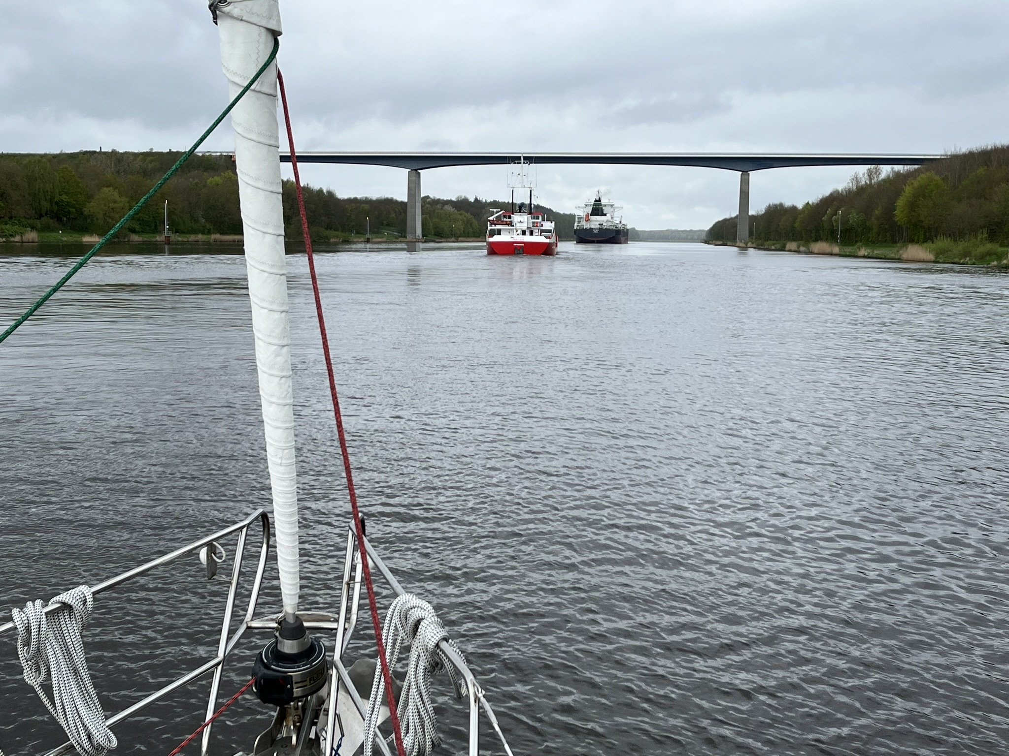 Auf der anderen Seite der Schleuse wartet schon mein Bruder Ben der uns durch den Kanal begleiten wird. Er wohnt hier oben im Norden und lässt sich so eine Gelegenheit nicht entgehen. Der NOK ist insgesamt 98 Kilometer lang und bringt den Schiffen den großen Vorteil, nicht oben über das Skagerrak fahren zu müssen wenn man von einem in das andere Meer möchte. Insgesamt ist die Passage relativ unspektakulär, es sind viel weniger von den großen Schiffen unterwegs als gedacht. Und wenn die einen überholen ist immer genug Platz da. Segeln darf man allerdings nicht, obwohl das bei dem Wind oft gut geklappt hätte. Die Landschaft ist schön und man sieht viele Vögel, wie immer wenn es durch solche Kanäle geht, von denen wir aus Holland schon einige hinter uns haben. In Holland mussten allerdings die Brücken meistens für uns öffnen, während hier auf dem NOK alle über 40m hoch sind.