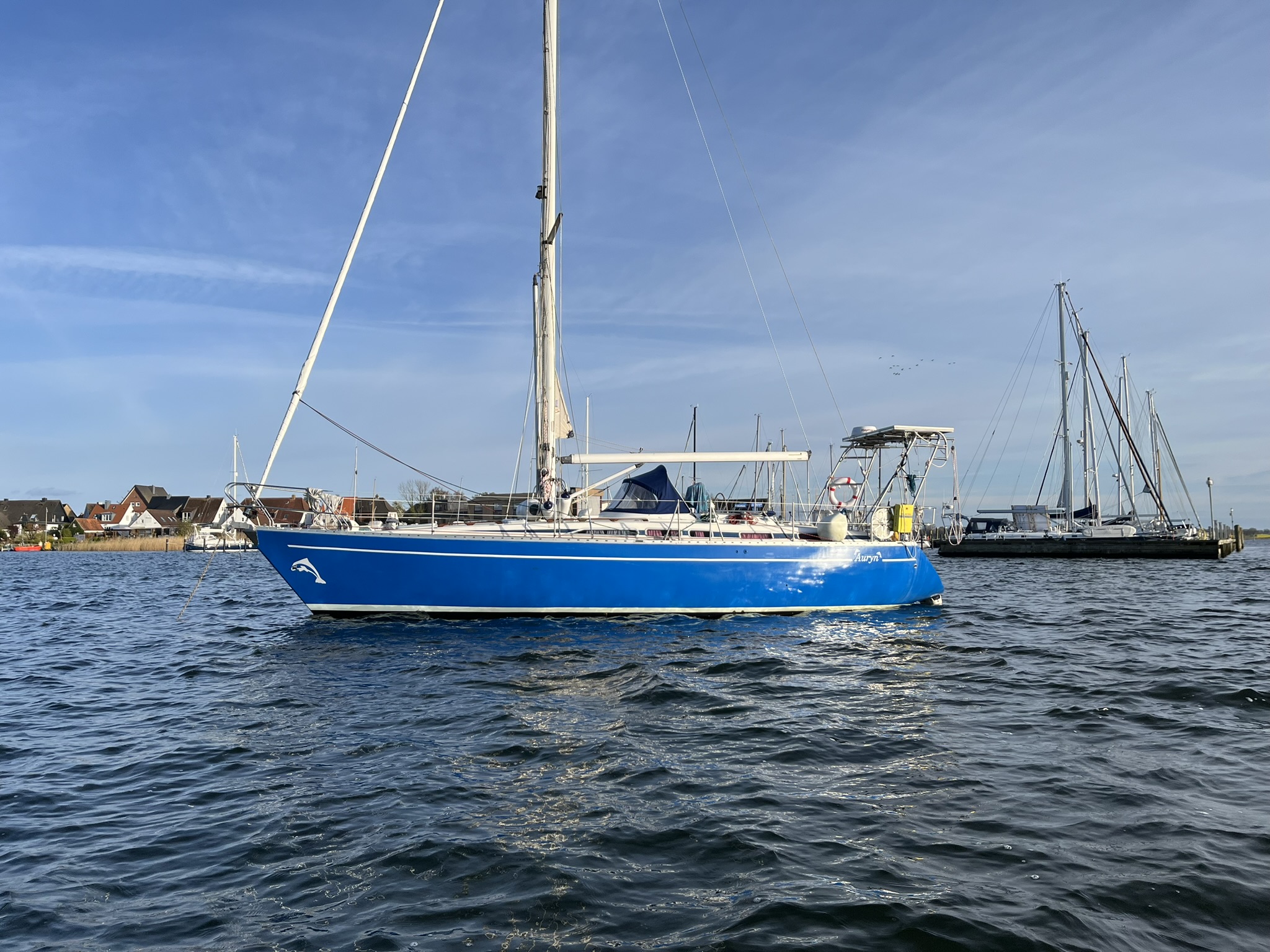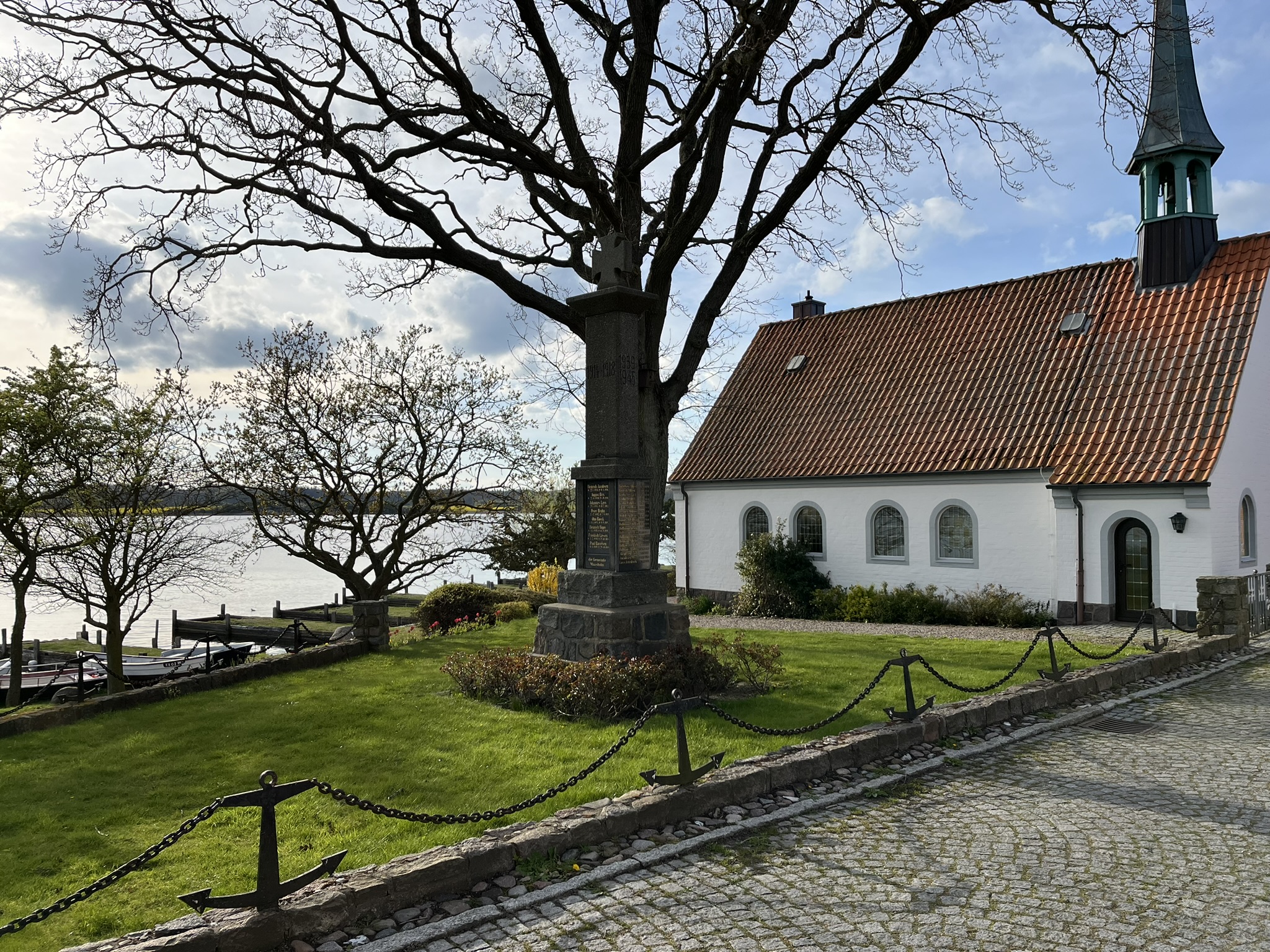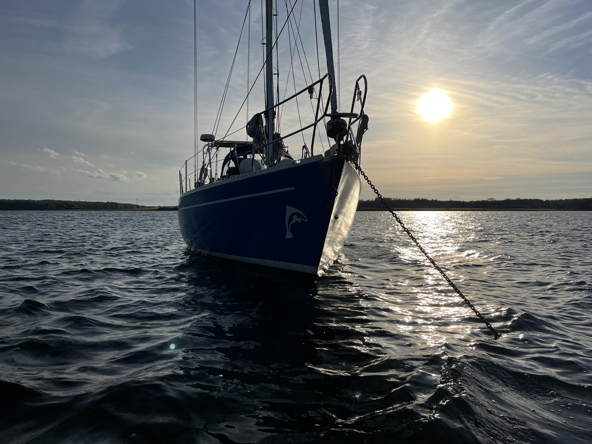 Nachdem wir die Kieler Bucht hinter uns gelassen haben, stellen wir schnell fest, dass wir es in einem Rutsch nach Dänemark hoch nicht schaffen werden. Der Wind war mit 4-5Bft nicht schlecht kam aber etwas zu weit von vorne. Das machte aber nichts, wir hatten einen Ort als Zwischenstation auf dem Zettel mit einer sehr schönen Ankerbucht. Maasholm liegt in der Schlei, was ein im Sommer sehr bekanntes Segelrevier direkt unterhalb von Dänemark ist. Wir hatten kurz vor der Schlei übrigens einen kleinen Seehund hinter uns als Begleitung, aber der Schlingel ist wieder verschwunden bevor wir die Handys zücken konnten. In der Bucht hinter Maasholm haben wir auf dieser Tour zum ersten Mal den Anker geworfen, was nach anfänglicher Fummelei mit der Kette auch ganz gut geklappt hat. Schnell unser frisch geflicktes Beiboot fertig gemacht und mit dem wunderbaren kleinen Elektro Außenborder an Land gefahren. Der Ort ist ein wenig pittoresk und es war fast kein Mensch auf der Straße. So war der Ausflug auch bald wieder zu Ende. Im Sommer geht es hier wahrscheinlich anders ab. Dafür gab es ein kleines Auryn Fotoshooting vom Beiboot aus.