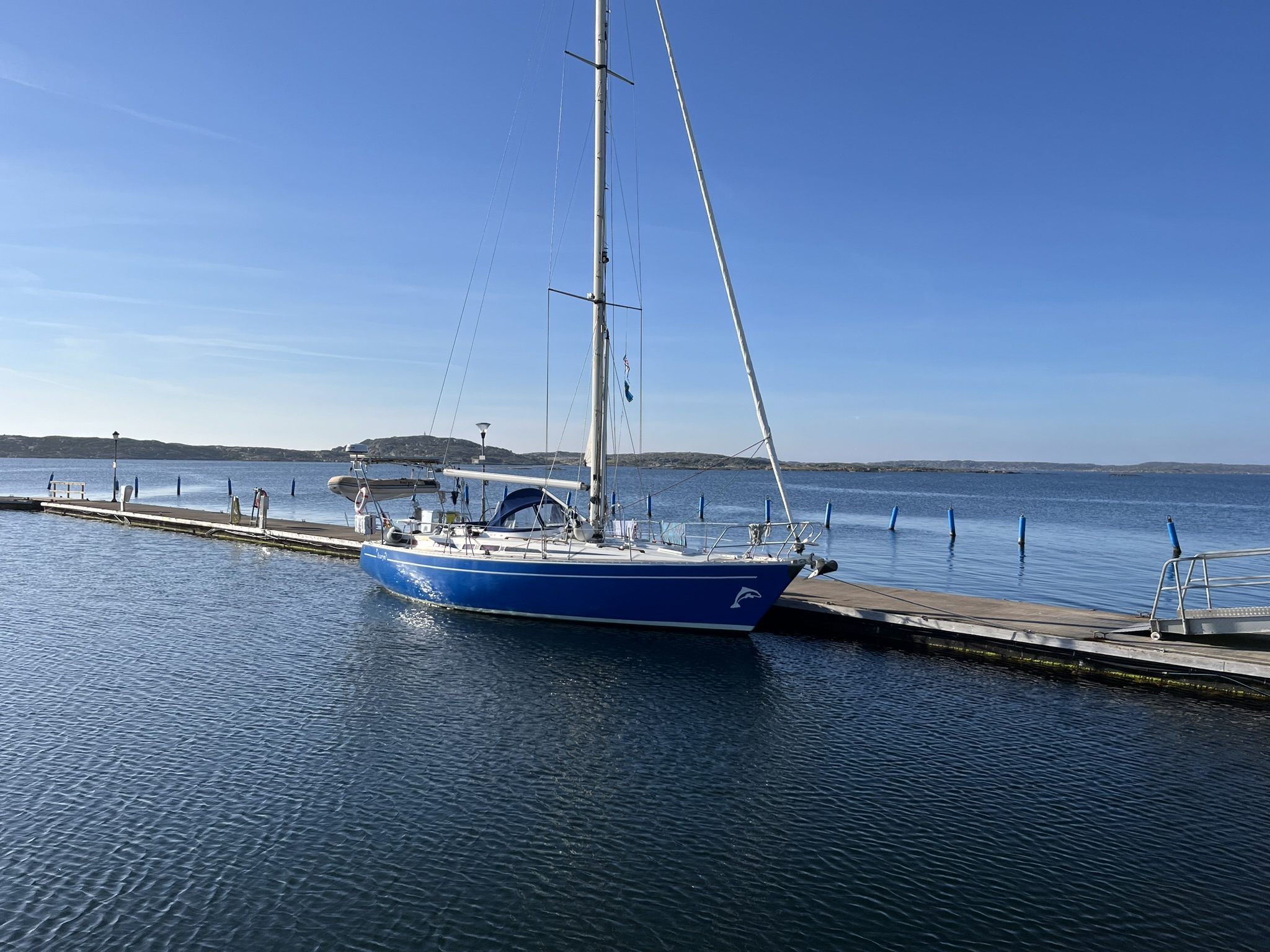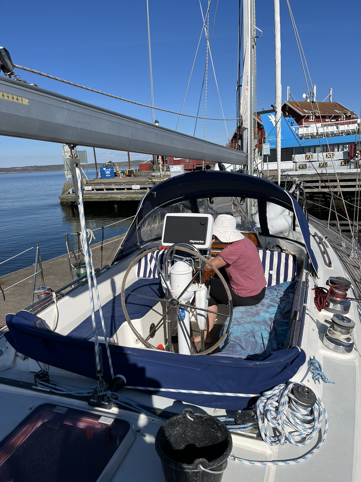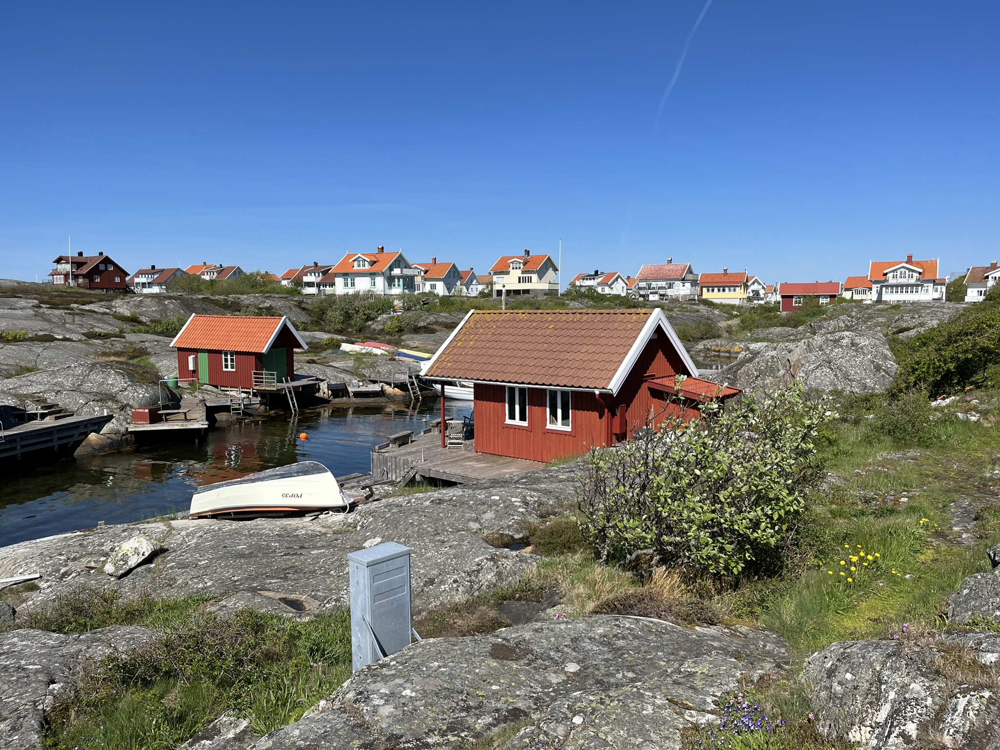Als nächstes Ziel wurde uns die Insel Käringön ans Herz gelegt. Diese ist knapp 4h segeln weiter nördlich und soll in Vielem den typischen Schwedenklischees mit roten schicken Holzhäusern, kleinen Häfen und natürlich den Schärenfelsen entsprechen. Hinzu kommt noch, dass sich das Hoch über Skandinavien endgültig festgesetzt hat und die nächsten 2 Wochen über 20° verspricht. Was will man denn eigentlich noch. Auf der Insel leben permanent etwa 80 Menschen und es gibt ein paar Restaurants, eine Kneipe und einen Supermarkt. Als wir nach einem sehr gemütlichen Segeltag im kleinen Hafen ankommen sind hier nur noch zwei andere Boote. Funktionierende Infrastruktur gibt es auch nicht wirklich, geschweige denn einen Hafenmeister. Es ist halt noch Nebensaison, auch hier soll in einem Monat deutlich mehr los sein. Aber ansonsten stimmen die Klischees. Eine erste Besonderheit entdecken wir nach der Ankunft, es ist der Supermarkt. Er hat 24/7 offen und ab Abends gibt es keine Angestellten mehr vor Ort. Man muss an Selbstbedienungskassen bezahlen und es wird anscheinend vertraut, dass man das auch tut.