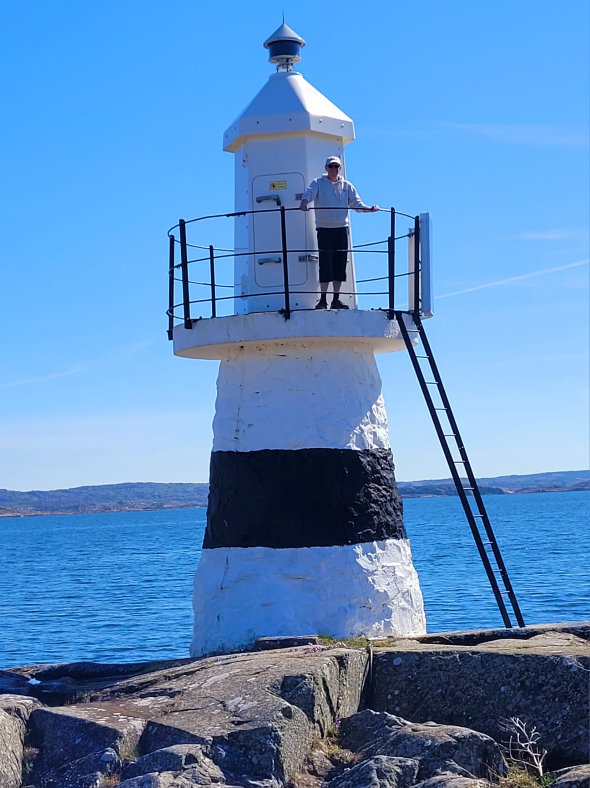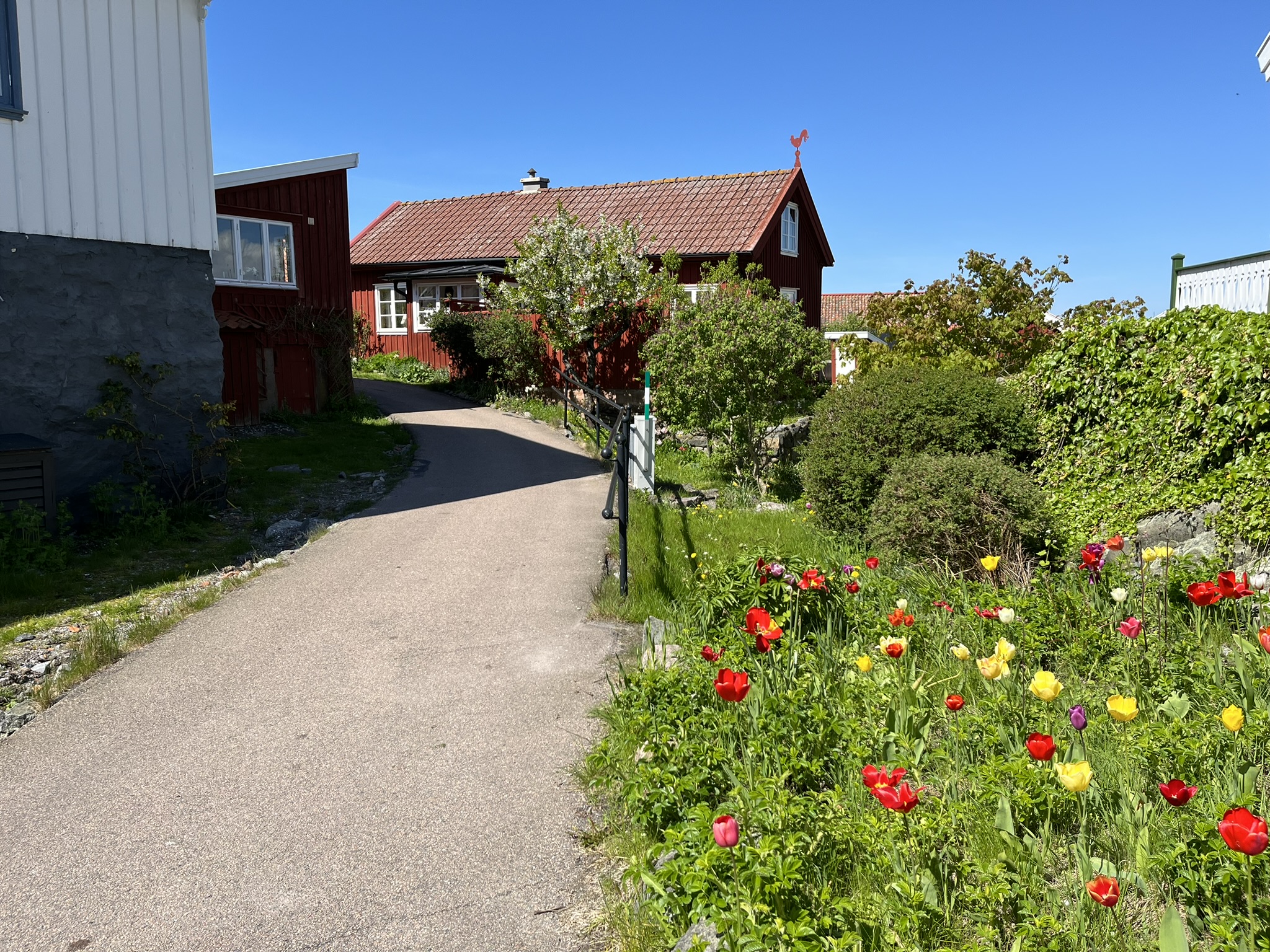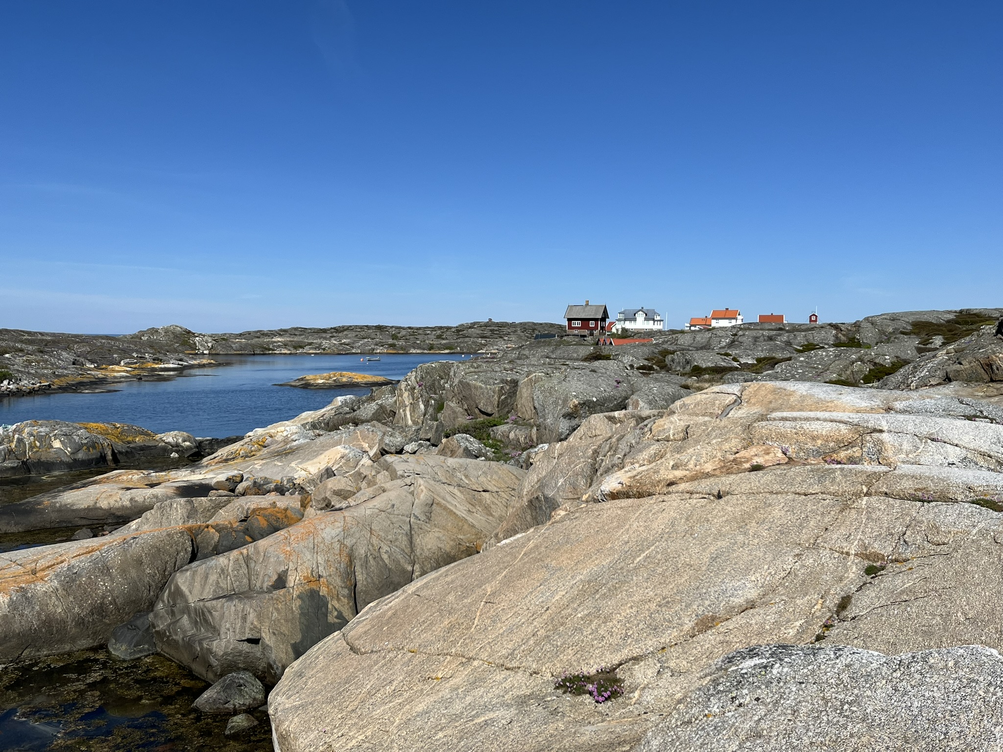 Als nächstes Ziel wurde uns die Insel Käringön ans Herz gelegt. Diese ist knapp 4h segeln weiter nördlich und soll in Vielem den typischen Schwedenklischees mit roten schicken Holzhäusern, kleinen Häfen und natürlich den Schärenfelsen entsprechen. Hinzu kommt noch, dass sich das Hoch über Skandinavien endgültig festgesetzt hat und die nächsten 2 Wochen über 20° verspricht. Was will man denn eigentlich noch. Auf der Insel leben permanent etwa 80 Menschen und es gibt ein paar Restaurants, eine Kneipe und einen Supermarkt. Als wir nach einem sehr gemütlichen Segeltag im kleinen Hafen ankommen sind hier nur noch zwei andere Boote. Funktionierende Infrastruktur gibt es auch nicht wirklich, geschweige denn einen Hafenmeister. Es ist halt noch Nebensaison, auch hier soll in einem Monat deutlich mehr los sein. Aber ansonsten stimmen die Klischees. Eine erste Besonderheit entdecken wir nach der Ankunft, es ist der Supermarkt. Er hat 24/7 offen und ab Abends gibt es keine Angestellten mehr vor Ort. Man muss an Selbstbedienungskassen bezahlen und es wird anscheinend vertraut, dass man das auch tut.