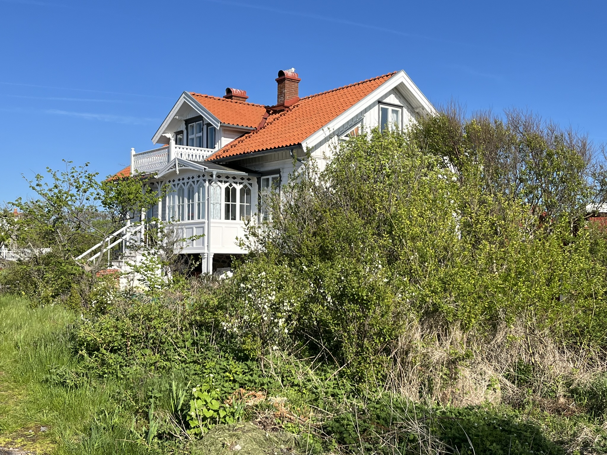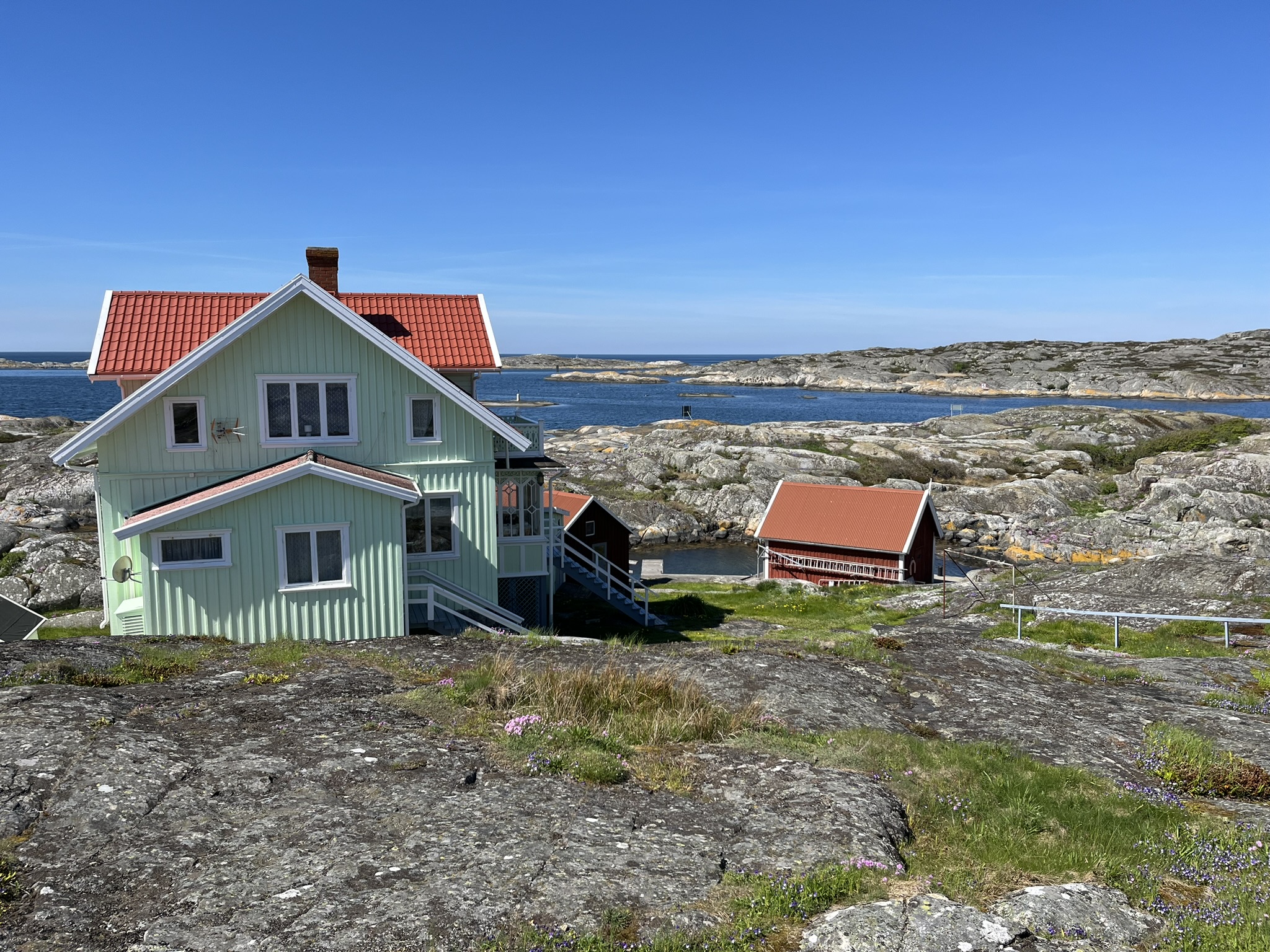 Wir machen am nächsten Tag eine tolle Wanderung um die Insel herum. Der Ort besteht aus weit mehr Häusern, als für die 80 Einwohner. Das meiste scheinen Ferienhäuser zu sein, da sie zu diesem Zeitpunkt des Jahres noch verlassen sind. Diese sind ziemlich durcheinander über die Insel verstreut und über viele kleine Wege miteinander verbunden, Autos gibt es nicht. Viele erinnern an Pipis Villa Kunterbunt nur in schicker und besser erhalten. Alle haben aber die typischen Holzfassaden und neben dem Schwedenrot gibt es auch viele weiße und ein paar gelbe Häuser. Im Süden der Insel gibt es dann wieder die Schären über die man ganz entspannt klettern kann. An einigen Stellen sind auch nette Badeplätze mit Leitern und Liegeflächen eingerichtet. Die Schweden sind ja auch ein Volk des gut vorbereiteten Picknicks wie man allerorts sieht. Und daran nehmen wir uns ein Beispiel und haben uns auch entsprechendes eingepackt was wir auf einer Bank mit Ausblick genießen.