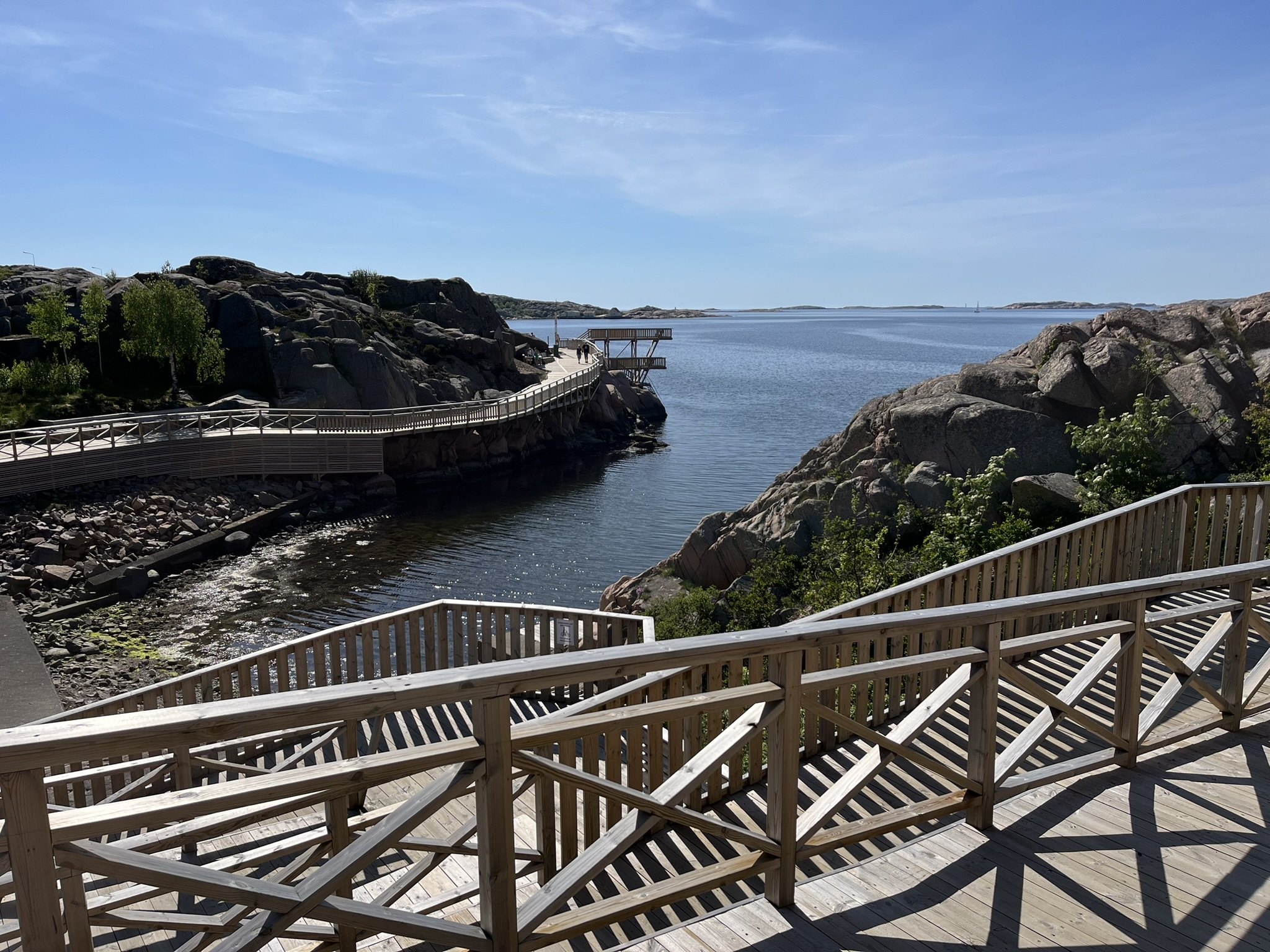 Das Städtchen Lysekil überrascht uns sehr positiv. Eigentlich ist es kein Hauptziel der Schwedensegler aber es gibt hier um die Stadt herum sehr schöne Ecken und Landschaften zu entdecken. Wir machen an beiden Tagen mehrere Spaziergänge, und entdecken zum Beispiel eine über 5km lange Promenade die um die ganze Halbinsel herumführt und komplett aus Holz gezimmert ist. Sie führt über die wunderbaren Schären die hier in der Gegend auffallend gelblich und rötlich leuchtend sind. Zwischendurch taucht immer wieder ein kleiner Hafen auf. Wie auch in den anderen Orten wo wir waren sind an den Stellen die ins Meer führen, auch immer wieder Einstiege ins Meer mit Liegeflächen davor. Hier könnte man es auch länger aushalten.