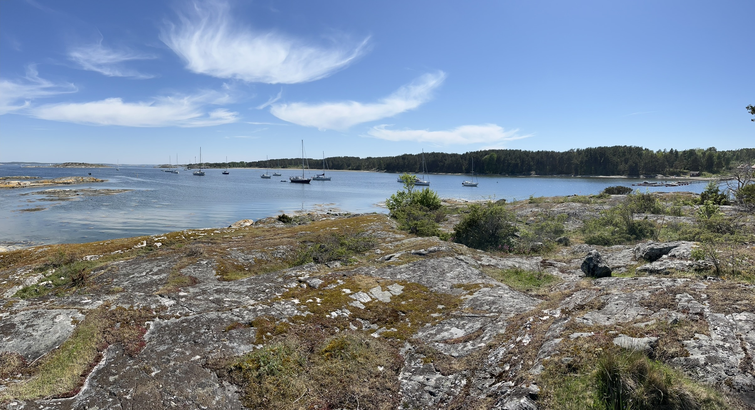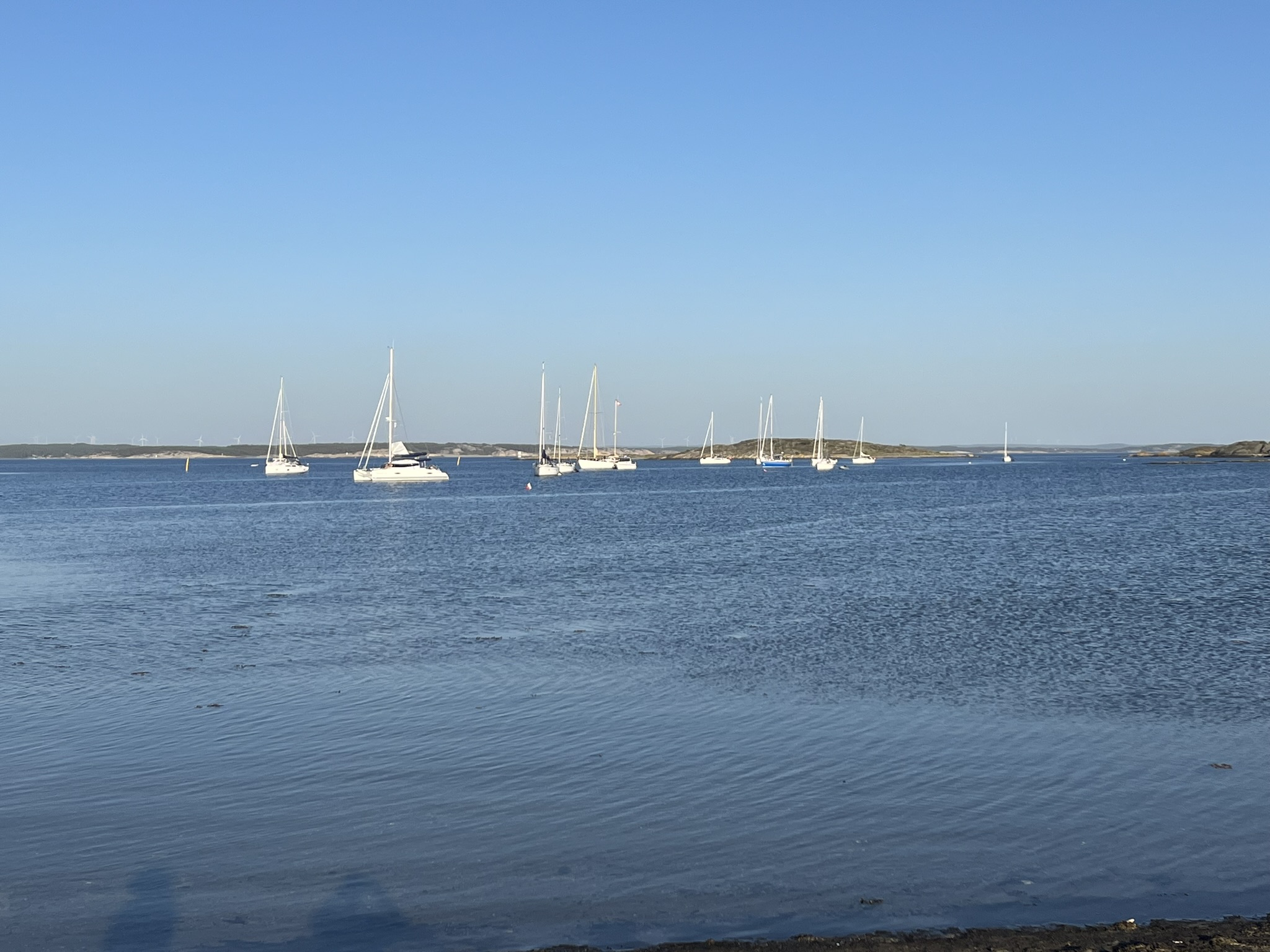 Unsere letzte Station der wunderschönen westschwedischen Gebiete ist der Kosterhavet Nationalpark kurz vor der norwegischen Grenze. Wir dümpeln uns am Ende etwas langsam aber stetig hier hinauf und kommen in einer sehr schönen Ankerbucht auf der Ostseite der Südinsel an. Der Anker fällt auf 5m Tiefe und sitzt im ersten Anlauf gut und sicher. Am Abend sind in der Bucht 13 Boote, die meisten davon aus Norwegen (dazu später noch mehr). Der Kosterhavet NP besteht aus einer Nord und einer Südinsel und ist auf der einen Seite ein geschütztes Gebiet und auf der anderen Seite haben wir mit den Wassersport und Badeaktivitäten kaum Einschränkungen gesehen. Insgesamt umfasst er 365 km2 also hauptsächlich die Wassergebiete. Es gibt hier sogar Kaltwasserkorallen die geschützt werden. Wir machen am Abend noch einen kleinen Spaziergang auf der Südinsel bis zum Hafen im Norden und gönnen uns danach etwas gediegen Fish & Chips in einem Strandrestaurant.