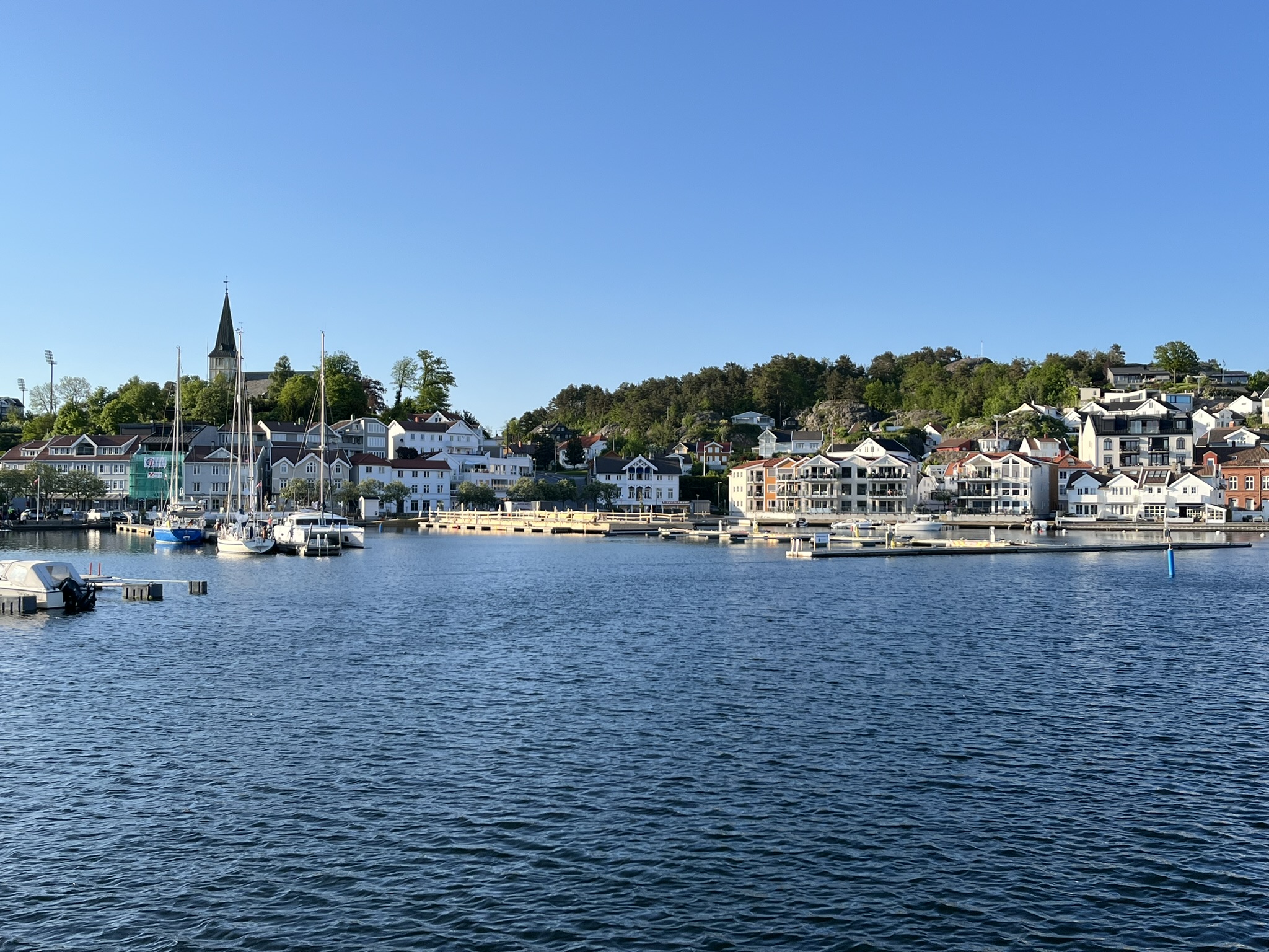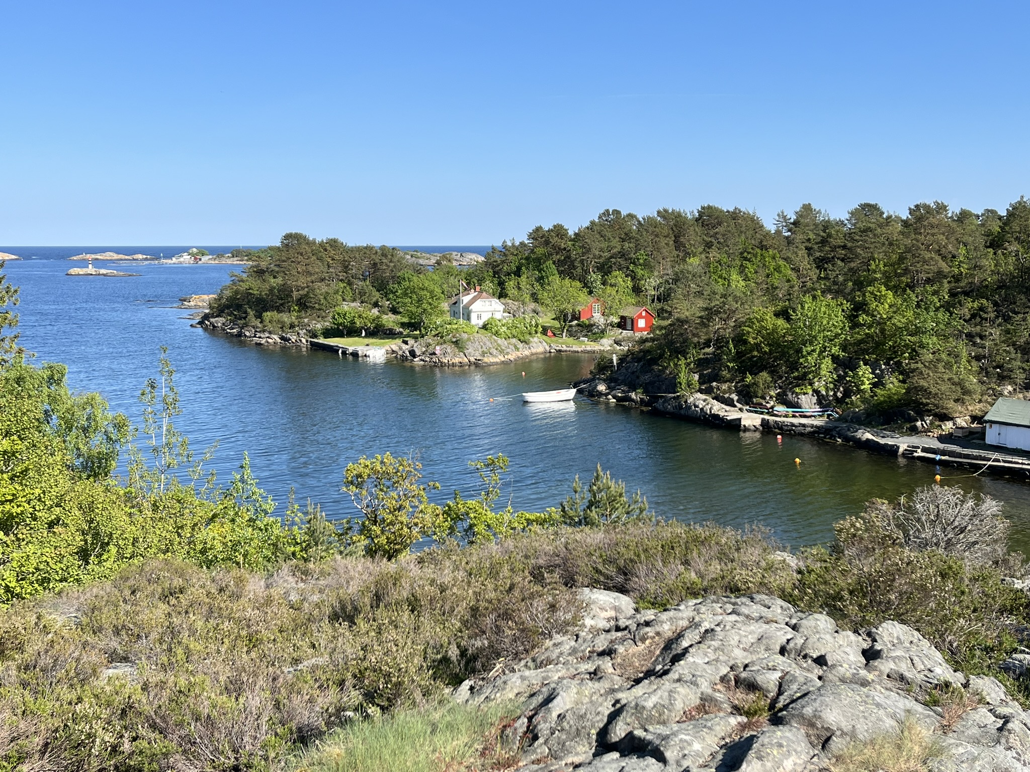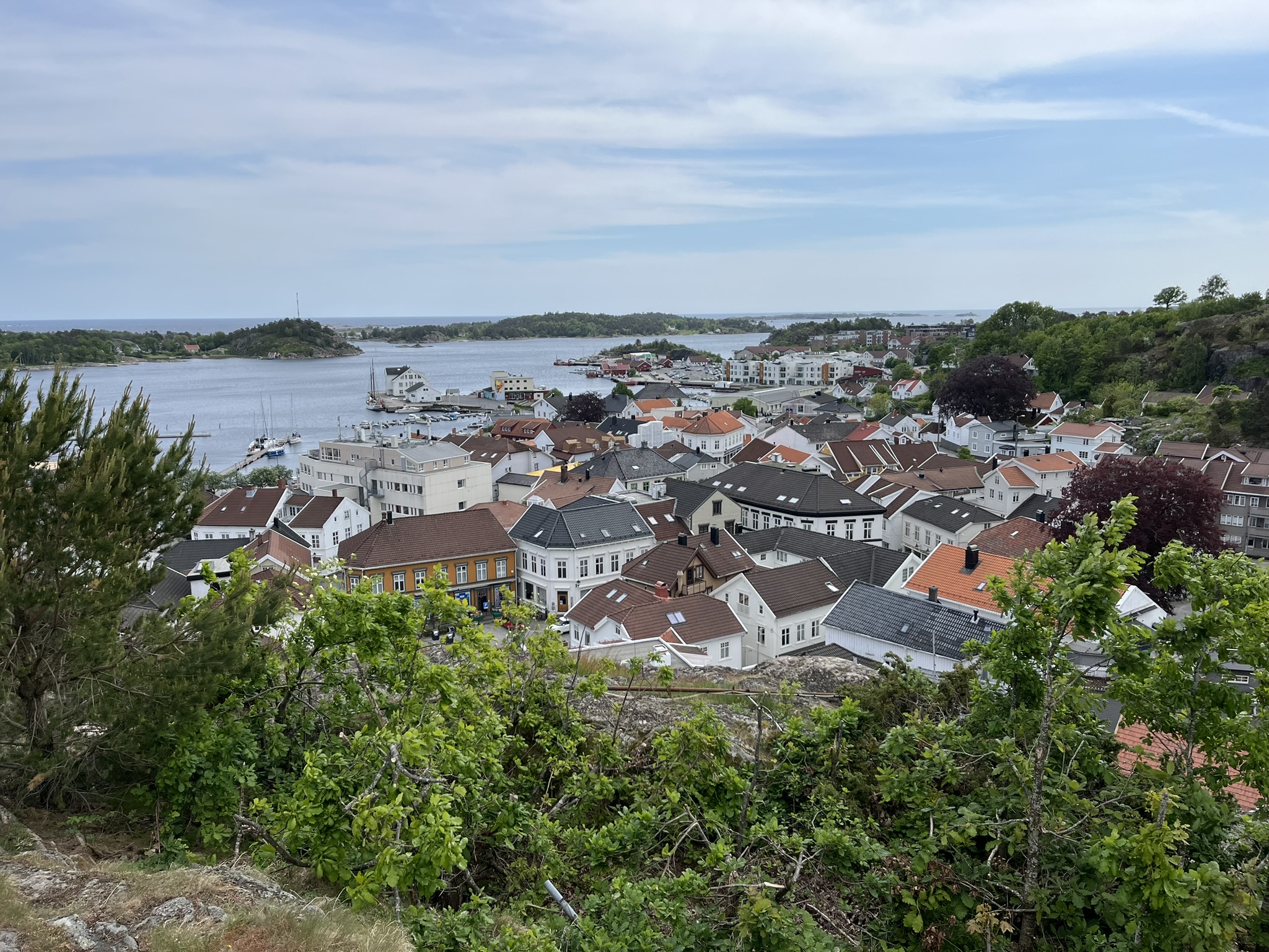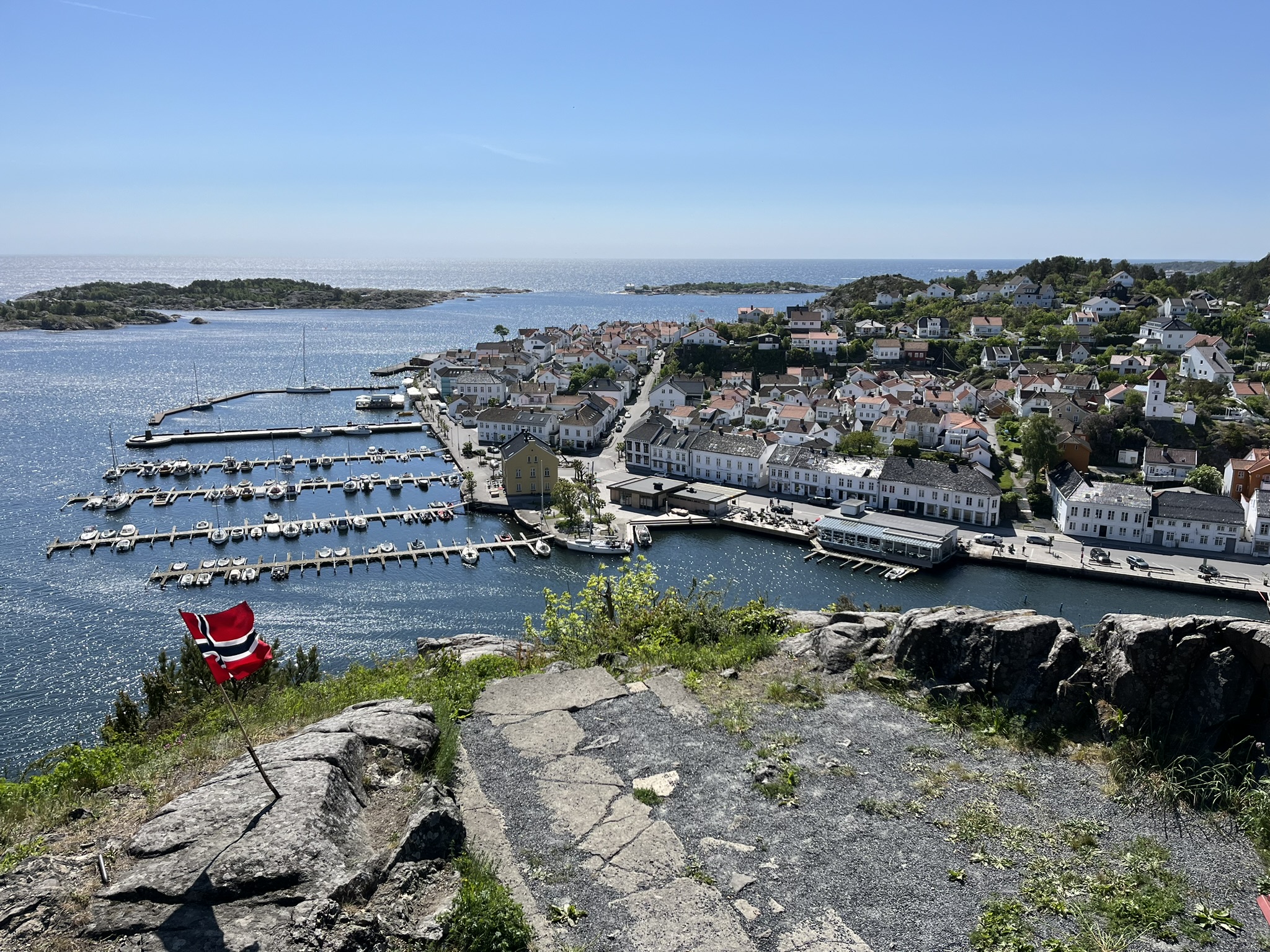 Nachdem wir herrliche Wochen in Schweden hatten, sind wir nun gespannt was uns in Norwegen erwartet. Die Überfahrt über den oberen Teil des Skagerraks ist mit 60sm relativ lang und wir müssen nach anfänglichen Flauten wegen dem ungünstiger werdenden Winkel des Windes immer mehr am Wind fahren. Das war auf Dauer mit den Wellen etwas anstrengend (d.h. der Wind kommt schräg von vorne). Das erste Ziel an der Südküste ist Risør und leider schaffen wir es nicht ganz, dort genau hinzusteuern. Daher müssen wir am Ende des Trips noch etwa 2h die Küste runter den Motor anwerfen. Die gesamte Etappe dauert über 15h und wir sind ziemlich geschafft gegen 21.00 Uhr angekommen. Risør aber begeistert uns, es ist auch hier Pfingsten und die Kneipen und Restaurants am Abend sind alle voll. Das kennen wir von unserem letzten Norwegen Besuch anders. Die Preise für Essen gehen (Pizza über 20€) und geschweige denn alkoholisches in Restaurants zu trinken (Bier über 10€) sind so hoch, dass es sich anscheinend auch die Norweger selber eher selten leisten. Die Stadt besteht in ihrem Kern fast ausschließlich aus weißen Holzhäusern, die einen Wettbewerb für die schönste Deko vor der Tür veranstalten. Der erste Spaziergang am Morgen geht den Berg hinauf zum Risørflekken einem weißen Felsen. Dort hat man einen großartigen Blick über die Stadt und ein paar nette Wälder mit Seen.