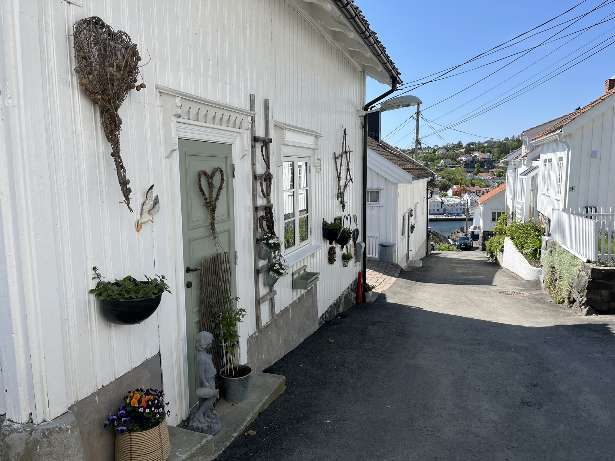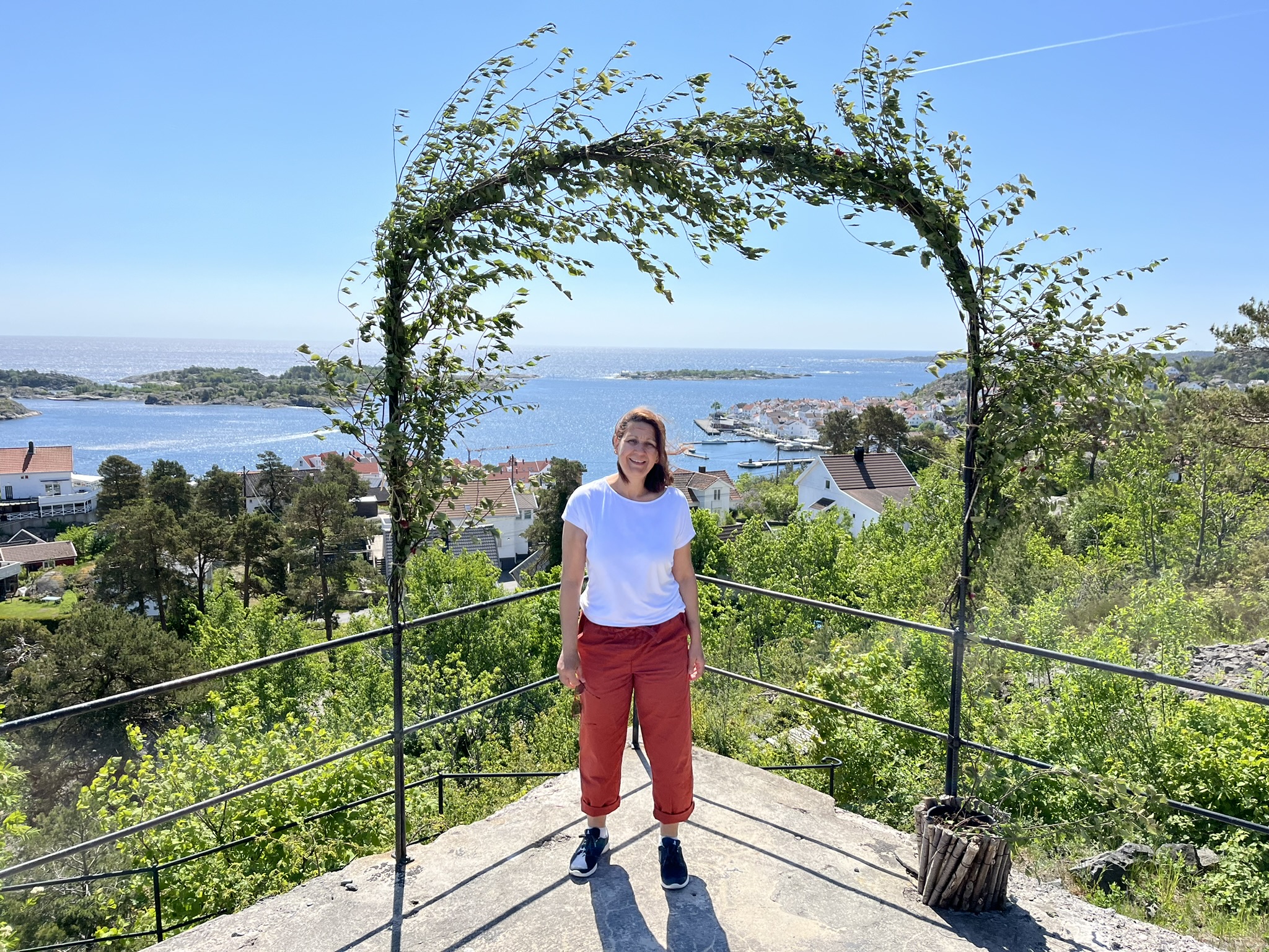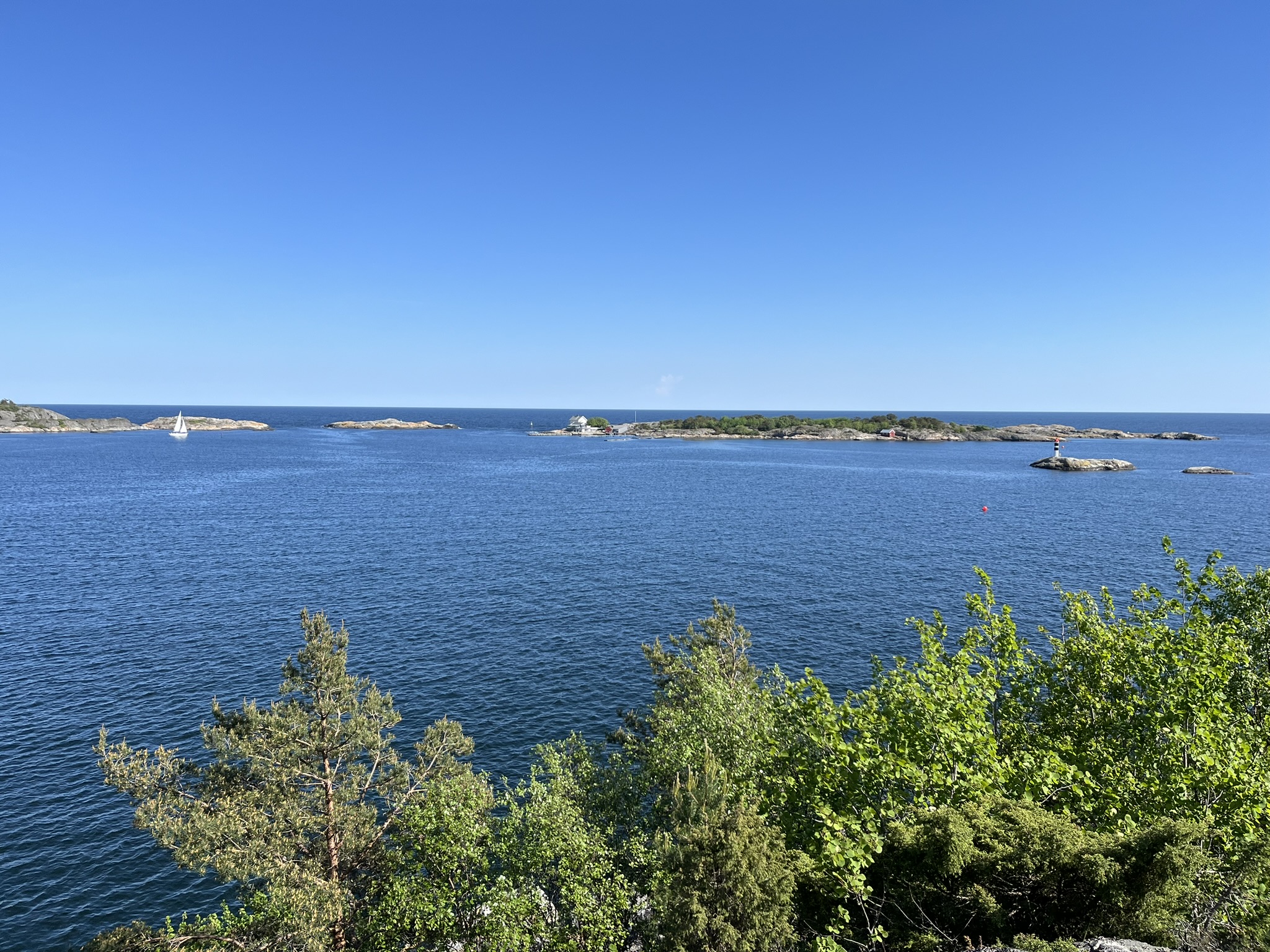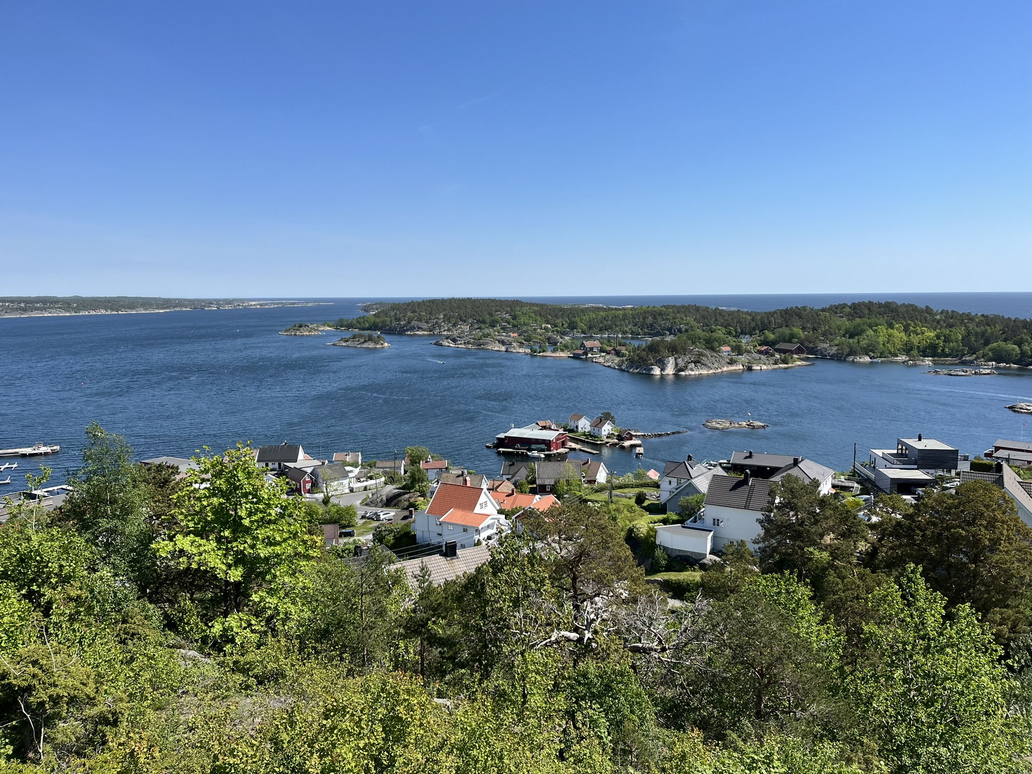 Nachdem wir herrliche Wochen in Schweden hatten, sind wir nun gespannt was uns in Norwegen erwartet. Die Überfahrt über den oberen Teil des Skagerraks ist mit 60sm relativ lang und wir müssen nach anfänglichen Flauten wegen dem ungünstiger werdenden Winkel des Windes immer mehr am Wind fahren. Das war auf Dauer mit den Wellen etwas anstrengend (d.h. der Wind kommt schräg von vorne). Das erste Ziel an der Südküste ist Risør und leider schaffen wir es nicht ganz, dort genau hinzusteuern. Daher müssen wir am Ende des Trips noch etwa 2h die Küste runter den Motor anwerfen. Die gesamte Etappe dauert über 15h und wir sind ziemlich geschafft gegen 21.00 Uhr angekommen. Risør aber begeistert uns, es ist auch hier Pfingsten und die Kneipen und Restaurants am Abend sind alle voll. Das kennen wir von unserem letzten Norwegen Besuch anders. Die Preise für Essen gehen (Pizza über 20€) und geschweige denn alkoholisches in Restaurants zu trinken (Bier über 10€) sind so hoch, dass es sich anscheinend auch die Norweger selber eher selten leisten. Die Stadt besteht in ihrem Kern fast ausschließlich aus weißen Holzhäusern, die einen Wettbewerb für die schönste Deko vor der Tür veranstalten. Der erste Spaziergang am Morgen geht den Berg hinauf zum Risørflekken einem weißen Felsen. Dort hat man einen großartigen Blick über die Stadt und ein paar nette Wälder mit Seen.
