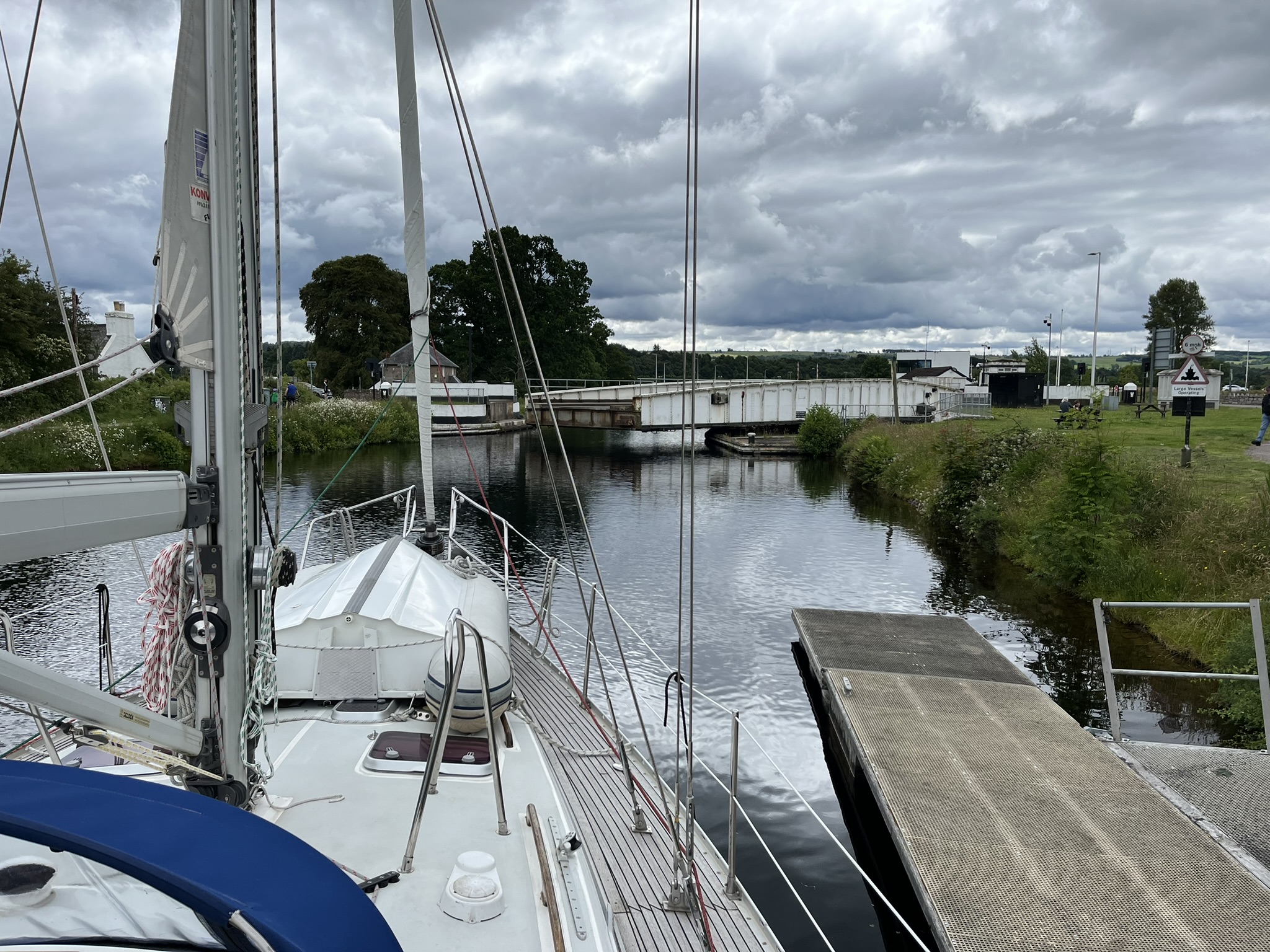 Spannend wird es am nächsten Morgen, wann wir denn die 5 Schleusenstufen hinauf dürfen. Der Schleusenwärter kommt zum Steg, fragt nach der Länge des Bootes und wir haben Glück. In 10 Minuten geht es los. Die 5 Stufen dauern insgesamt gut 1,5h und wir bekommen diesmal Unterstützung von einer Engländerin vom Boot vor uns, für das Führen der Leinen. Segeln kann man wegen dem leichten Wind genau von vorne vergessen, und so müssen wir leider den ganzen Tag Diesel verbrennen. Wir kämpfen uns durch insgesamt 9 Schleusen und machen an einem etwas einsam gelegenen Ort namens Lock Legann fest. Der gesamte Kanal kann übrigens beidseitig bewandert werden, es sind überall sehr gute Wege am Ufer. Alternativ geht natürlich auch Fahrradfahren. Einen davon nutzen wir noch für einen Marsch um die steif gewordenen Seglerbeine etwas zu vertreten.