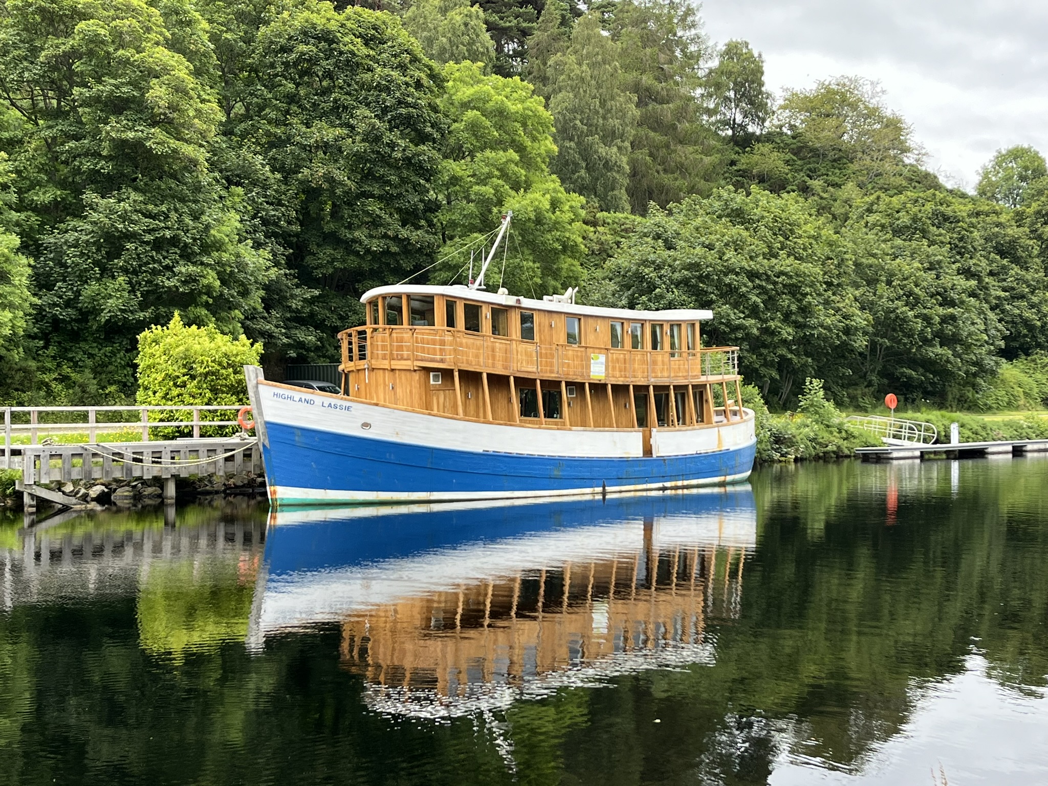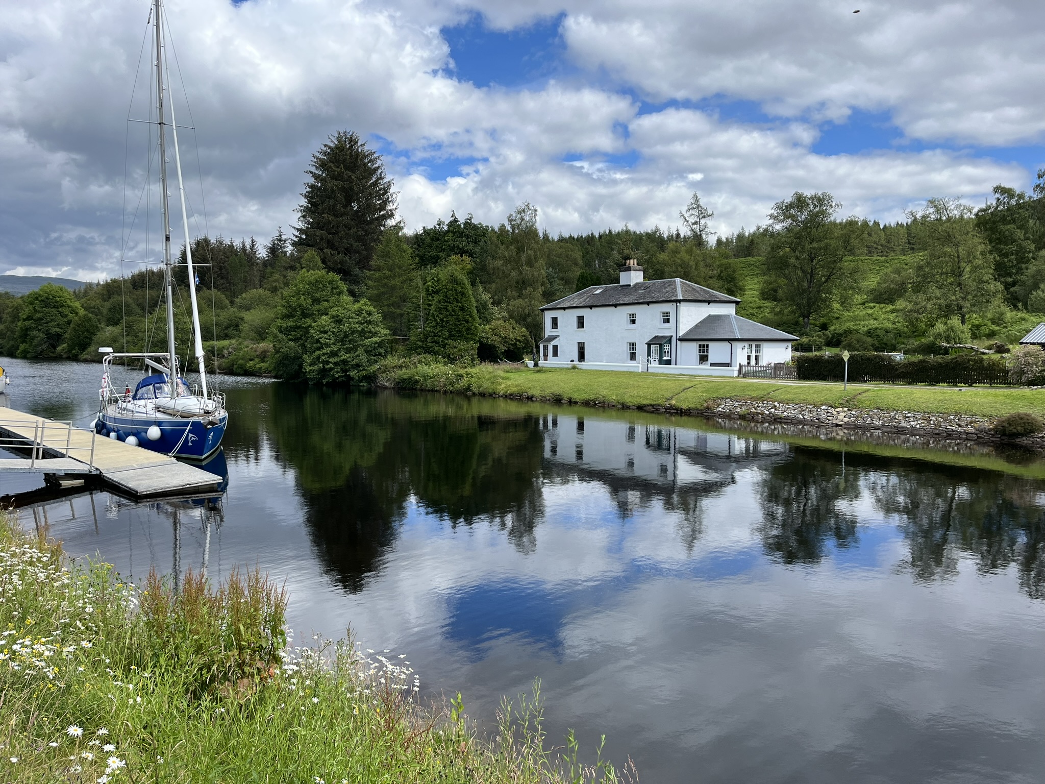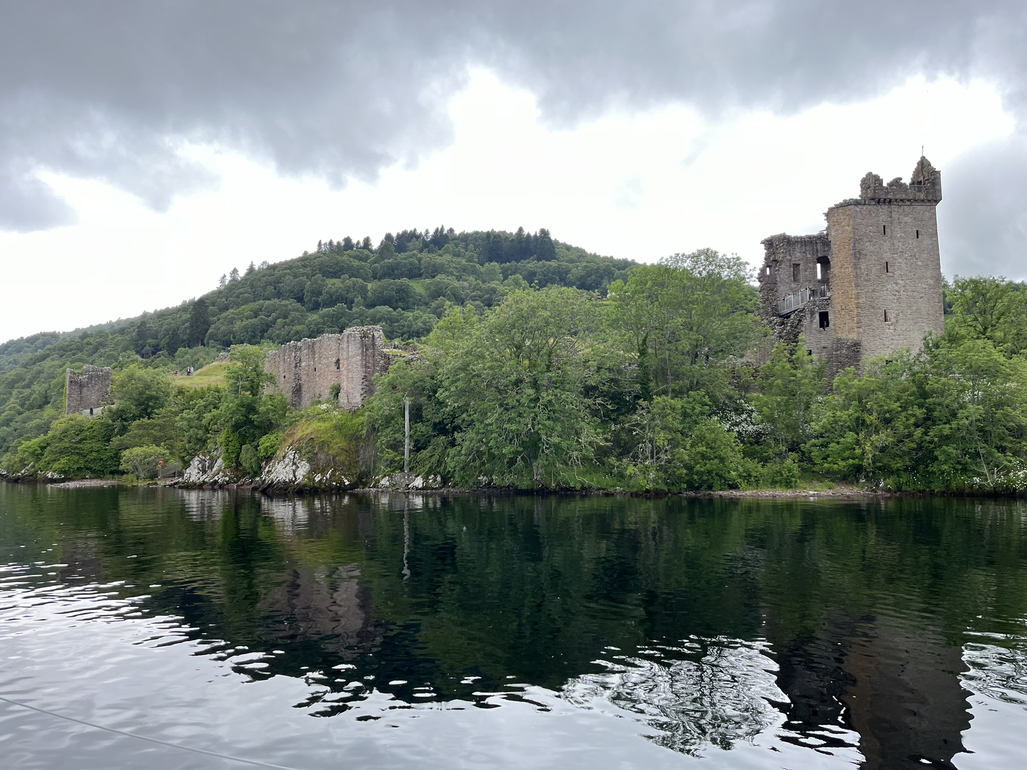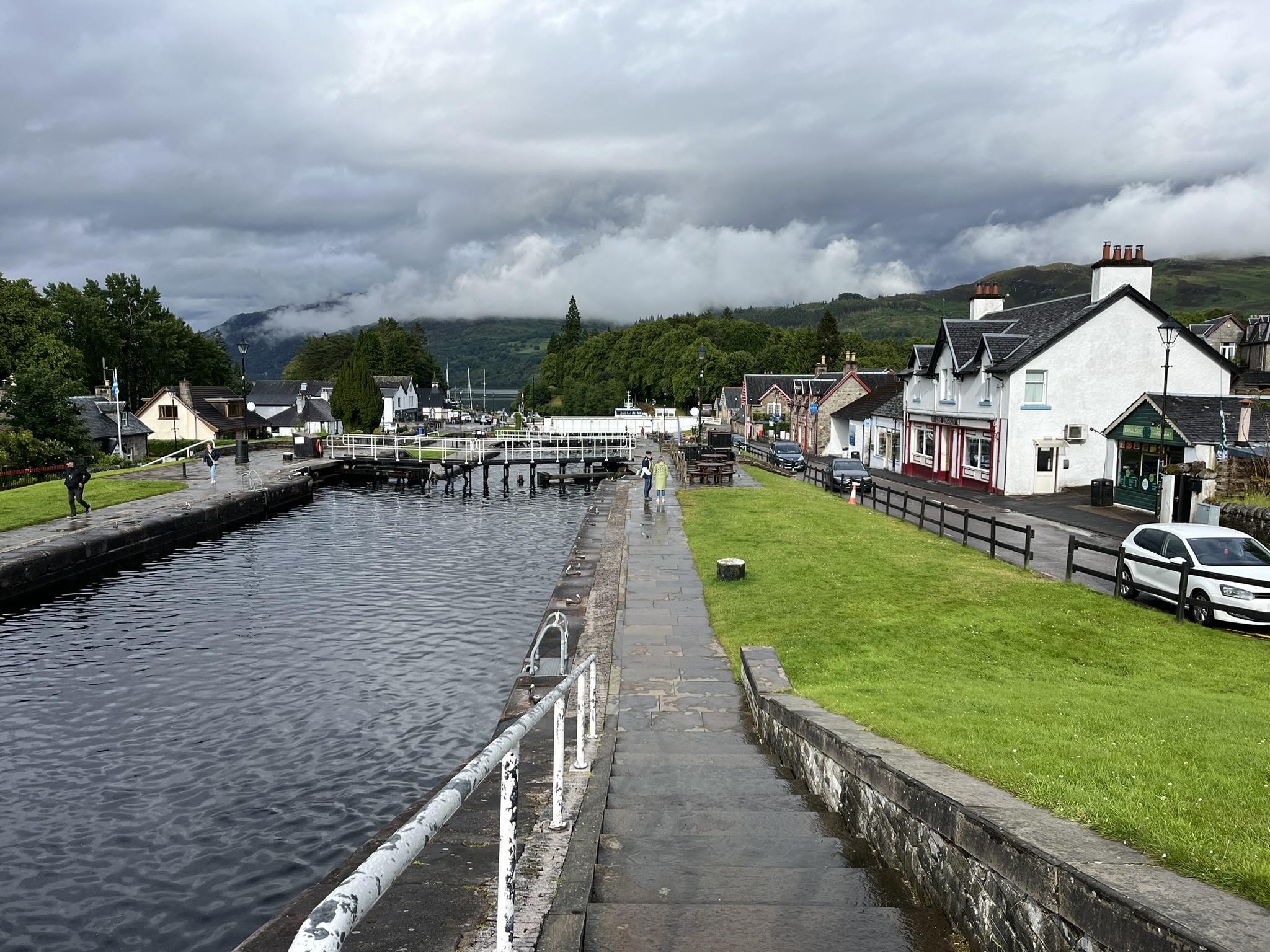Wir starten am nächsten Morgen direkt mit einer Viererschleuse. D.h. man wird in 4 hintereinandergeschaltete Schleusenkammern gebracht bis man gute 10m Höhenunterschied geschafft hat. Wir sind etwas aufgeregt, aber die Unterstützung der Schleusenwärterinnen, was das Annehmen der Leinen angeht, ist super. Wir werden gebeten, dass eines der beiden Crewmitglieder an Land geht, und die Leinen von dort aus durch alle Kammern führt. Das macht die Sache für die Beteiligten etwas einfacher. Nach ein paar weiteren Schleusen kommen wir am Nachmittag in einem ziemlich kleinen Örtchen direkt vor dem Loch Ness an, wo wir noch einen schönen Spaziergang machen.