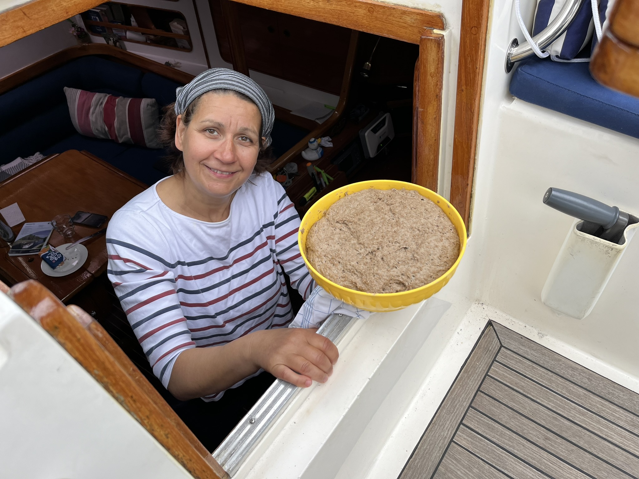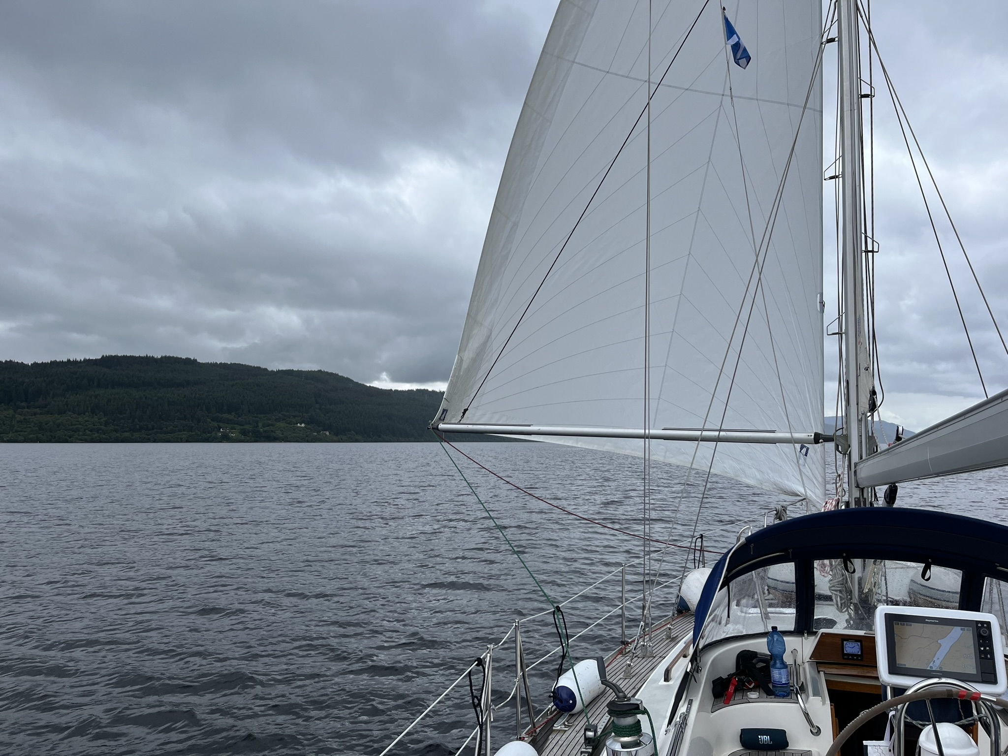 Zurück nach Inverness, wegen Dauerregens und sehr windigem Wetter (da macht Schleusen, wie wir aus Holland noch wissen, keinen Spaß) verzögert sich die Weiterfahrt um einen Tag. Um den zu nutzen wird im Boot rumgebastelt und es werden einige Investitionen getätigt. Wir hängen im Gästebad eine lange geplante Stange für die nassen Sachen auf. Die Schuhe werden durch eine einfache Konstruktion in der Bugkabine an die Wand gehängt, und die Skipperin kauft eine Nähmaschine um für unseren Durchgang nach hinten ein paar Gardinen zu nähen. Da es in Schottland nur Weißbrot zu kaufen gibt, wird noch ein Brot gebacken. Hat sich doch gelohnt der Tag.