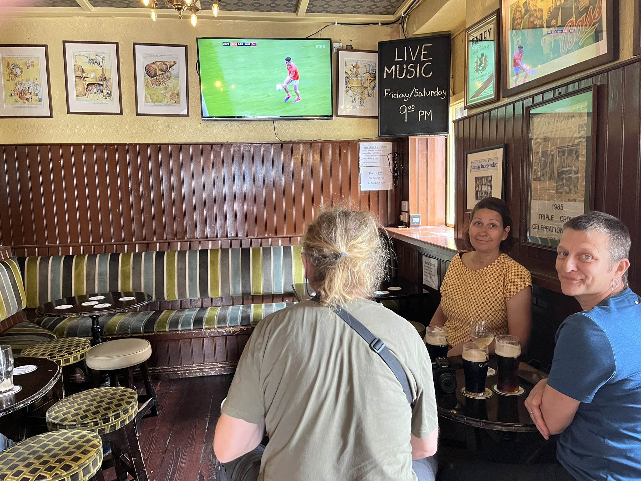 Sonntag treffen wir wieder Christian und Hilde in der Stadt auf einem Flohmarkt. Ganz nett, aber Preise die einen doch erstaunen lassen. Die wollen für ein 2nd Hand Billigshirt 25€ haben. Wir schlendern durch die Gegend und landen am Nachmittag in einer Ausstellung von irischen Malern, u.a. hat auch Mick dort ein paar Bilder hängen. Dann gibt es noch als kunstvollen Gegensatz an diesem Nachmittag das Endspiel im Gaelic Football welches neben Hurling der irische Nationalsport ist. Das ist so eine Mischung aus Rugby und Fußball und wir schauen in einem Pub eine Halbzeit. Gefangen genommen hat mich die Sportart nicht, aber die Stimmung ist grandios. Abends sind wir dann bei uns an Bord zum Abendessen und lassen den Tag bei Whiskey (aus Port Ellen) und Wein ausklingen.