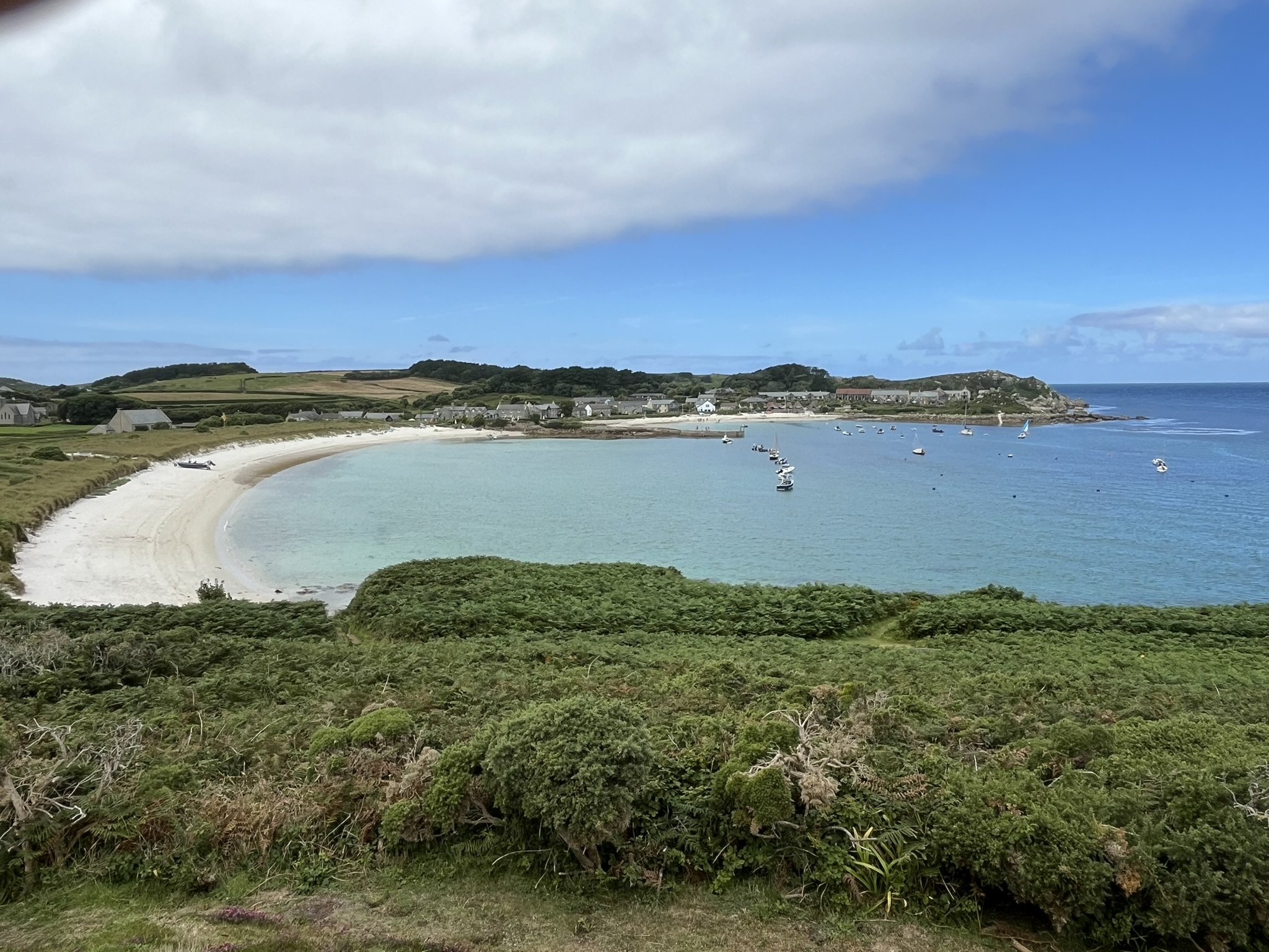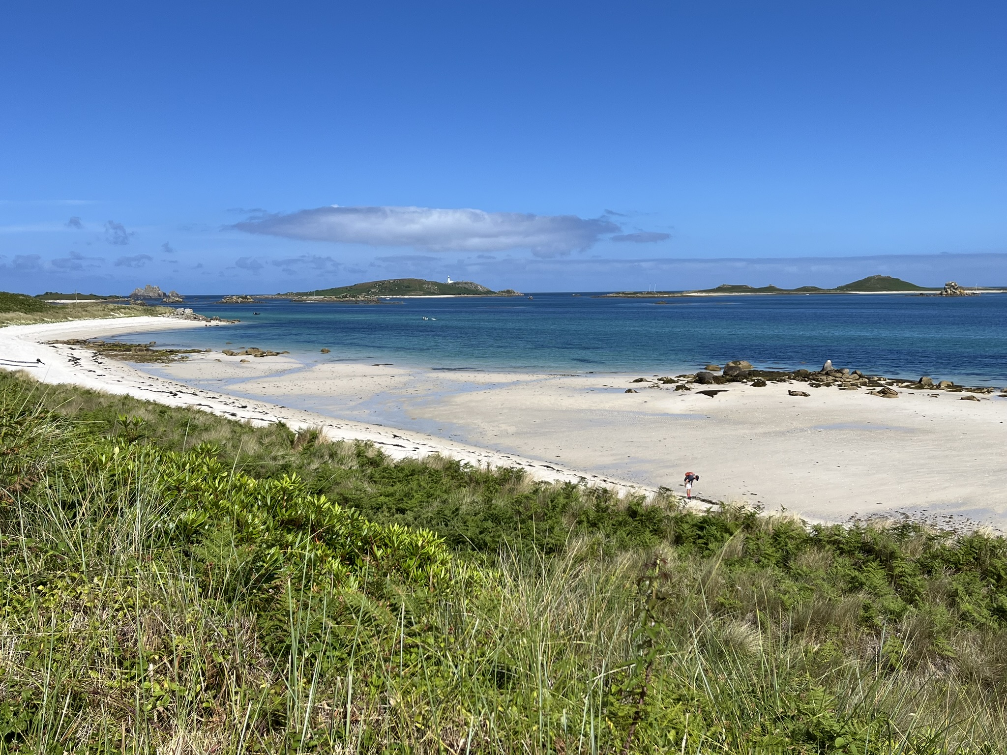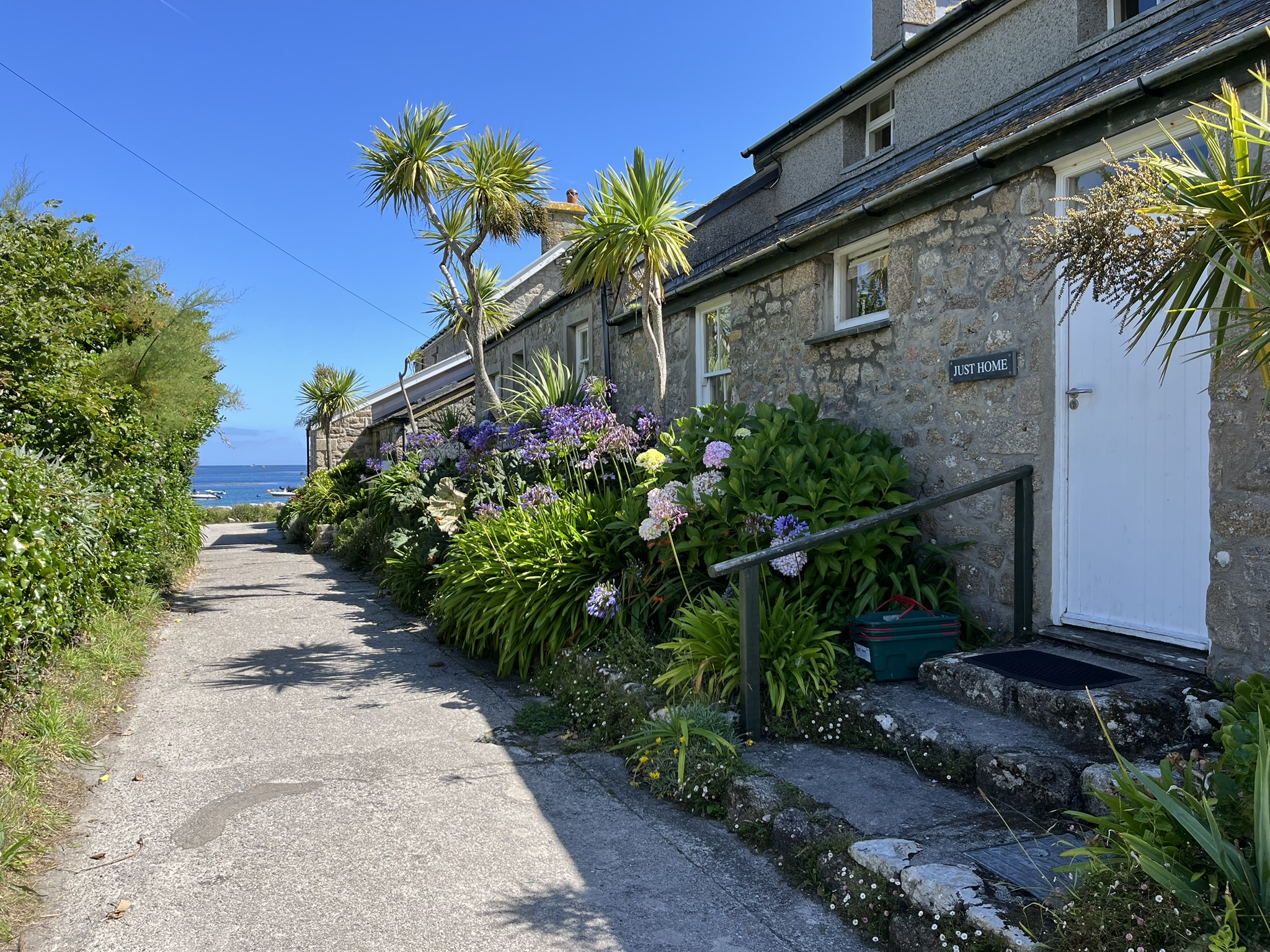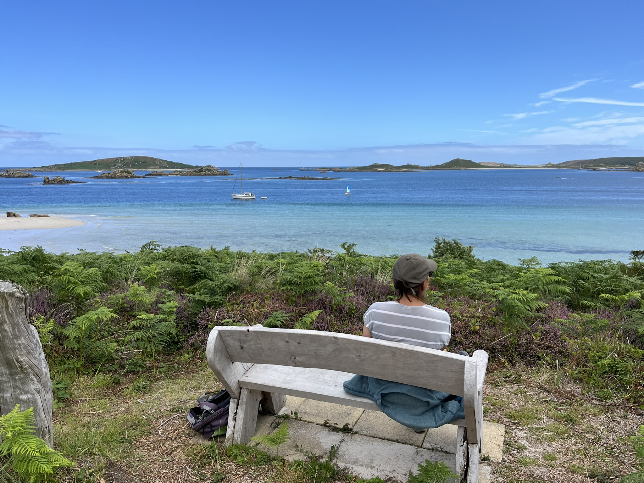 Das Wetter ist super, wir machen das Dinghi klar und fahren hinüber auf eine der fünf bewohnten Inseln. Diese heißt Tresco und man kann recht einfach am weißen Strand anlanden. Wir müssen mal der Redaktion der Sendung „Wunderschön“ im WDR bescheid sagen, es lohnt sich hier zu drehen. Es gibt viele Wege die um die Insel herumführen, mit phantastischen Ausblicken auf die weißen Strände, ohne Ende Palmen und andere exotische Pflanzen. Wir wandern durch die Dünen mit lila Heidefeldern, und wenn man quer durch die Insel durchgeht, trifft man auf einen alten Palast mit dem angeblich schönsten Garten Englands. Den haben wir allerdings wegen des krassen Eintritts von 18Pfund ausgelassen sondern dort nur was getrunken. Überall sind alte aber schicke Häuschen mit netten Gärten. Es ist ein echtes Privileg hier zu wohnen.