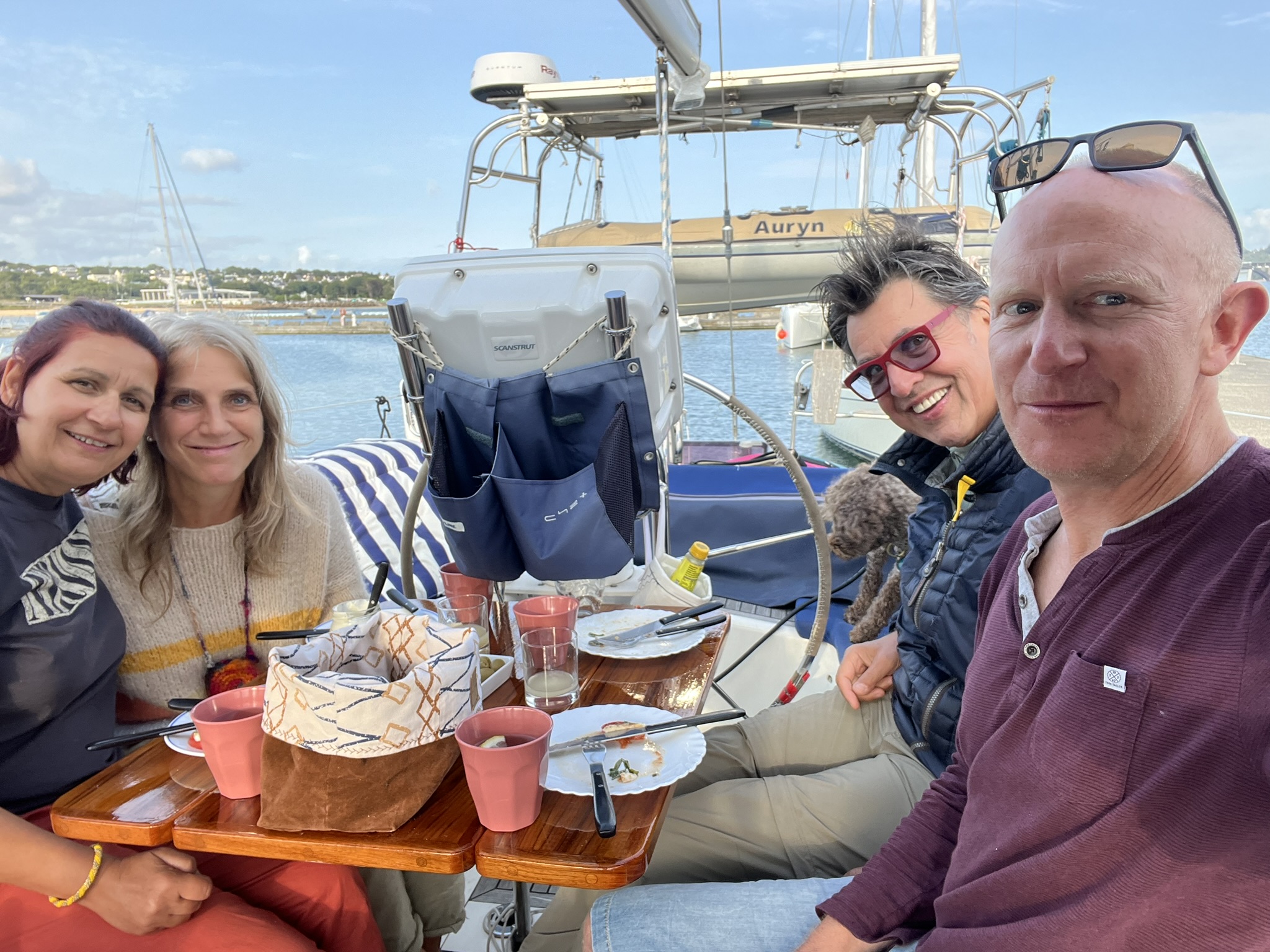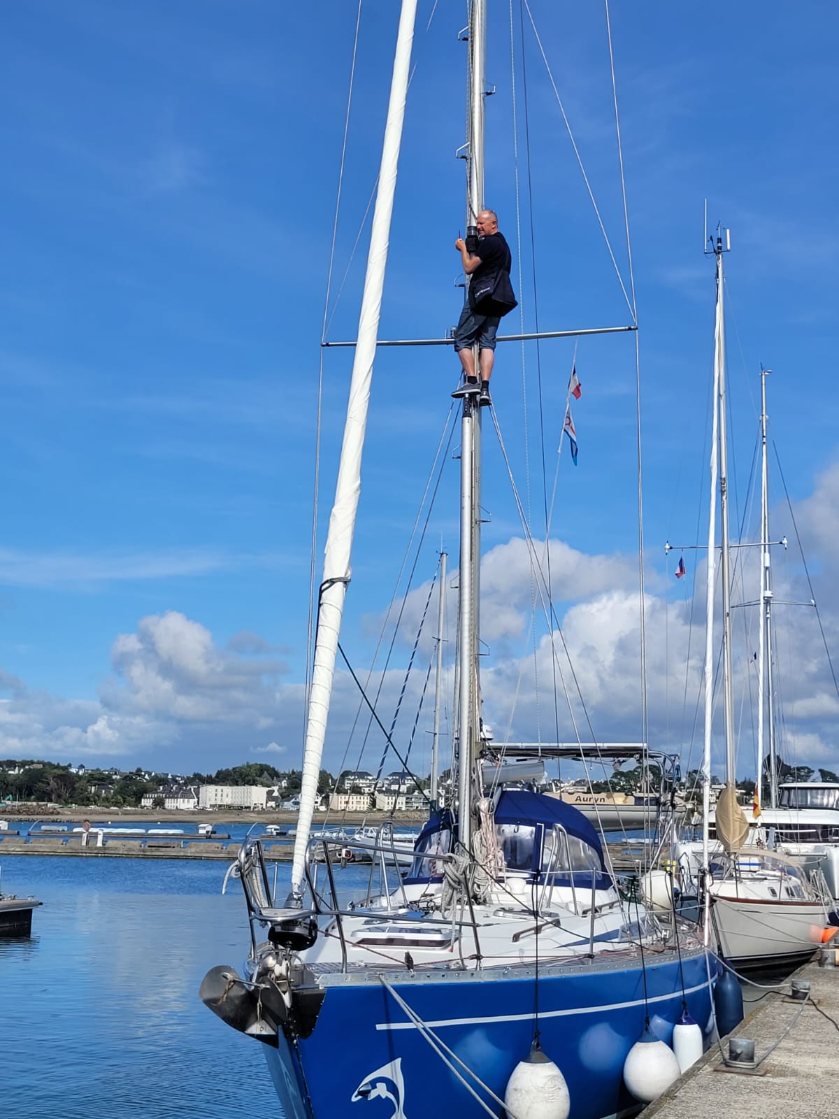 Einigermaßen froh da des Rollens überdrüssig, segeln wir die 10sm am Vormittag gemütlich nach Brest rüber wo wir eine Woche mindestens in der Marina Moulin Blanc bleiben. Es gibt diverse Arbeiten am Boot zu erledigen, die wir entweder schon lange vor uns herschieben oder eben jetzt erst die Teile dafür bekommen. Haui und Adelheid kommen auf ihrer Bretagne Tour mit dem Wohnmobil vorbei und bringen einige Teile mit die wir bestellt hatten. Da wären z.B. die Windfahnensteuerung, ein Hydrogenerator und ein neues Leder für das Steuerrad. Vor allem die beiden erstgenannten haben verdammt viel Platz im Wohnmobil eingenommen und wir sind sehr dankbar, dass Haui es irgendwie geschafft hat die Kartons in den Wagen zu quetschen, super!