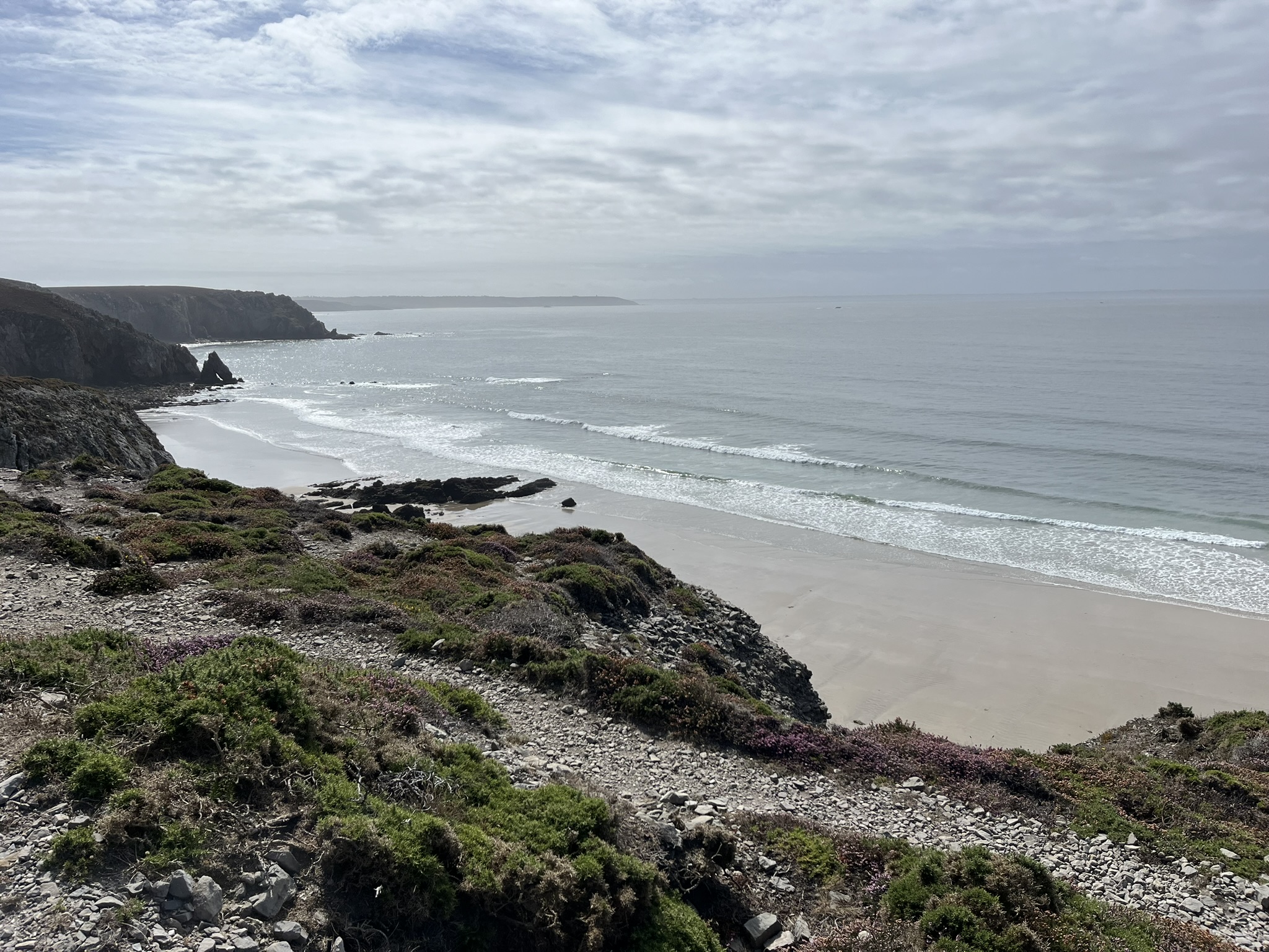 Bevor wir rüber nach Brest fahren, müssen wir noch ein paar Tage vor Anker in der Bucht von Camaret aushalten. Der Schwell der in die Bucht hineinläuft und das Boot permanent von rechts nach links kippt, macht uns schon etwas mürbe. Das liegt zum großen Teil an den riesigen Gezeiten die bis zu 6m hoch sein können, und entsprechende Mengen Wasser alle 6 Stunden in die Bucht hinein und hinausschieben. Wenn es auf Ebbe zugeht ist es etwas besser aber wenn die Flut reinkommt dann sind auch die Wellen da. Aber nicht verzagen, dafür ist die Landschaft hier umso schöner und macht das ungemütliche Liegen allemal wieder wett. Wir machen eine Wanderung zum Pointe du Toulinguet der sensationelle Klippen und Ausblicke auf die Strände bietet. Für die Nacht ist Starkwind angesagt inkl. Winddrehern. Der Wind ist nicht so dass Problem, wir vertrauen unserem Anker da er seit 4 Tagen fest sitzt. Etwas kniffeliger ist es wenn der Wind dreht, da dann das Boot sich entsprechend mit dreht und der Anker aus der Richtung in die er eingegraben ist gezogen wird. Dann muss er sich erstmal wieder neu setzen. Ist aber alles gut gegangen und wir sind halbwegs in Position geblieben.