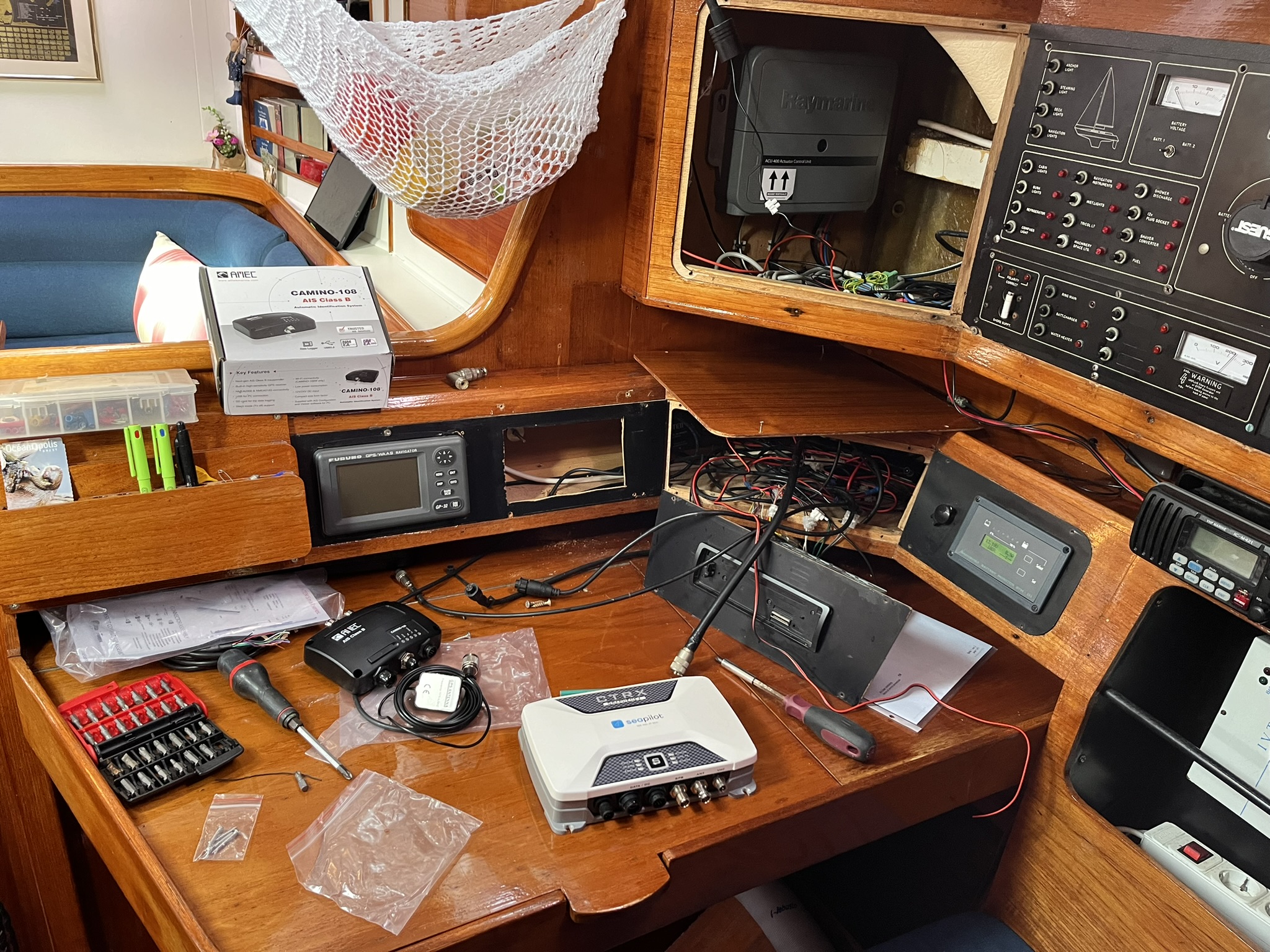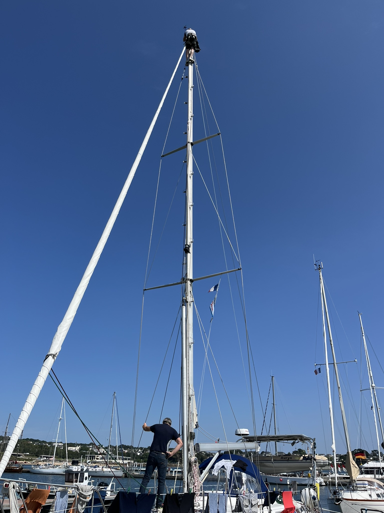 Jetzt kommt ein Beitrag der mit Reisen nichts zu tun hat sondern vom anderen Segelalltag erzählt, dem Bootinstandhalten und Verbessern. Die Woche in der Marina Moulin Blanc ging schneller rum als gedacht. Wir waren fleißig und haben eigentlich alle Projekte fertig gestellt, bzw. fertig stellen lassen, die wir uns vorgenommen haben. Zum Glück haben die Werften hier in der Gegend durch das nahende Saisonende nicht so viel zu tun. Der Rigger kam bereits am nächsten Tag und hat den Zustand und die Spannung der Wanten (die Drahtseile die den Mast halten) kontrolliert und neu eingestellt. Ging flott, nach nach einer Stunde waren beide fertig. Parallel fing der Elektriker an auf Fehlersuche bei unserem AIS (Automatisches Identifizierungssystem) zu gehen. Nach einigen Tests kam die befürchtete Diagnose, das Gerät ist kaputt wir brauchen ein Neues. Er machte es direkt am nächsten Tag und es scheint einwandfrei zu laufen. Damit sollten wir jetzt auf Marine Traffic wieder zuverlässig zu verfolgen sein und die anderen Schiffe sehen uns auch wieder. Gerade Nachts ist das von erheblichem Vorteil um Kollisionen zu vermeiden.