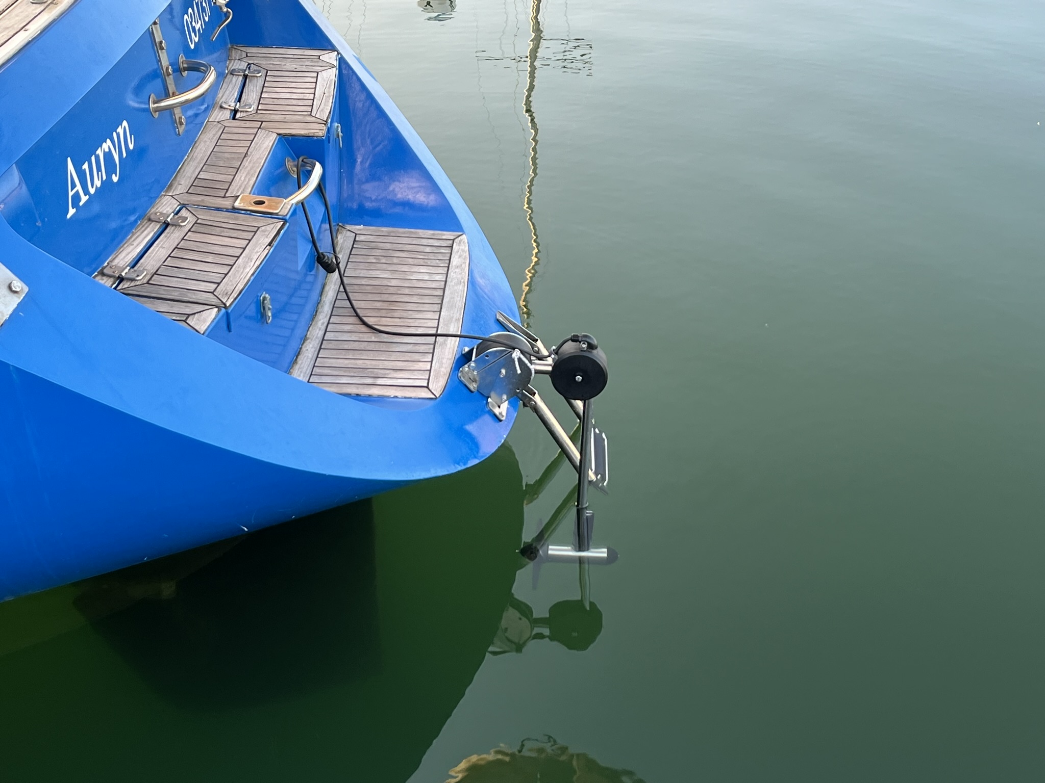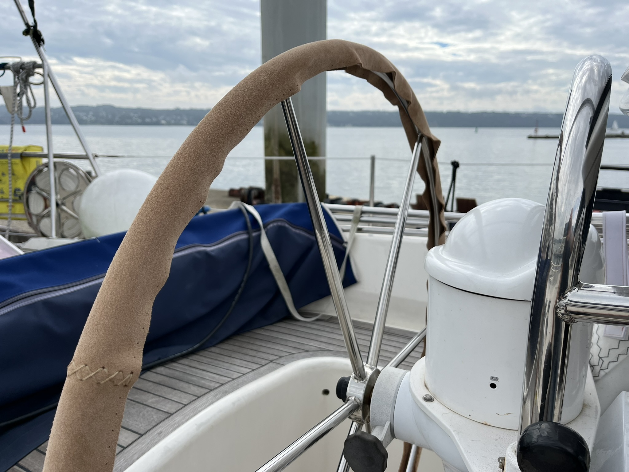 Die Skipperin hat sich das Steuerrad vorgenommen und mit Leder ummantelt, da das alte langsam anfing abzubröseln. Es war stundenlange Arbeit die ganzen Kreuzstiche zu setzen und sieht großartig aus. Der Skipper hat sich mit dem Heck beschäftigt und als erstes den Hydrogenerator montiert. Dafür mussten an der untersten Stelle außen 4 Löcher gebohrt werden. Das Problem war nun die Schrauben die von außen reinkamen von innen zu kontern. Normalerweise bräuchte man dafür ein kleines Kind was hinten ganz unten in den Raum passt. Eng ist es vor allem deshalb weil dort auch noch der Autopilot im Weg ist. Daher hat sich der Skipper ganz schlank gemacht und ist mit vielen Verrenkungen und einem langen Schraubenschlüssel dort hineingekrochen. Zum Glück haben die Schrauben gepasst und der Generator hängt gut. Dann noch einige Kabel angeschlossen und zur Batterie geführt. Es gibt auch eine App für das Handy mit der man den Ladefluss und die Mengen ablesen kann die produziert werden.