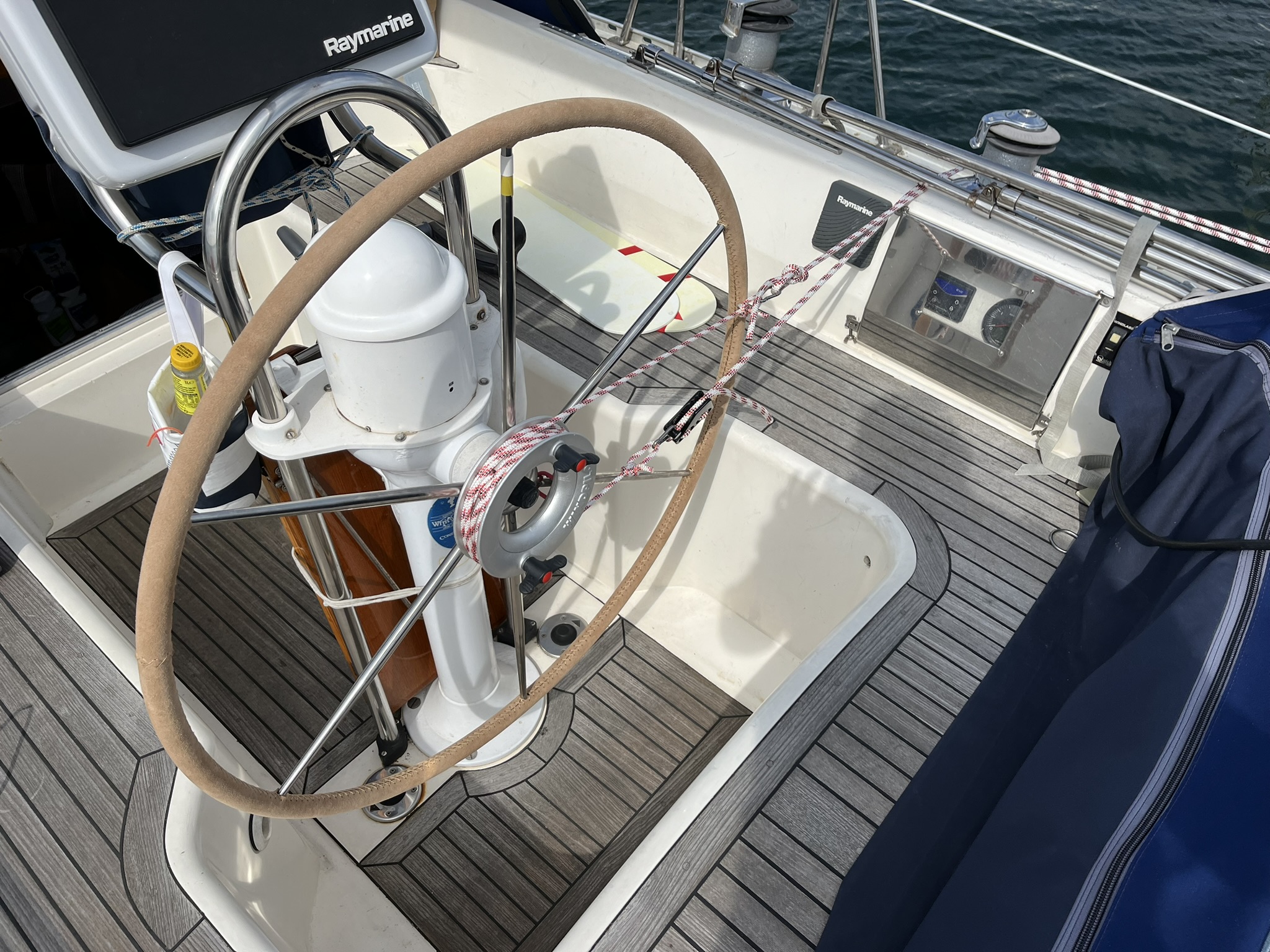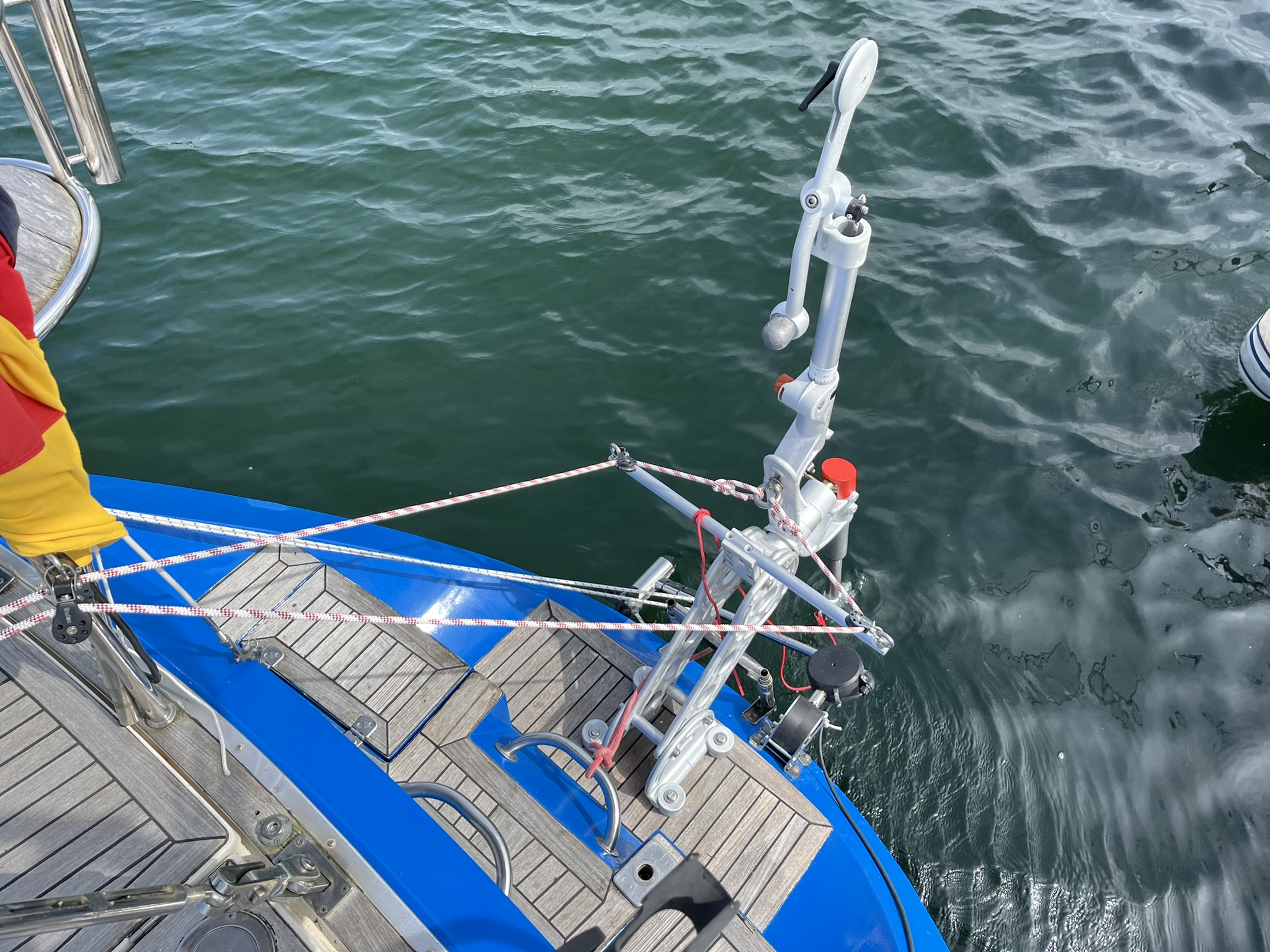 Dann kam die Windfahnensteuerung dran. Auch da mussten 4 Schrauben ins Heck gebohrt werden auf denen der Träger montiert wird. Inzwischen ist der Skipper was das Verrenken im Heck angeht geübt, und die Montage ging etwas schneller. Ein Problem tat sich auf, weil die Windfahne und der Generator sich nicht in die Quere kommen dürfen. Nach Rücksprache mit dem Hersteller war es kein Problem den Träger schräg zu setzen, so dass beides aneinander vorbei passt. Trotzdem war es noch stundenlanges anpassen diverser Schrauben und den zugehörigen Teilen, bis die Winkel und der Abstand der Teile zueinander zufriedenstellend waren. Die Windfahne arbeitet so, dass quasi die Fahne das Boot immer im gleichen Winkel zum Wind hält. Dafür gehen zwei Leinen von hinten ins Cockpit und greifen an einem Adapter am Steuerrad an. Tricky war es noch die Leinenführung so zu gestalten, dass eine gleichmäßige und verlustfreie Übertragung stattfinden kann. Der Hersteller hat es am Ende abgenickt und wir freuen uns schon sehr auf die Probefahrt.