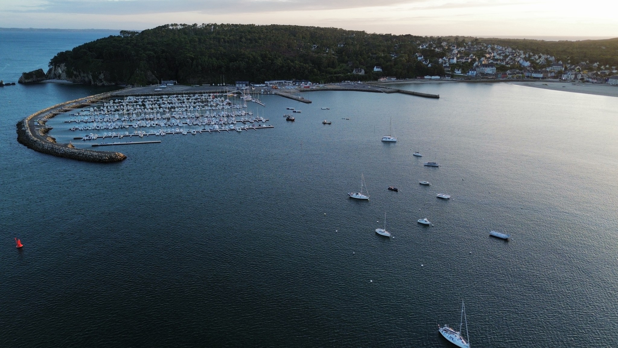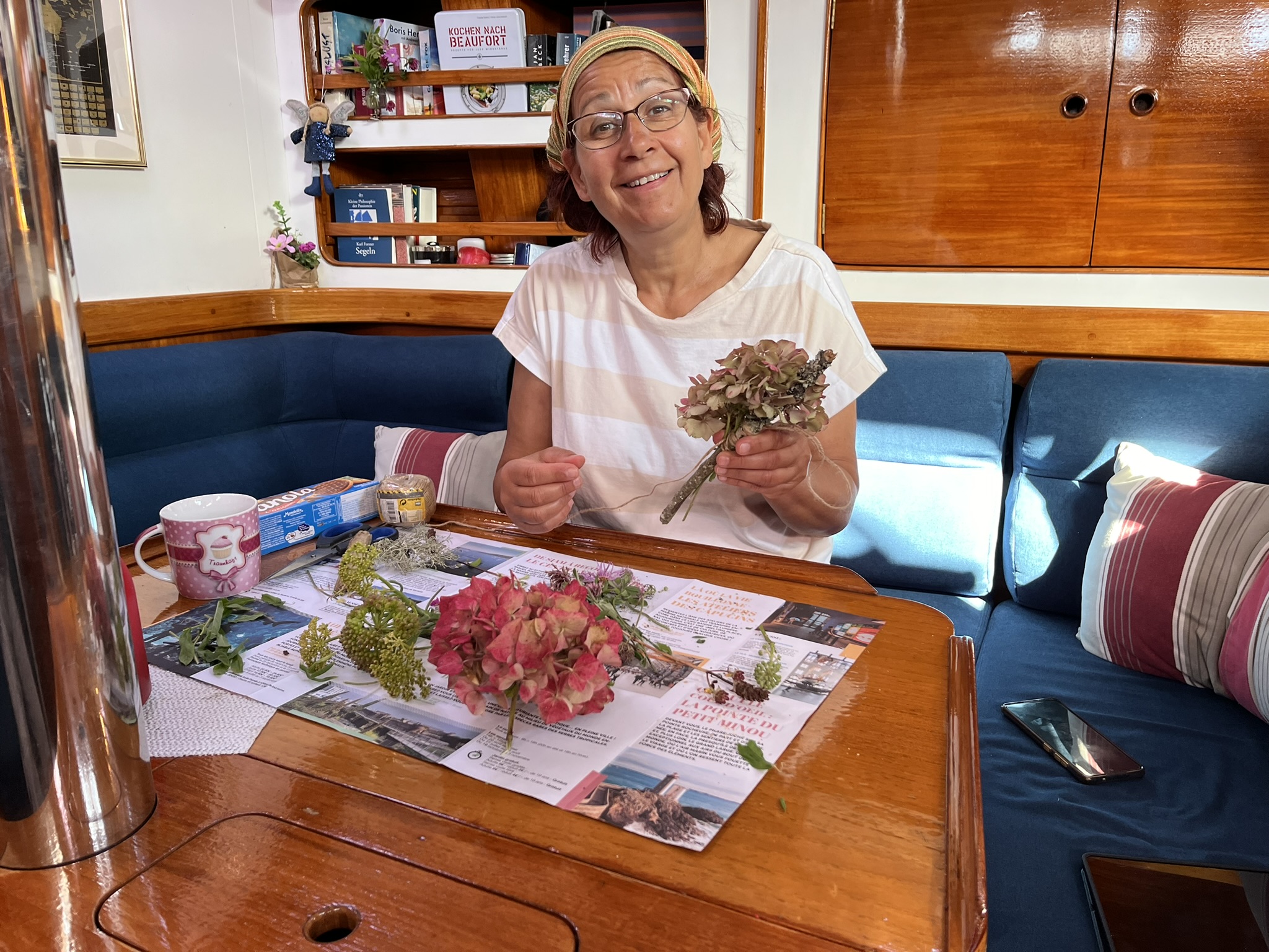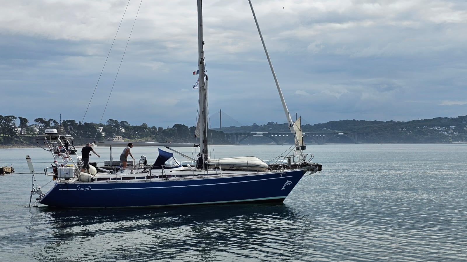 Wir überlegen uns spontan noch bis Freitag zu bleiben, weil dann der Wind für die Rückfahrt nach Brest etwas besser ist. Daher haben wir den Donnerstag Zeit das Boot mal richtig auf- und umzuräumen. Irgendwo müssen unsere Kinder wenn sie am Wochenende kommen schließlich schlafen. Marlene wird etwas länger bleiben und dafür brauchen wir die Kabine vorne freigeräumt. Einigen Stauraum finden wir in der Durchgangskabine die mal wieder richtig aufgeräumt und ausgemistet wird. Dann werden alle Matratzen und Decken zum Auslüften an Deck in die Sonne gelegt. Der Skipper optimiert noch das Leinenhandling der Windfahne ins Cockpit auf Hinweis des Herstellers ein wenig. Am Nachmittag fahren wir mit dem Beiboot etwas ins Örtchen, schlendern rum und gehen ordentlich Einkaufen. Damit hätten wir eigentlich alles erledigt und die Kinder können kommen. Wir sind einigermaßen aufgeregt, Marlene kommt am Abend in Brest mit dem Zug an und Niklas mit dem Flieger am Samstag.
