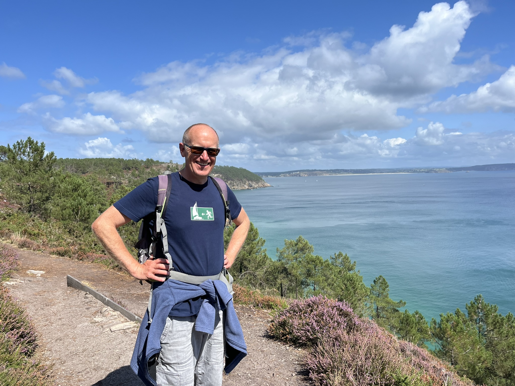Am nächsten Tag machen wir eine Wanderung die Küste runter und man muss sagen, es ist ein wirkliches Highlight. Im Landesinneren sind es grüne dichte Pinienwälder und die Küste ist sehr spektakulär. Es gibt karibisch blaue Buchten mit steilen felsigen Abhängen, Heideflächen die durch den vielen Regen diesen Sommer immer noch sehr bunt sind. Ich verstehe nicht warum wir in unserem Leben noch nie Urlaub in der Bretagne gemacht haben.