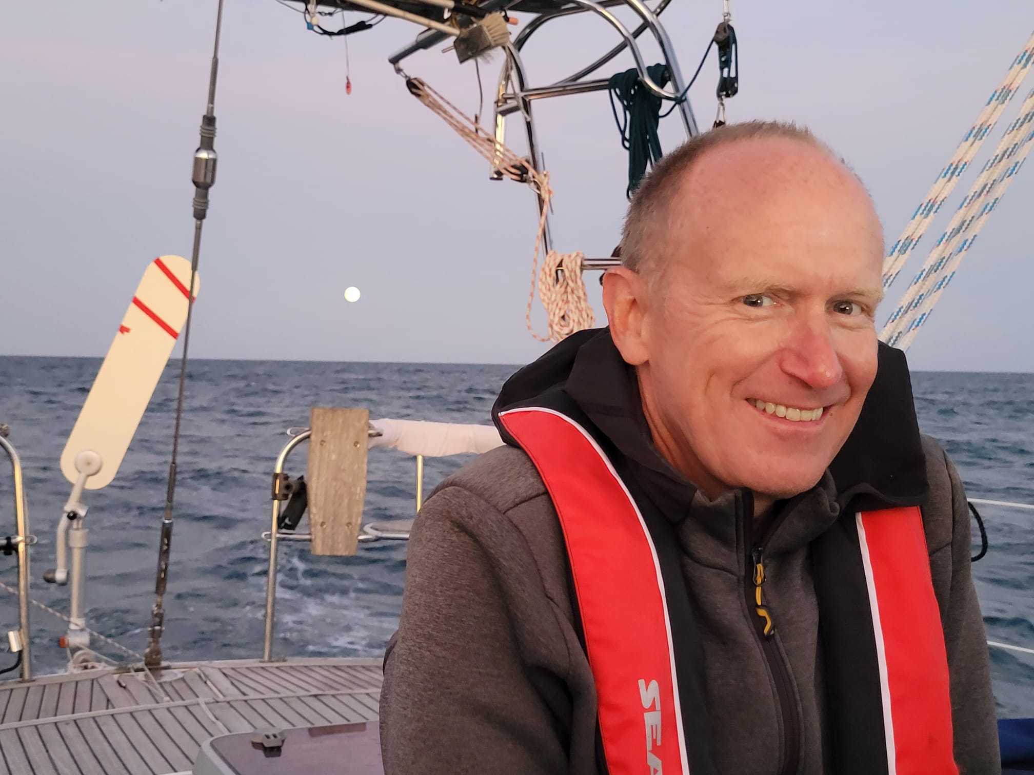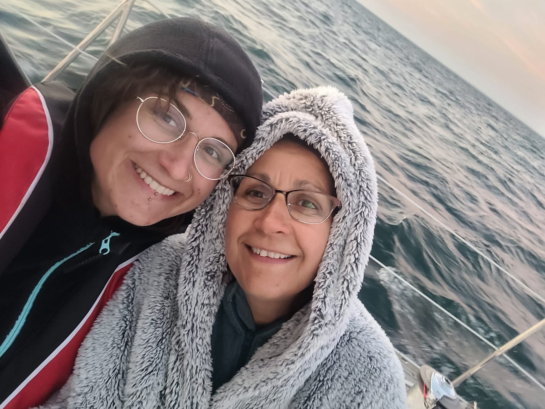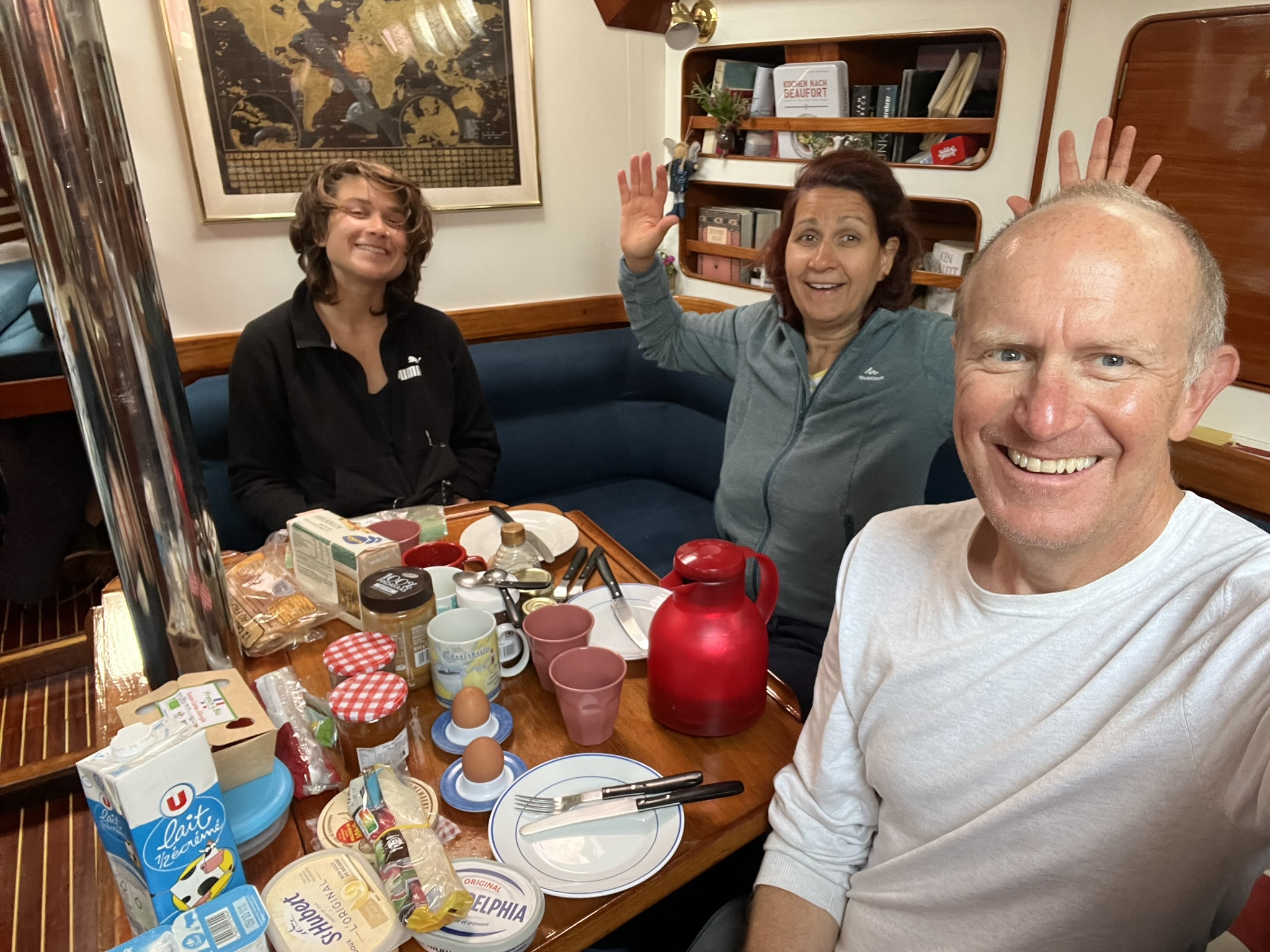 Der Wind war stundenlang bei 6 Bft anstelle von vereinzelten Böen. Das Problem war aber auch eher die Welle, die sich immer wieder in dreierpacks von hinten turmhoch anschlich und uns umher warf. Aber es gibt auch Gutes zu berichten. Wir können den Kurs deutlich besser halten als vorhergesagt und wir hatten Vollmond mit sternenklarer Nacht und ab und zu Delfinbegleitung. Die Welle ebbte auch am zweiten Tag nicht wirklich ab. Erst in der zweiten Nacht wurde es dann deutlich ruhiger bei stetigem schönen Wind. Was am zweiten Tag endlich funktioniert hat, war den Windpiloten so einzustellen, dass er auch bei schwierigeren Bedingungen den Kurs sehr gut hält. Das macht dann die ganze Geschichte deutlich angenehmer wenn man nur noch daneben sitzen muss und den Kurs überwachen braucht. Einmal hat bei einer heftigen Welle der Windpilot den Kurs verloren, was dazu führte, dass ein paar Teller aus dem Schrank geflogen sind. Wir brauchen dringend Plastikgeschirr. Dann hatten wir noch eine Welle, die durch ein aus Versehen nicht geschlossenes Fenster sich über die Küche ergossen hat. Ansonsten ist alles gut, die Crew und Auryn halten sich tapfer. Wir wechseln uns nachts alle paar Stunden im Cockpit ab und der andere kann dann etwas schlafen. Noch haben wir uns nicht an dieses Intervallschlafen gewöhnt. Wir kommen am Freitag Vormittag an. Liebe Grüße von Marlene Natascha und Jan