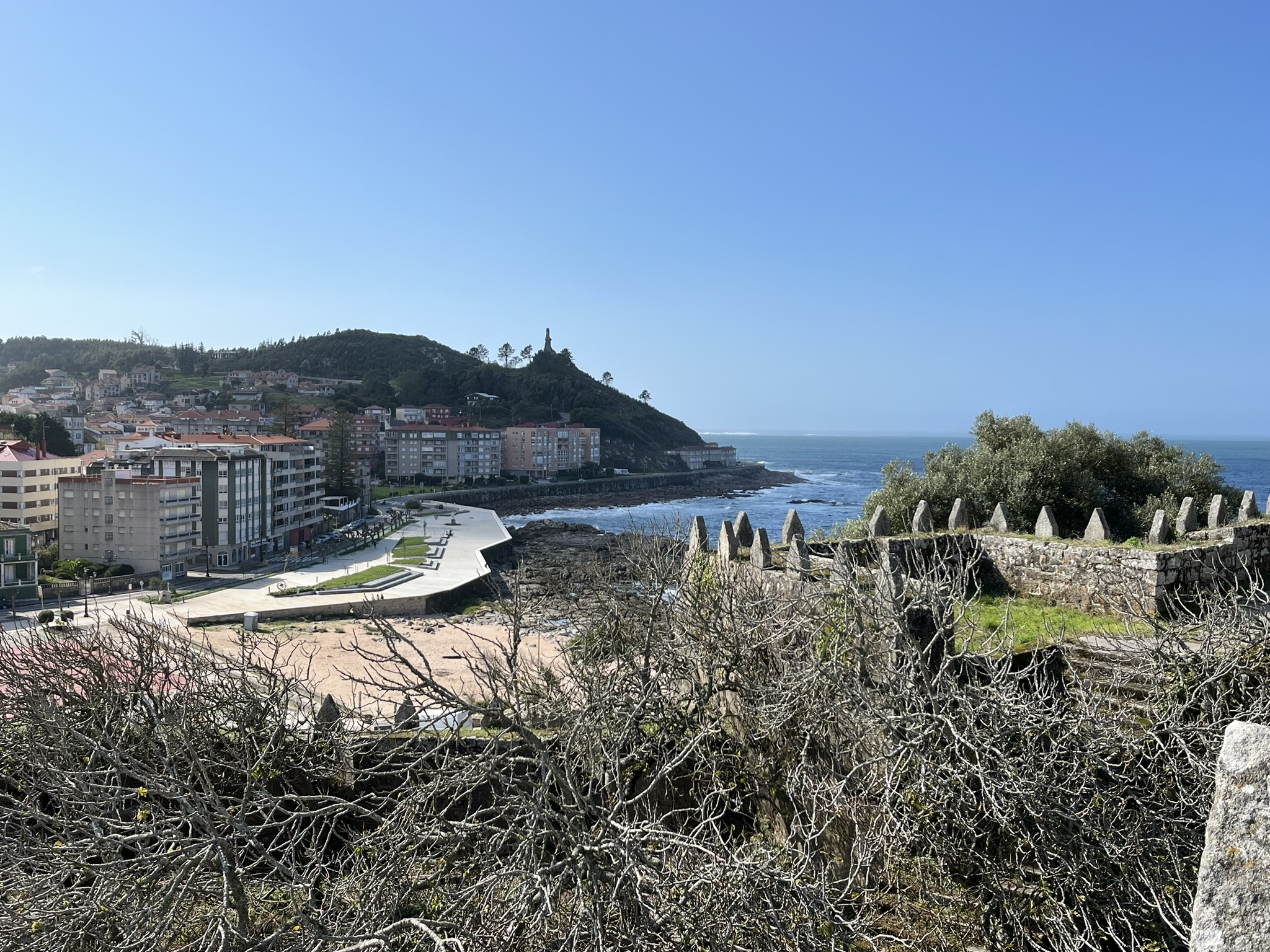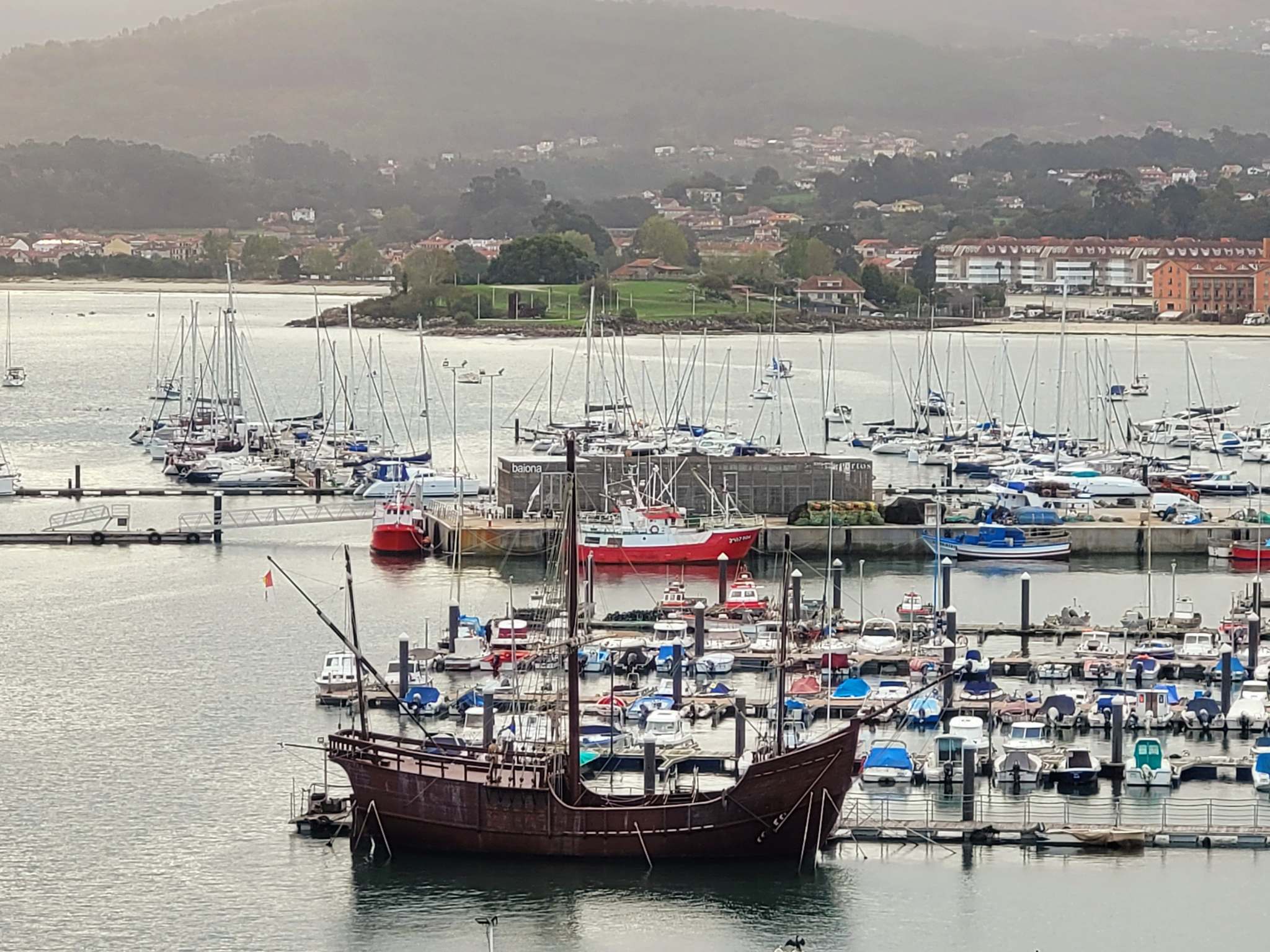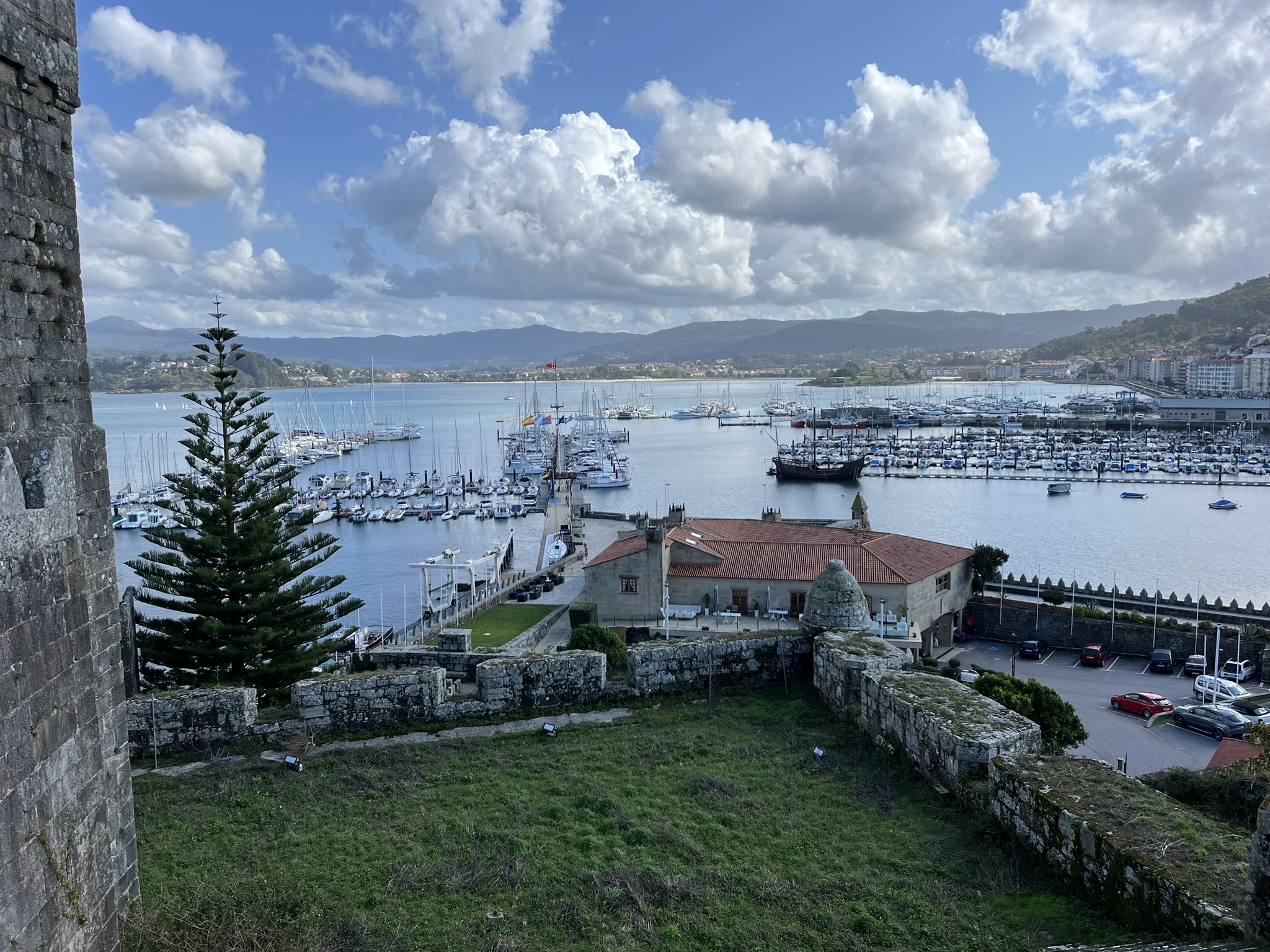 Bevor wir uns auf den Weg runter nach Portugal machen, möchten wir uns noch die kleine Stadt Baiona anschauen. Diese liegt oben links an der Ecke der Ria de Vigo, von der es von Galizien aus eine relativ gerade lange Küste runter bis nach Portugal geht. Im Moment gibt es irgendwie keinen Tag ohne irgendwelche Reparaturen. Heute ist es der Duschschlauch der eine undichte Stelle hat. Zum Glück gibt es in Vigo im Marineshop in der Nähe original den Gleichen zu kaufen. Der Skipper kann es kaum glauben und wir können bald darauf losfahren. Es sind nur 10sm bis Baiona wo es eine schöne Ankerbucht neben dem Hafen gibt. Da das Wetter ausnahmsweise mal trocken und sonnig ist, geht es nach dem Ankern direkt noch in den Ort auf ein Eis und einen kleinen Stadtbummel durch die Altstadt. Es ist wirklich nett hier, die üblichen kleinen Gässchen mit Restaurants und Bars. Wir haben inzwischen schon so viele Altstädte gesehen, aber jede hat ihren eigenen Charme und eigenen Stil. Am nächsten Morgen geht es dann beim Skipper los, ein Infekt breitet sich aus, und führt zu einem Tag komplettem Ausfall. Trotzdem schaffen wir es am Tag danach noch einen kleinen Bummel um das sehenswerte alte Castelo de Monterreal. Das ist ein sehr altes aber gut erhaltenes Schloss mit einem schicken Hotel in der Mitte der Mauern. Und oben auf den Burgmauern kann man einmal herum laufen und hat einen guten Blick. Im Hafen neben dem Schloss ist übrigens ein Nachbau des berühmten Segelschiffes, der Pinta. Damit ist Martín Alonso vor über 500 Jahren mit Columbus und zwei anderen Schiffen nach Amerika gesegelt. Auf dem Rückweg 1493 kam er als erster in Baiona mit der Pinta an, und konnte die Nachricht von der neuen Welt zuerst hier verkünden. Das Schiff ist nur 20m lang und wirkt insgesamt eher zerbrechlich. Ein Wunder, was die Seeleute unter den damaligen Bedingungen damit leisten konnten.