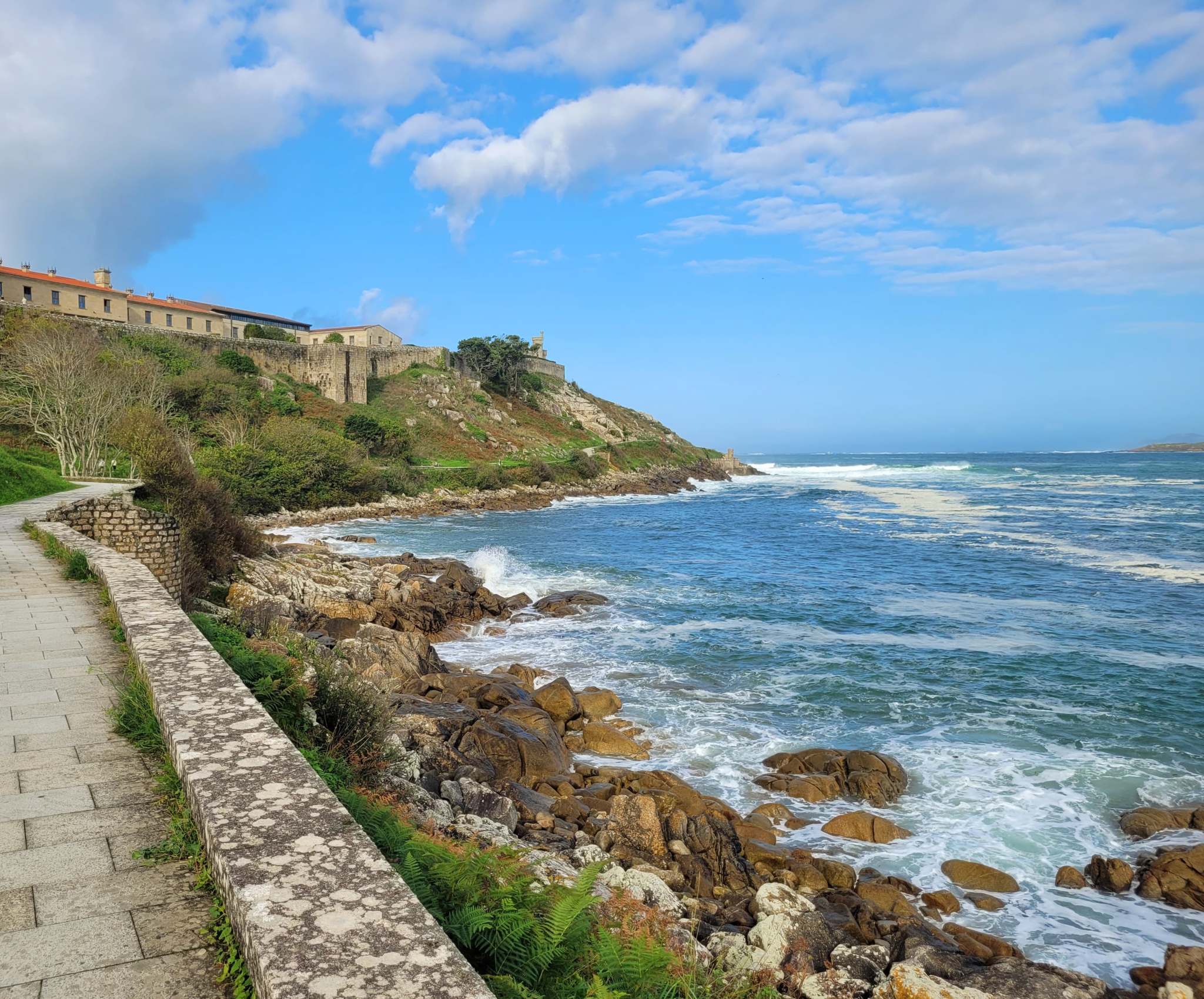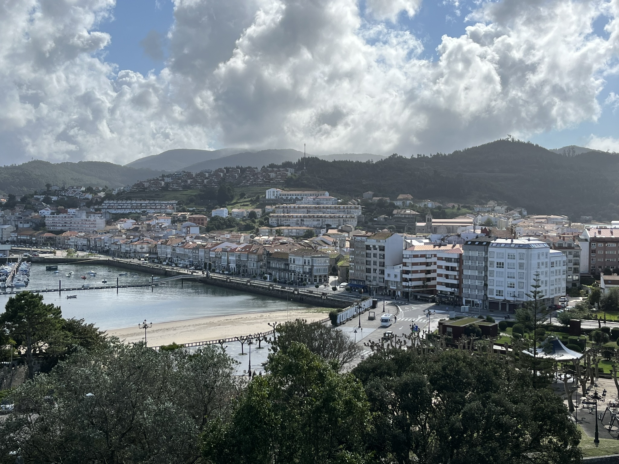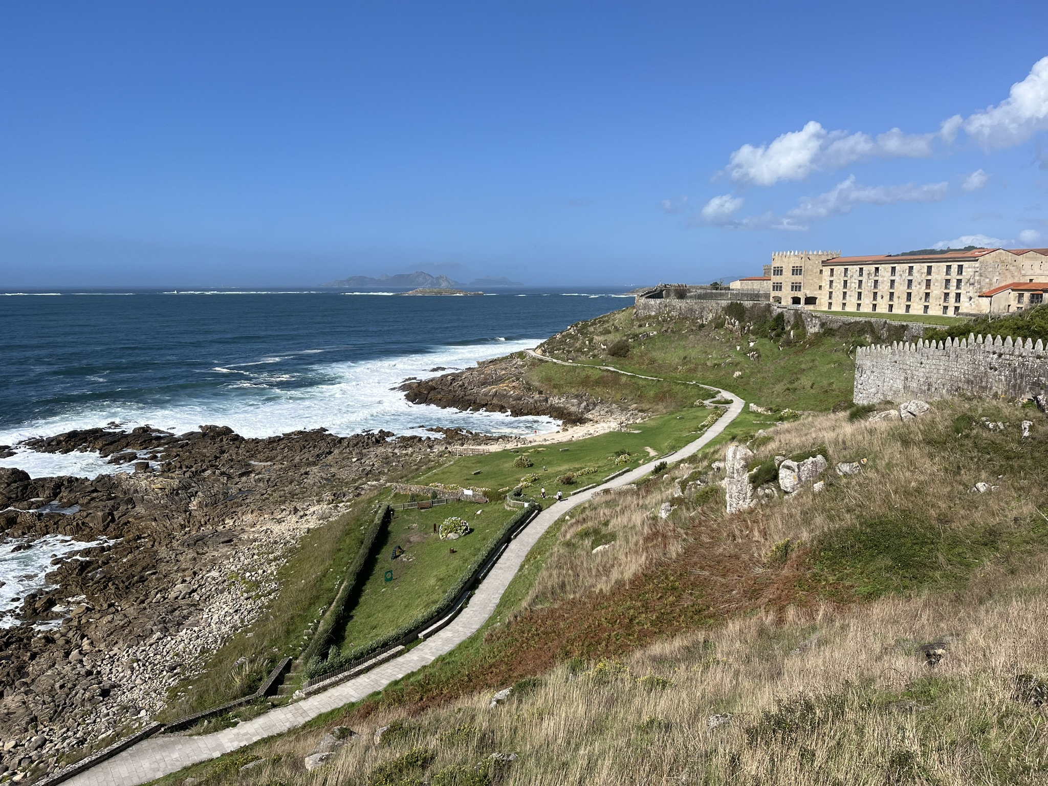 Bevor wir uns auf den Weg runter nach Portugal machen, möchten wir uns noch die kleine Stadt Baiona anschauen. Diese liegt oben links an der Ecke der Ria de Vigo, von der es von Galizien aus eine relativ gerade lange Küste runter bis nach Portugal geht. Im Moment gibt es irgendwie keinen Tag ohne irgendwelche Reparaturen. Heute ist es der Duschschlauch der eine undichte Stelle hat. Zum Glück gibt es in Vigo im Marineshop in der Nähe original den Gleichen zu kaufen. Der Skipper kann es kaum glauben und wir können bald darauf losfahren. Es sind nur 10sm bis Baiona wo es eine schöne Ankerbucht neben dem Hafen gibt. Da das Wetter ausnahmsweise mal trocken und sonnig ist, geht es nach dem Ankern direkt noch in den Ort auf ein Eis und einen kleinen Stadtbummel durch die Altstadt. Es ist wirklich nett hier, die üblichen kleinen Gässchen mit Restaurants und Bars. Wir haben inzwischen schon so viele Altstädte gesehen, aber jede hat ihren eigenen Charme und eigenen Stil. Am nächsten Morgen geht es dann beim Skipper los, ein Infekt breitet sich aus, und führt zu einem Tag komplettem Ausfall. Trotzdem schaffen wir es am Tag danach noch einen kleinen Bummel um das sehenswerte alte Castelo de Monterreal. Das ist ein sehr altes aber gut erhaltenes Schloss mit einem schicken Hotel in der Mitte der Mauern. Und oben auf den Burgmauern kann man einmal herum laufen und hat einen guten Blick. Im Hafen neben dem Schloss ist übrigens ein Nachbau des berühmten Segelschiffes, der Pinta. Damit ist Martín Alonso vor über 500 Jahren mit Columbus und zwei anderen Schiffen nach Amerika gesegelt. Auf dem Rückweg 1493 kam er als erster in Baiona mit der Pinta an, und konnte die Nachricht von der neuen Welt zuerst hier verkünden. Das Schiff ist nur 20m lang und wirkt insgesamt eher zerbrechlich. Ein Wunder, was die Seeleute unter den damaligen Bedingungen damit leisten konnten.