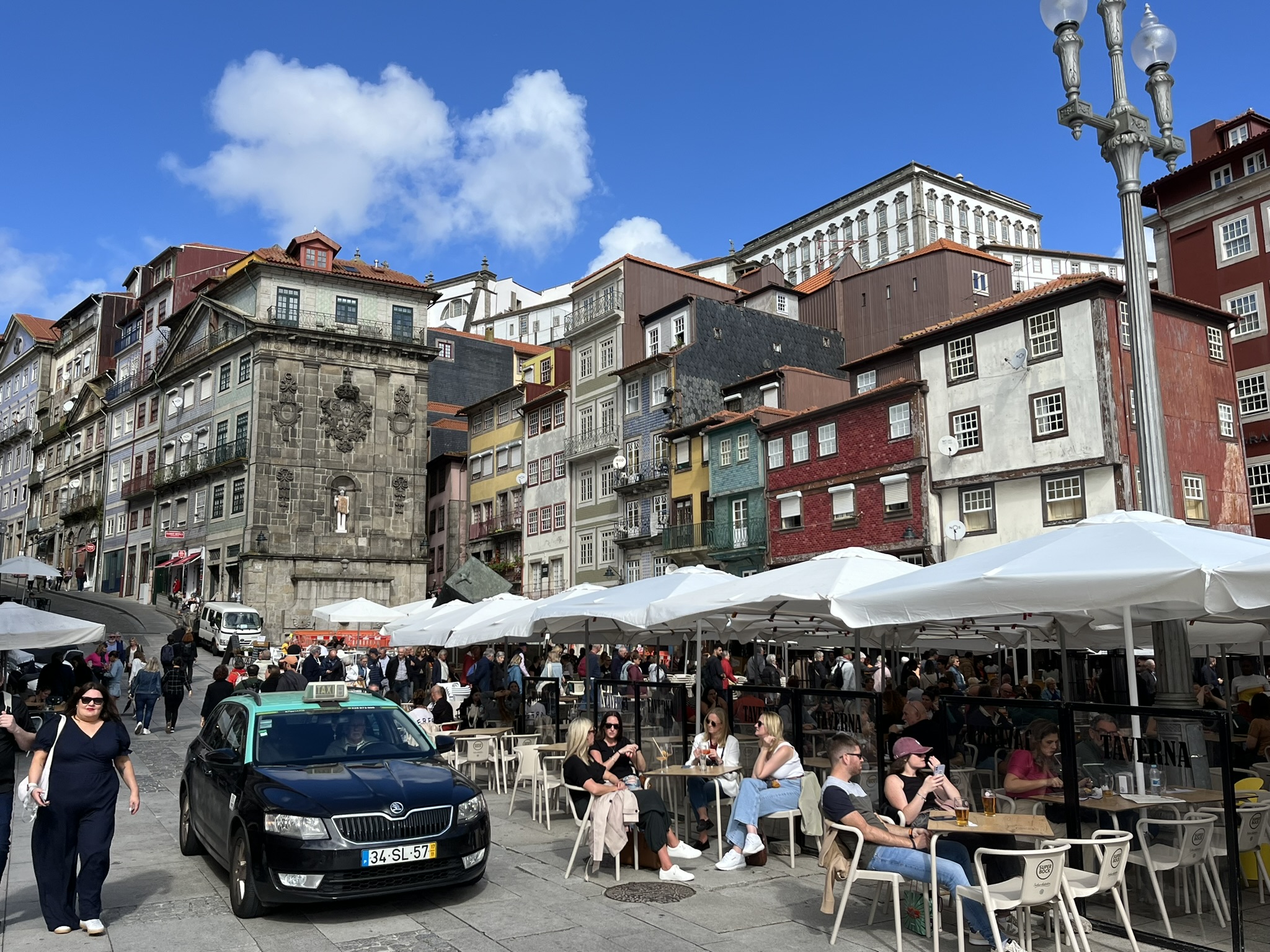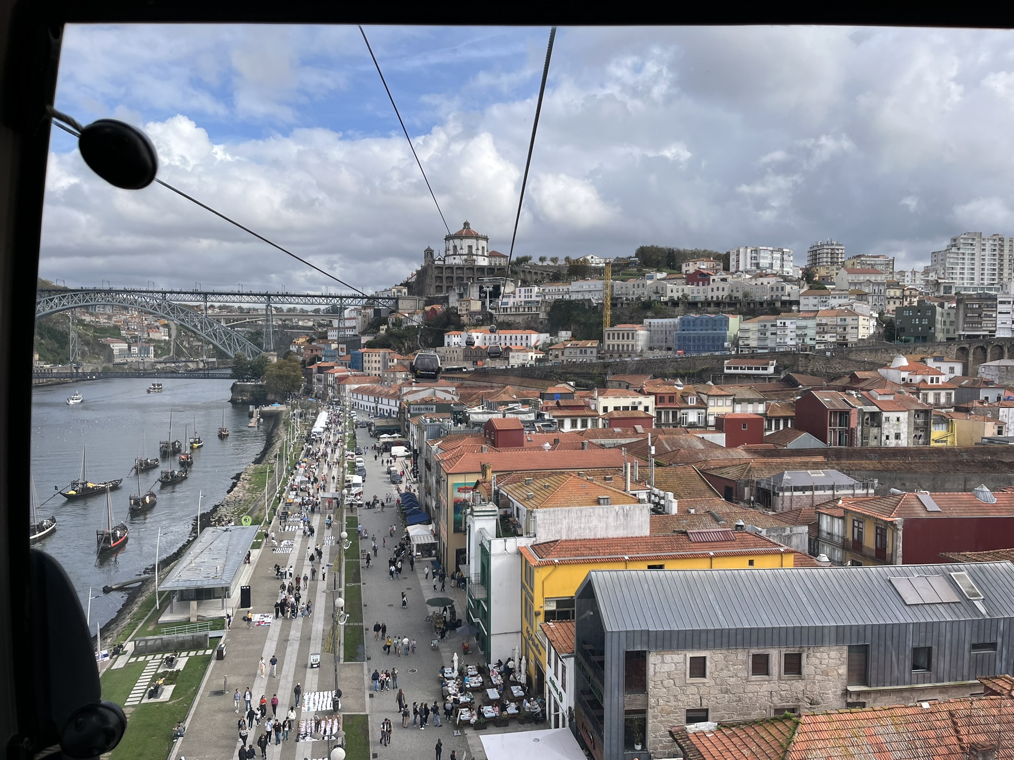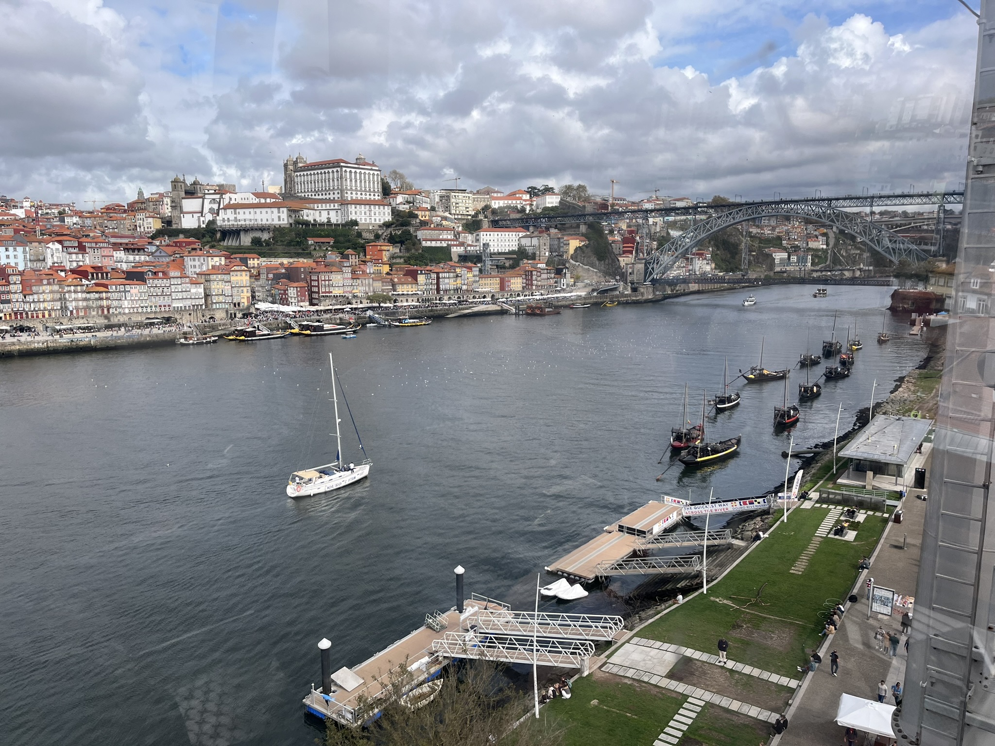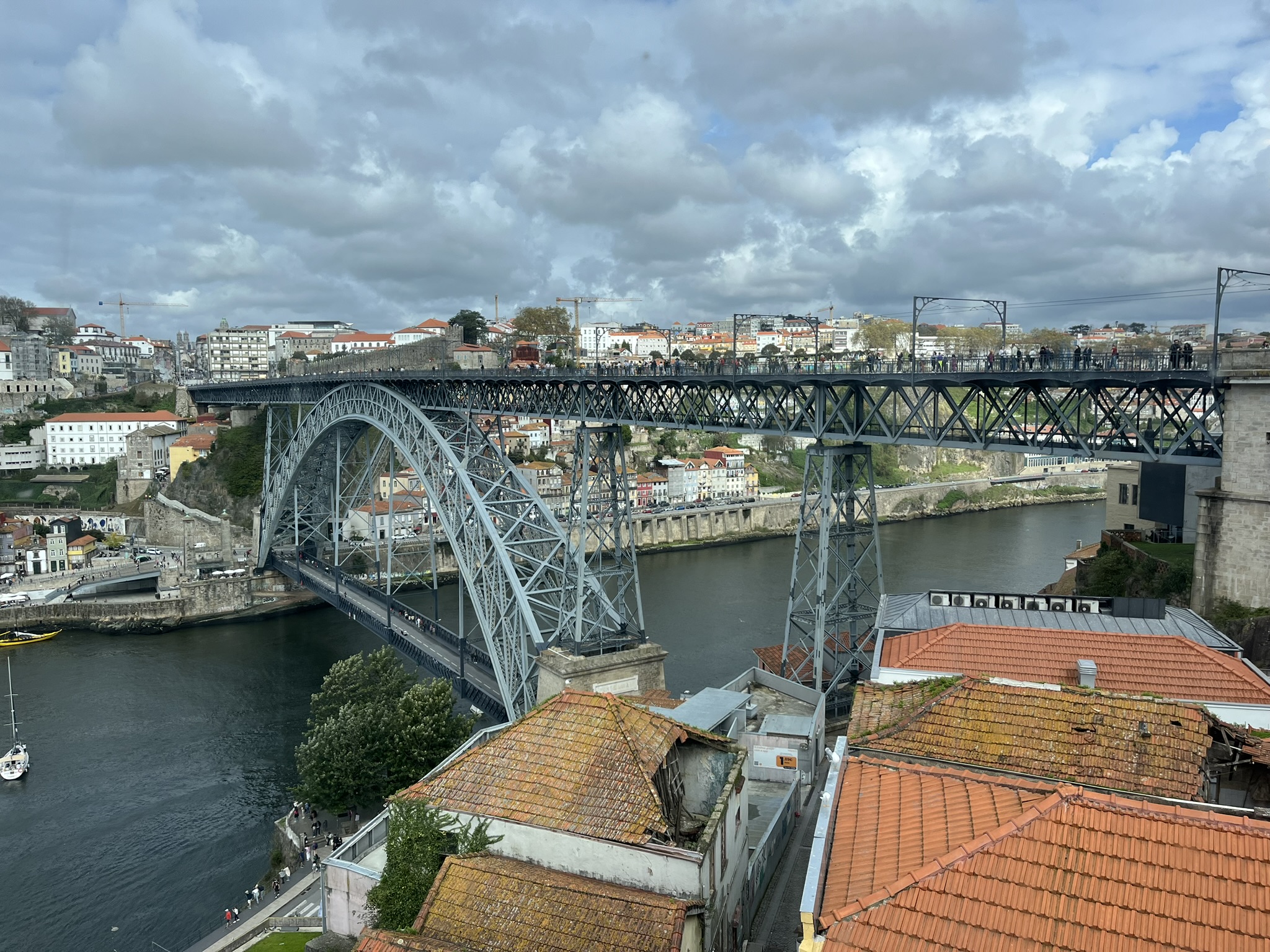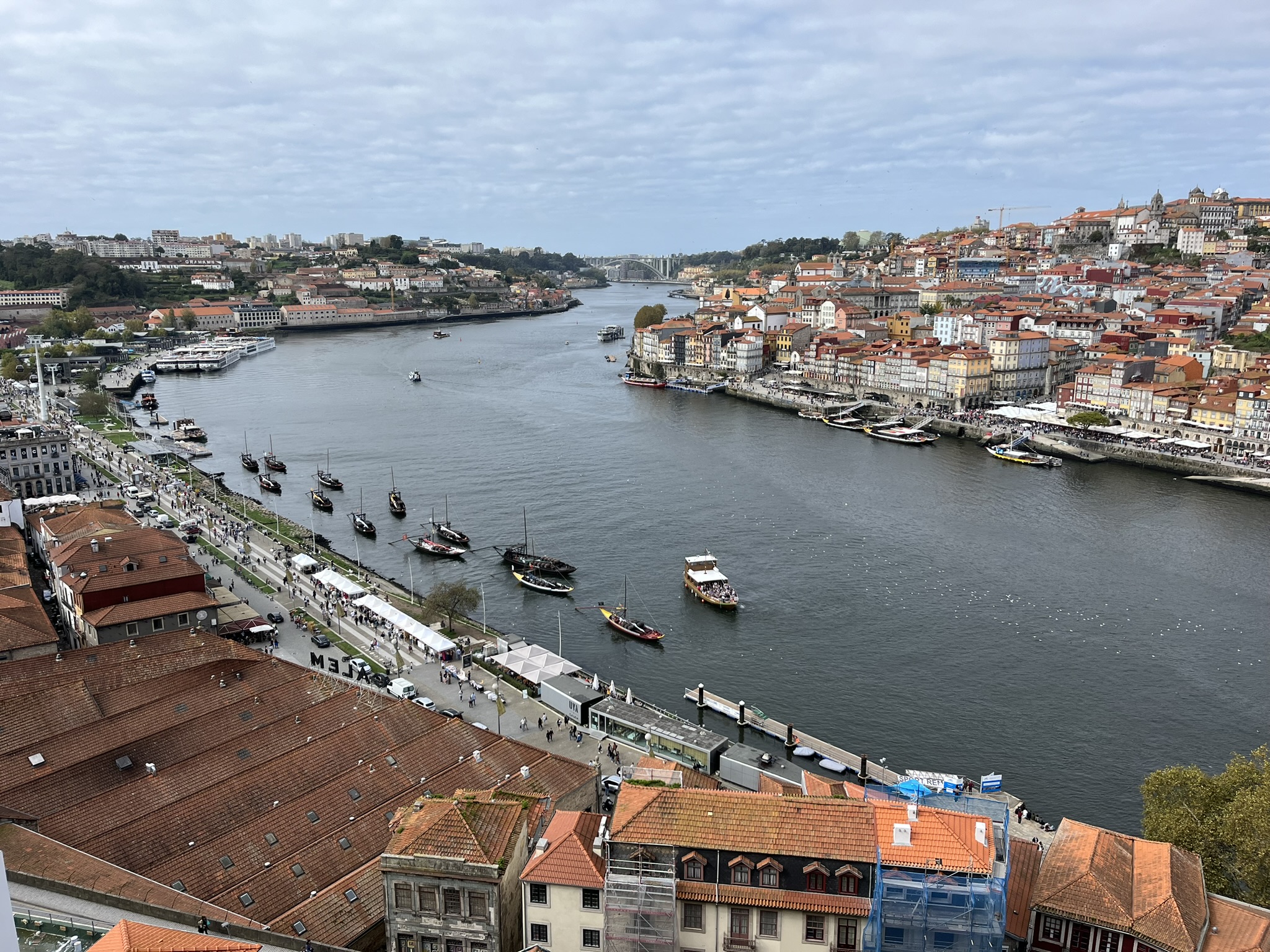 Das Wetter ist schön, und wir überqueren den Fluss mit dem Beiboot um von dort in die 2.größte Stadt Portugals zu gelangen. Was wir dort sehen, hätten wir wirklich nicht erwartet. Wir kommen nach ein paar km in die Altstadt über eine recht große Promenade. Diese ist übervölkert mit tausenden von Besuchern und Touristen die sich dort entlangschieben oder in einem der unzähligen Restaurants sitzen. Und das mitten im Oktober. Am Ende der Promenade ist die Ponte Luís I, eine Brücke aus dem 19. Jahrhundert entworfen von Gustav Eifel. Wir schwenken etwas abseits in die Altstadt ein und sind wirklich angetan. Sehr schön, viele Häuser mit den typischen Fliesen verziert und alles ist eine Mischung aus alt und ursprünglich. Hier lässt der Trubel bereits deutlich nach. Wir wandern etwas den Berg hoch und kommen von dort in die geschäftige Oberstadt. Relativ alte Einkaufsstraßen, pompöse Gebäude wie der von innen komplett geflieste Bahnhof und eine Menge Kirchen natürlich. Leider ist hier oben eine Großbaustelle neben der anderen, so dass es laut und nicht sehr einladend ist. Wir flüchten wieder nach unten zum Fluss in die Altstadt wo es zwar voller aber nicht so laut ist. Wir gönnen uns in einem etwas am Rande gelegenen Kaffee einen Lunch und als Nachtisch das typisch portugiesische Puddingtörtchen Pasteis de Nata. Zurück am Boot lernen wir, dass es gar nicht so einfach ist an einem Boot was in der Strömung ankert mit dem Beiboot anzulanden. Von der Seite wie wir es normal gerne machen war es unmöglich, weil wir uns dort nicht festhalten konnten. Von hinten mussten wir dann mehrmals ansetzen, weil unser E-Motor kaum gegen die Strömung ankommt. Irgendwann waren wir dann an Bord und werden die Technik für das nächste Mal noch etwas verfeinern.