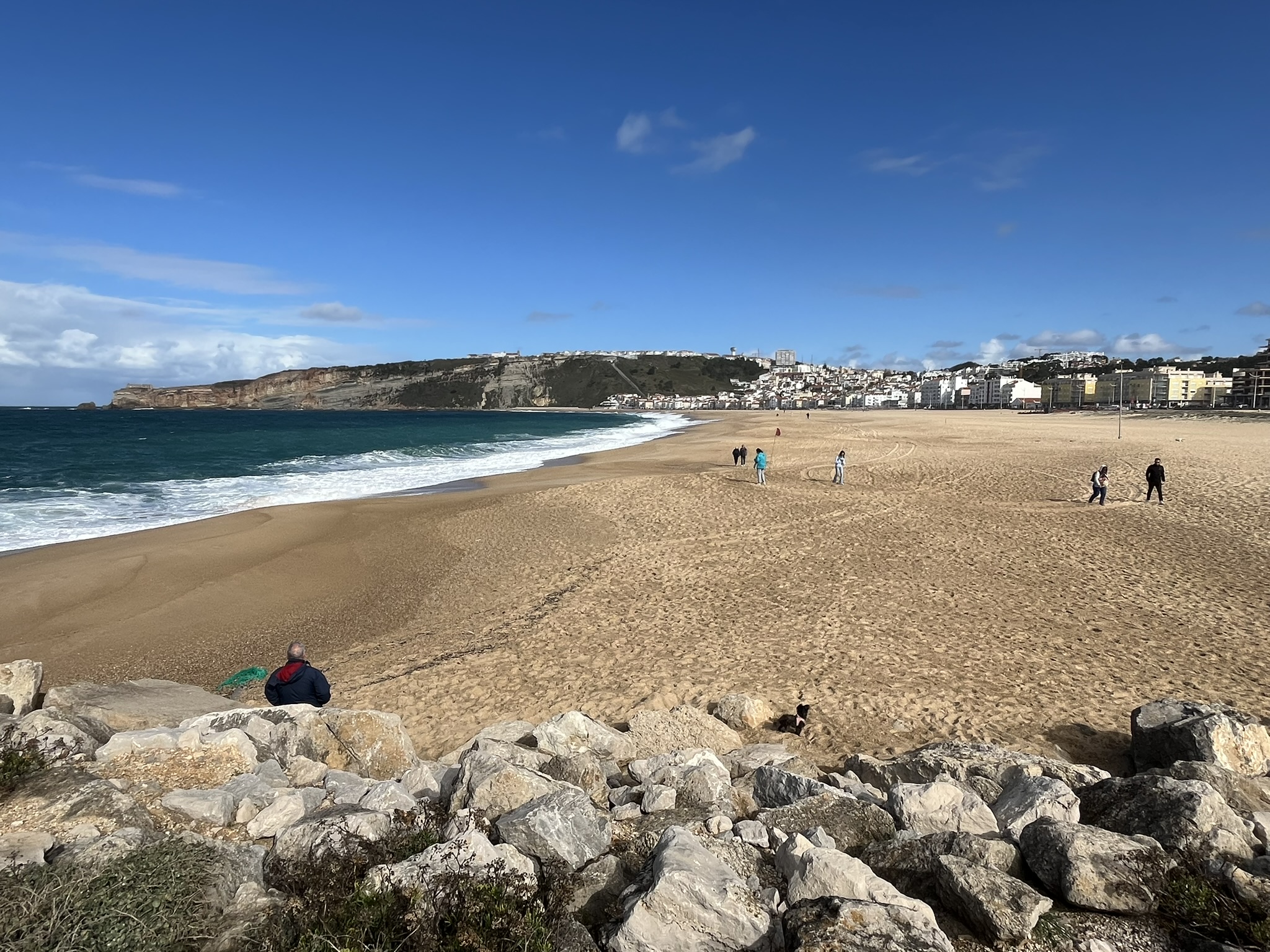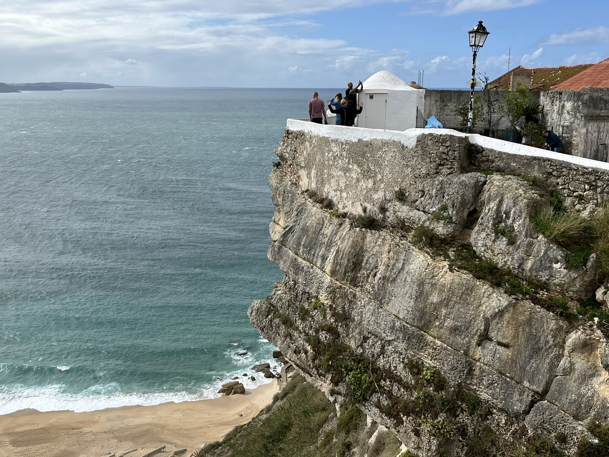 Nazare ist ein Örtchen welches rundherum riesige Strände mit Atlantikwellen hat. Besonders der Strand im Norden ist berühmt, weil dort bei entsprechenden Bedingungen die größten surfbaren Wellen der Welt entstehen. Das liegt an der Topographie unter Wasser vor dem Strand. Dort ist es relativ tief, und wird dann geführt durch einen Unterwassercanyon schnell flach was bei entsprechendem Schwell vom Atlantik zu riesigen Wellen führt. Der offizielle Weltrekord an dieser Stelle liegt bei einer abgesurften 28m hohen Welle (siehe auch Youtube) im April 24 von einem Deutschen. Bei uns sind im Moment keine besonders hohen Wellen, was wir aber begrüßen. Sonst wäre es hier mit dem Segelboot mehr als ungemütlich.