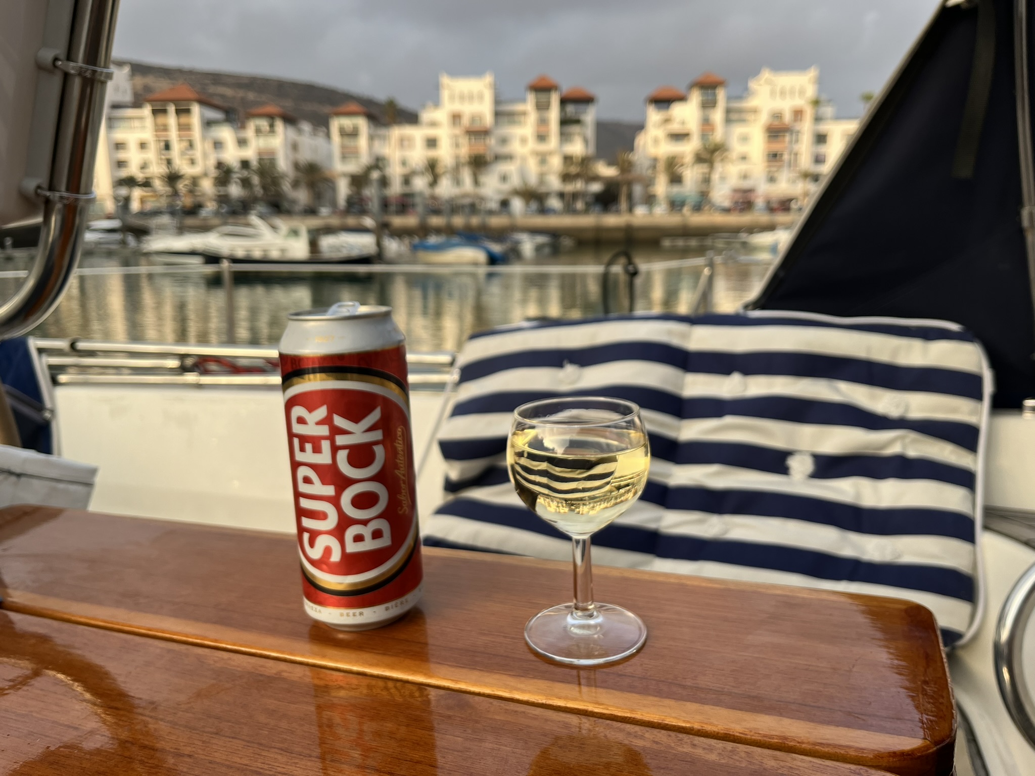 Direkt nach der Ankunft kommt der Zoll, die Polizei und sonstige Offizielle an Bord und machen es sich an Bord bequem. Wir füllen einige Formulare aus und für die Herren gibt es Feigen und Wasser. Drohnen sind in Marokko übrigens verboten und daher müssen wir unsere versiegeln lassen. Welcome to Marokko sagt abschließend der Zollbeamte, und haut schwungvoll die Stempel in die Pässe. Insgesamt eine sehr positive Erfahrung, höflich und schnell ging die Prozedur vorbei und wir sind offiziell eingereist. Am Abend machen wir noch einen kleinen Spaziergang und schlafen nach dem sehr leckeren Anlegerbierchen und Weinchen wie Steine.