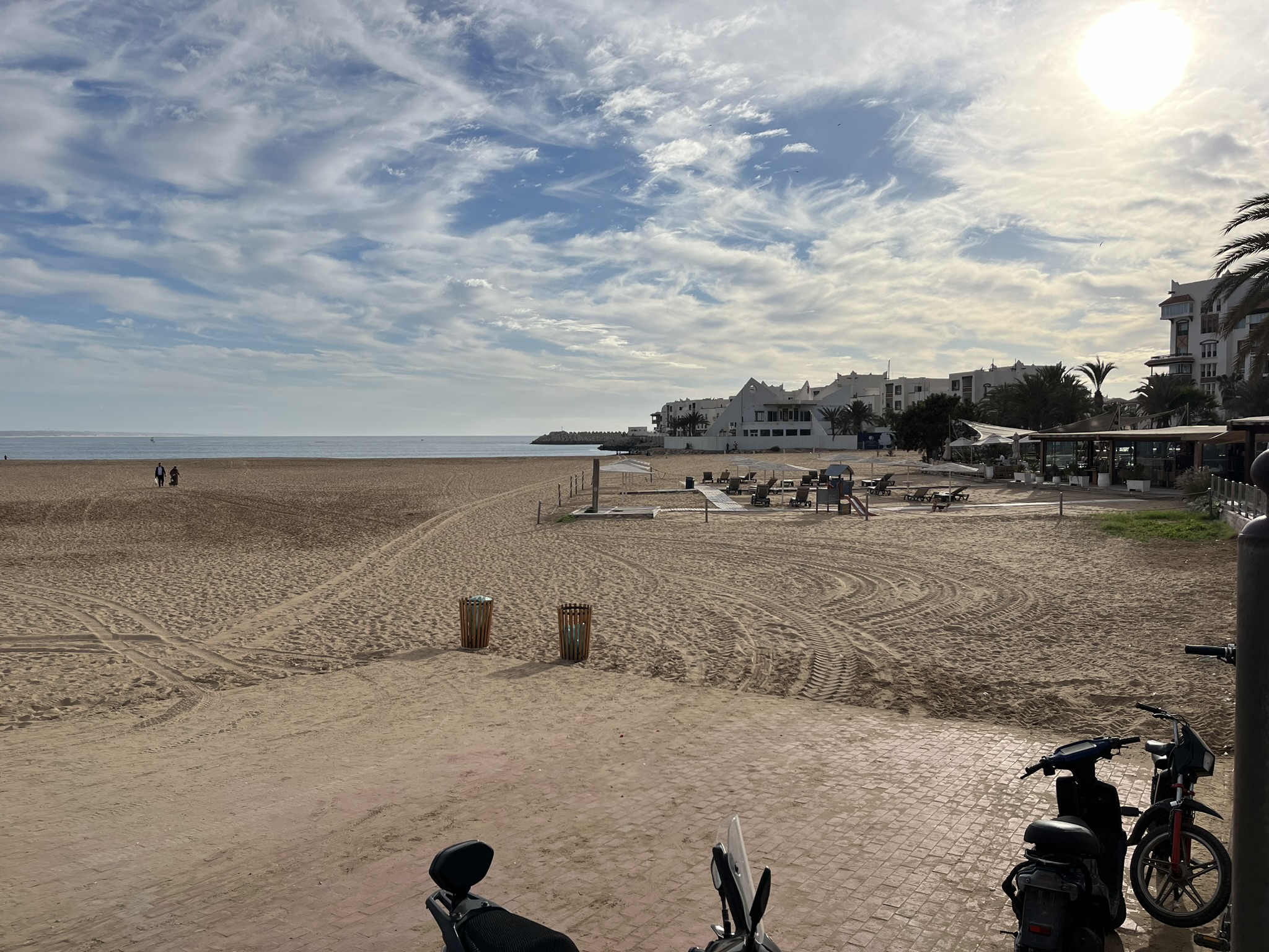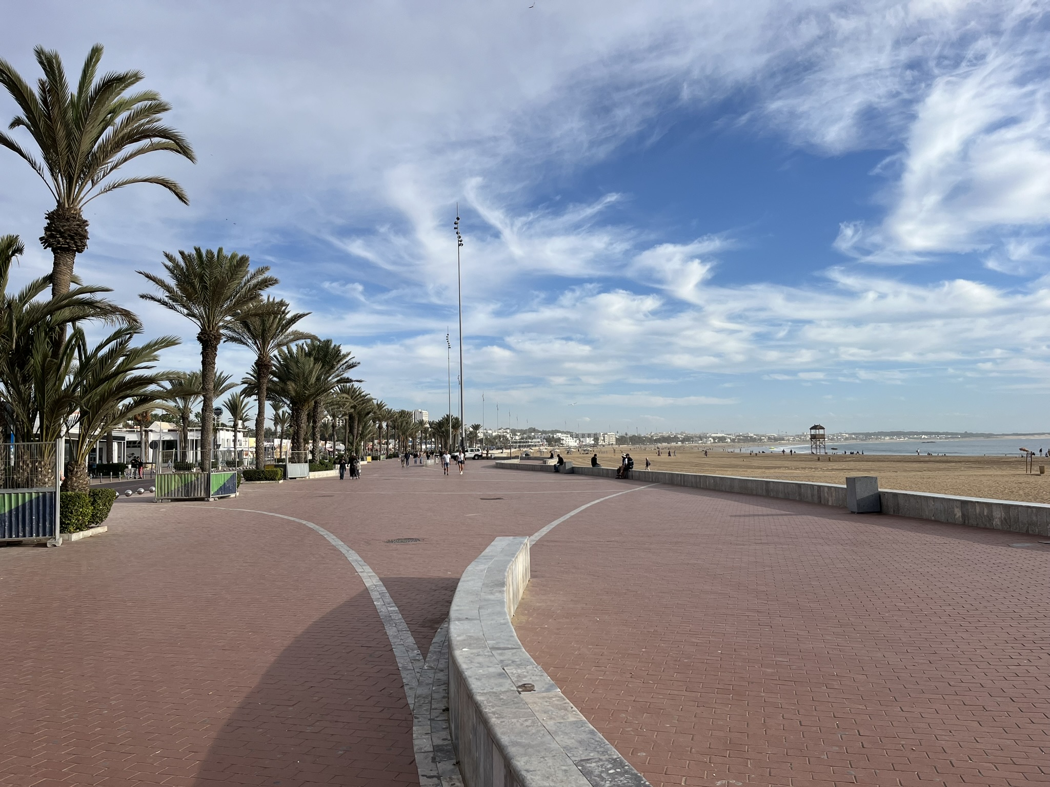 Zurück zu Agadir, die Stadt wird dominiert durch einen riesigen Strand mit kilometerlanger Promenade. Entsprechend sind viele Touristen da und die Stadt macht zumindest hier unten einen recht westlichen Eindruck. Trotzdem ist es natürlich ein muslimisches Land, in den Kaffees gibt es zum Beispiel grundsätzlich keinen Alkohol. Es gibt extreme Unterschiede im Auftreten der Frauen. Manche sind in Burkas komplett verhüllt, und andere meist jüngere Frauen komplett ohne Bedeckung in modernen Klamotten und bauchfrei.