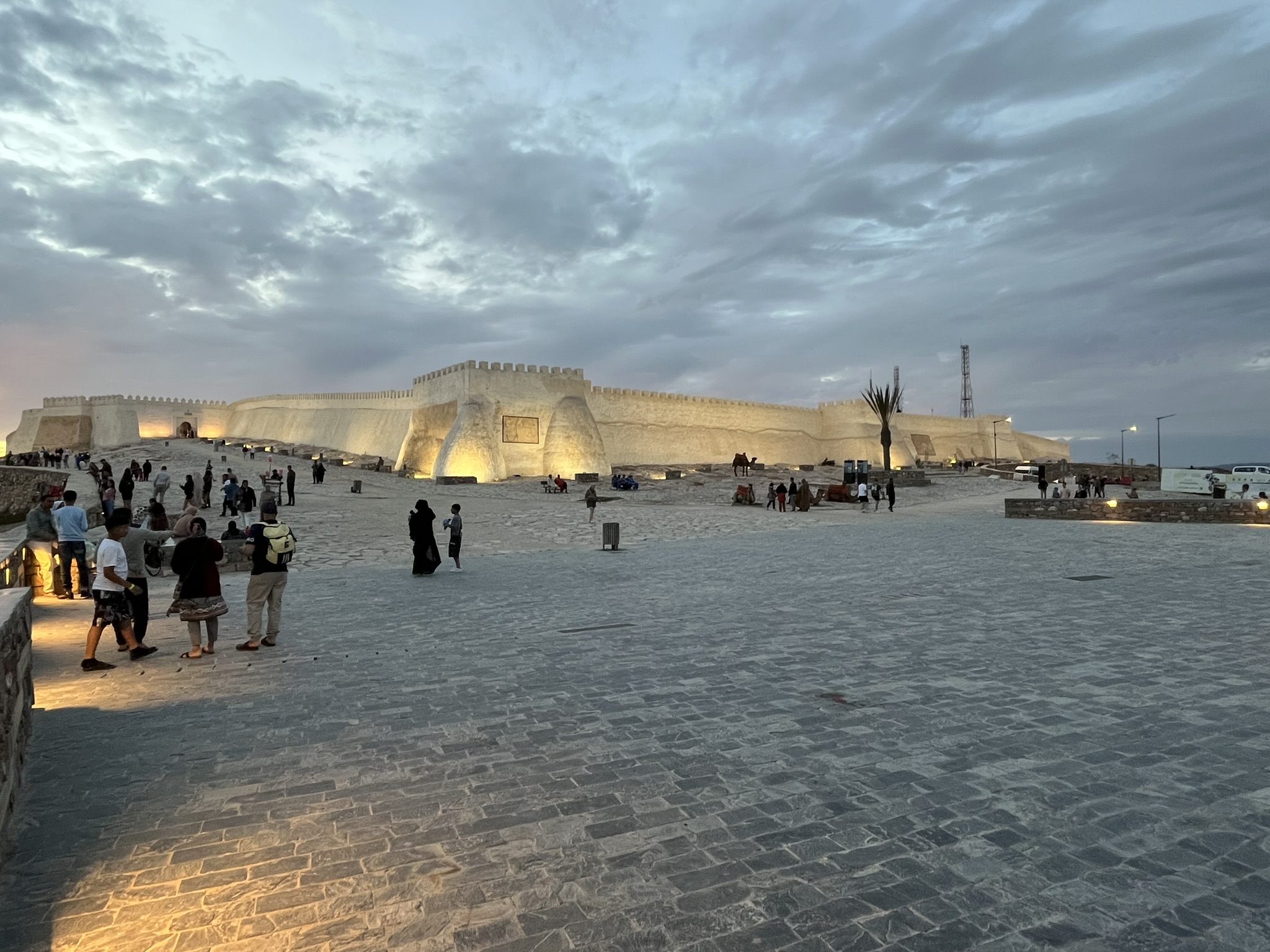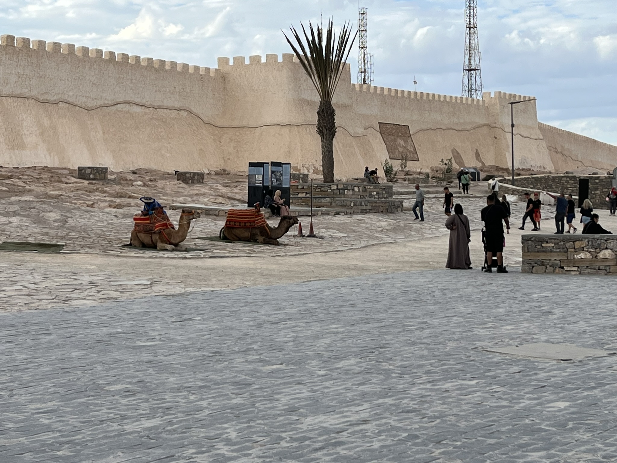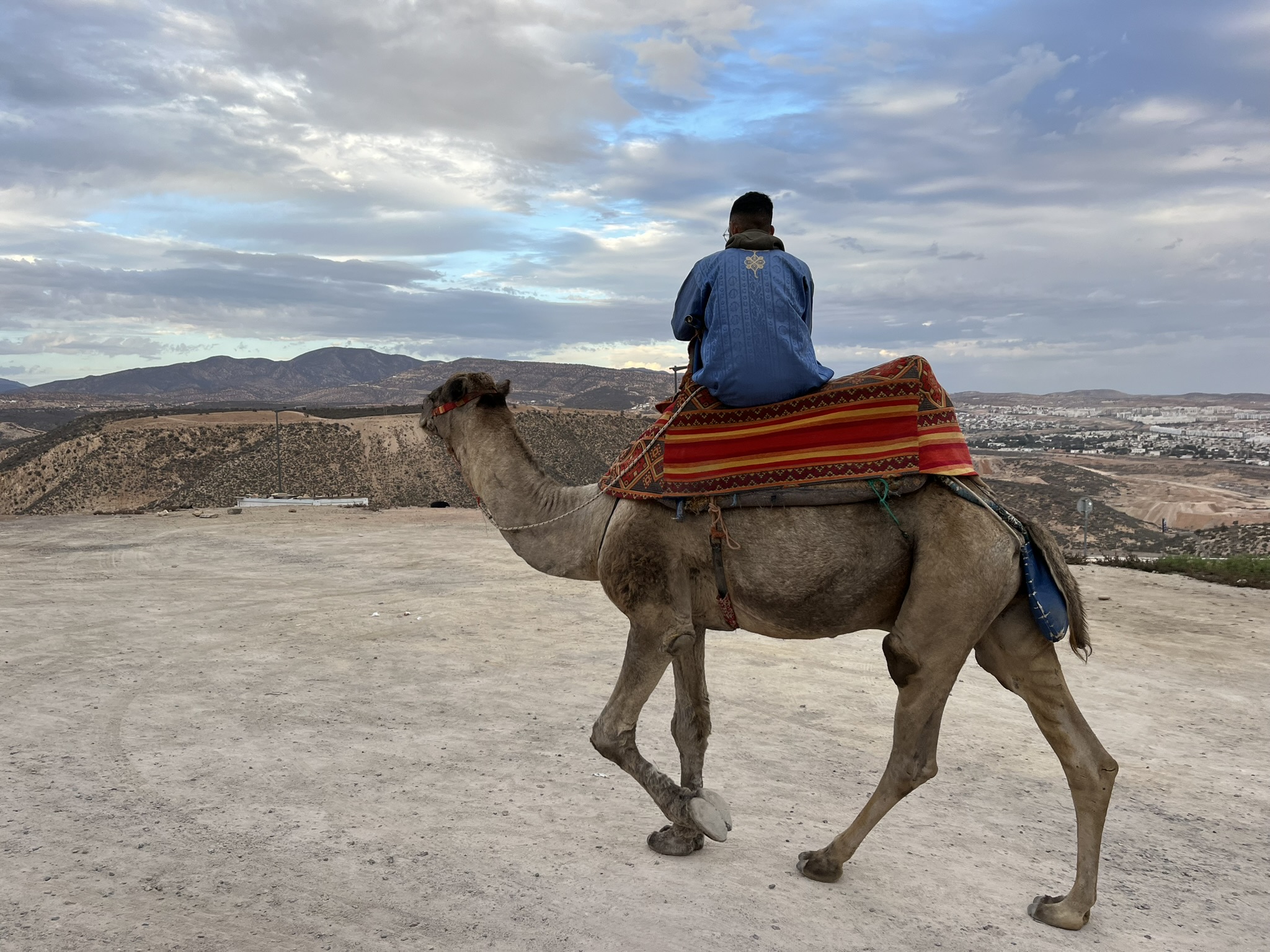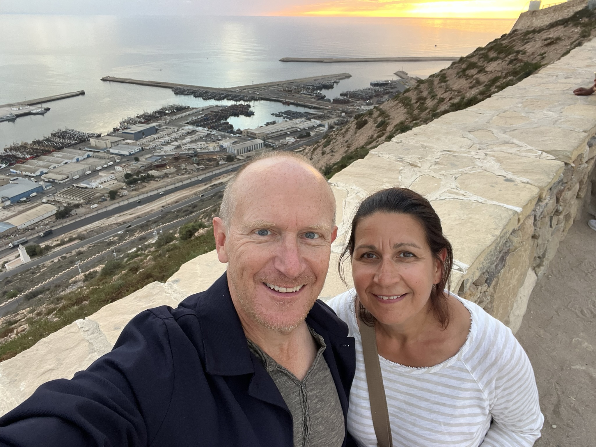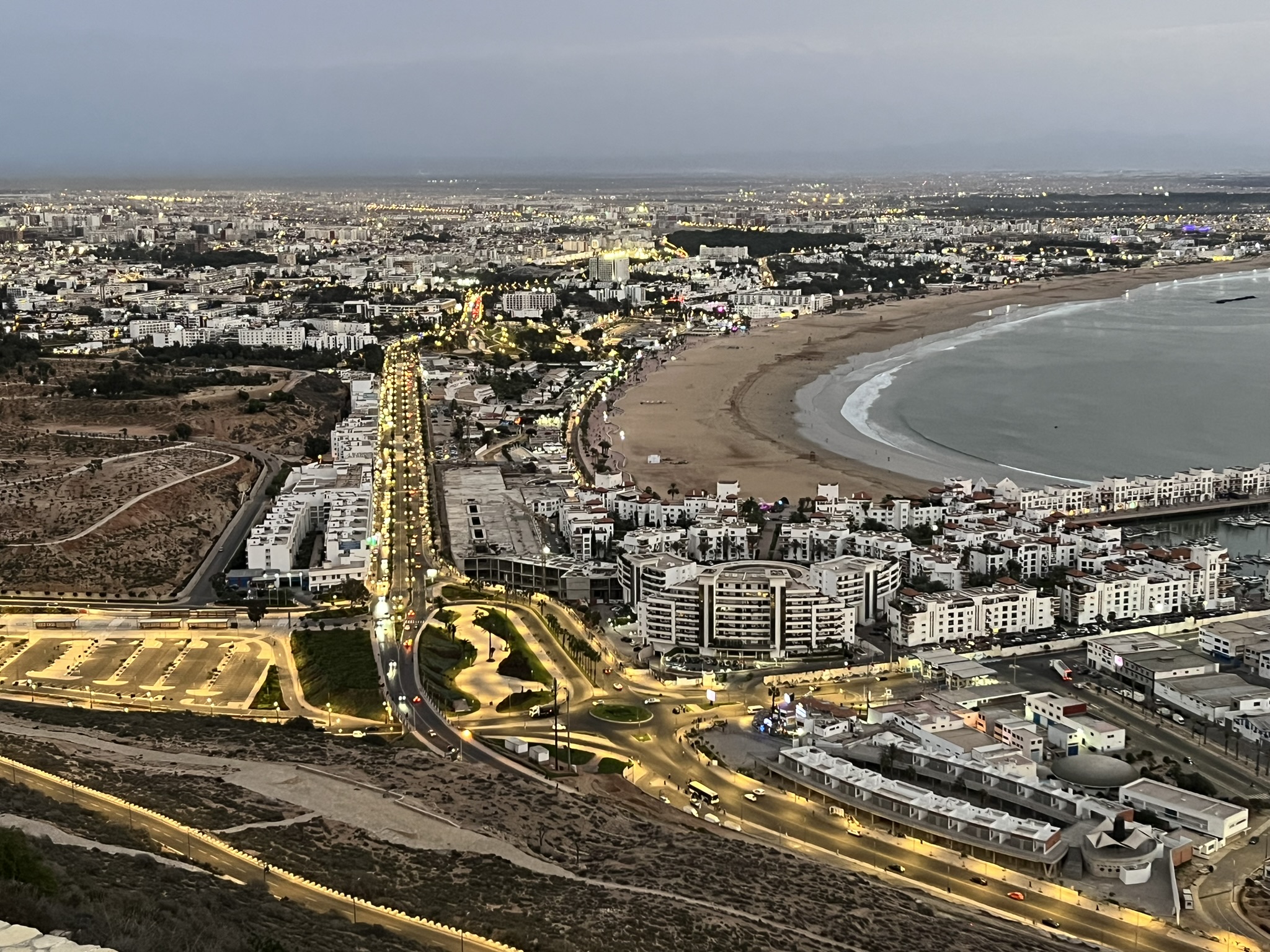 Am nächsten Tag fahren wir mit einer Seilbahn hoch auf den Berg (siehe Titelbild), wo eine Burg aus dem 16. Jahrhundert steht. 1960 gab es in Agadir ein Erdbeben mit über 15.000 Toten und die komplette Stadt, und auch die Burg wurden zerstört. Daher ist das meiste hier oben neu aufgebaut worden. Die Atmosphäre zum Sonnenuntergang ist aber schon sehr speziell. Am schönsten ist das Licht, wenn auf der einen Seite die Sonne hinter dem Meer untergeht und auf der anderen Seite die Lichter der Stadt angehen.