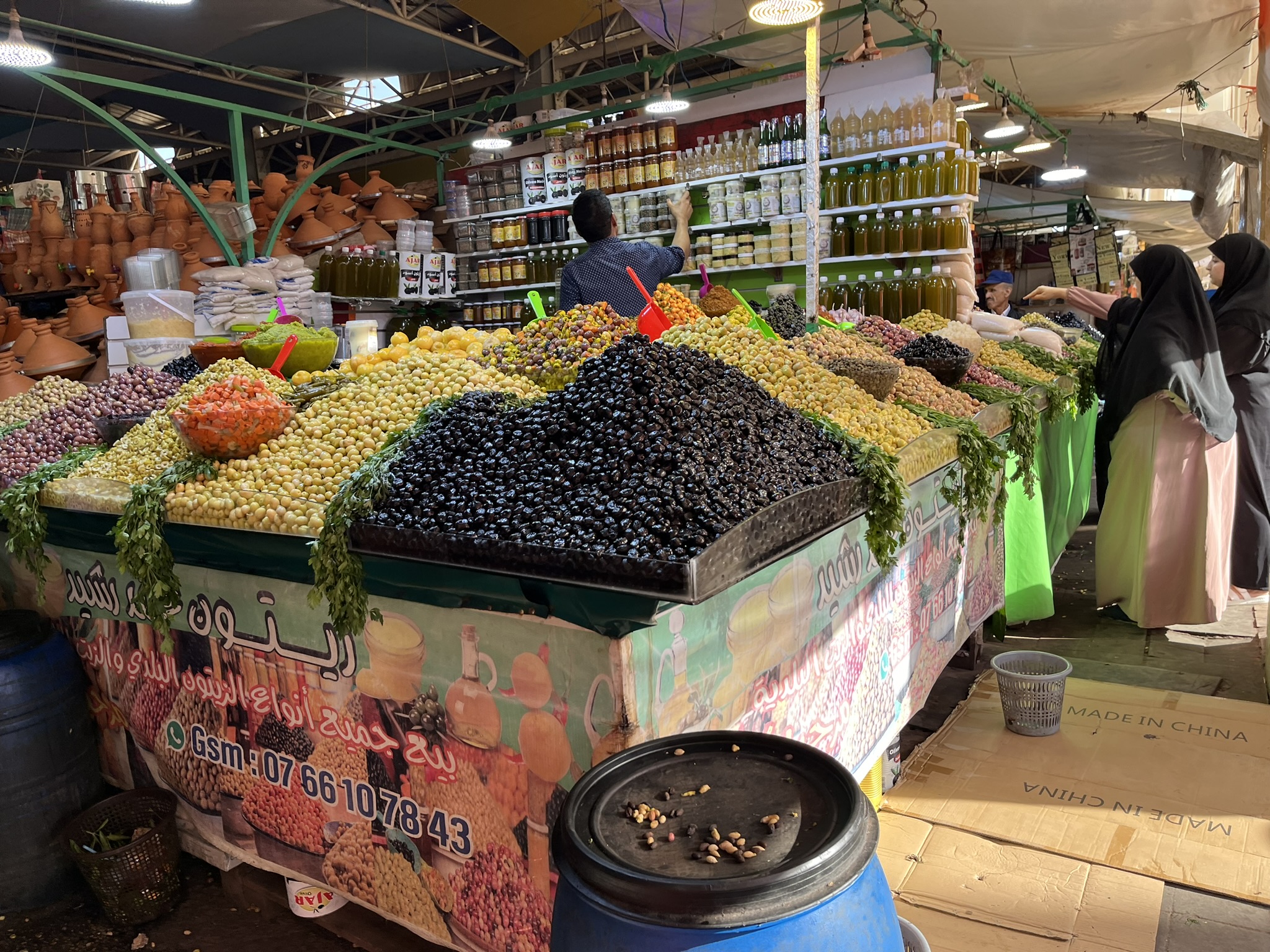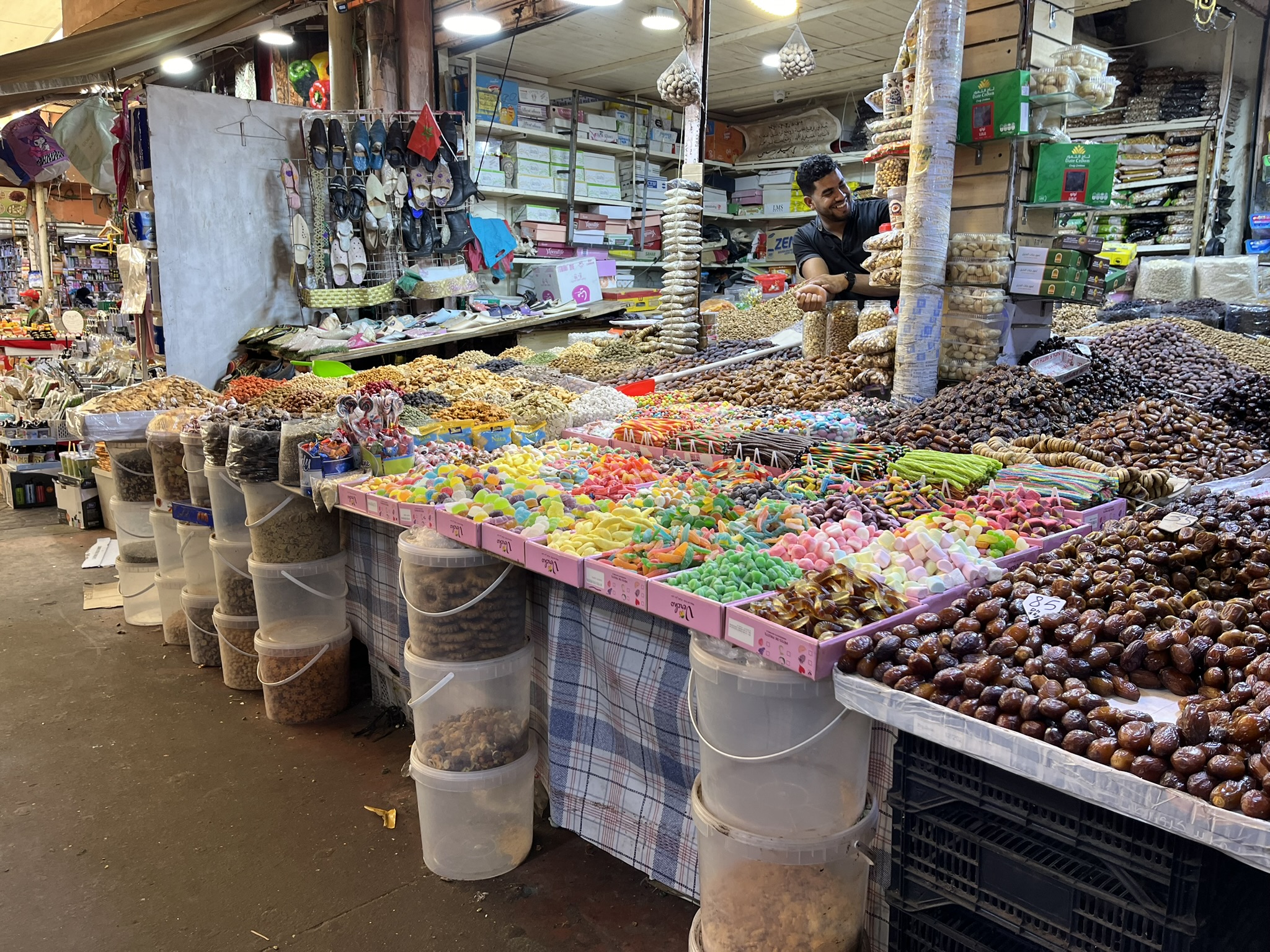 Jetzt wollen wir mal das wirkliche Marokko kennenlernen. Dafür bietet sich der sogenannte Souk an. Das ist ein riesiger Markt, in dem man laut Aussage der Kollegen am Hafen ALLES kaufen kann. Wir sind gespannt und marschieren los. Auf dem Weg dorthin lassen wir uns von einem Gewürzhändler in seinem Laden zu einem Minztee einladen. Der schmeckt nicht schlecht und wir müssen alle seine Produkte mal riechen und kosten. Natürlich kaufen wir ihm auch Minztee und eine spezielle Gewürzmischung ab. Der Markt schlägt dann alles bisher gesehene. Es sind hunderte von Ständen in einer Megahalle wo man wirklich alles für den täglichen Bedarf von Klamotten, Möbeln, Leckereien, alle Arten von Lebensmitteln, Elektronik, Schmuck usw kaufen kann. Wir erstehen eine neue Kaffeekanne, und probieren ein paar frittierte Snacks aus. Insgesamt ein ziemlicher Overflow an Eindrücken und Gerüchen. Wir werden natürlich überdurchschnittlich oft angequatscht aber insgesamt hält es sich im Rahmen. Andere Touris haben wir kaum gesehen. Wir fahren mit dem Taxi wieder zurück (2€!) und gönnen uns auf der Promenade noch ein Eis.