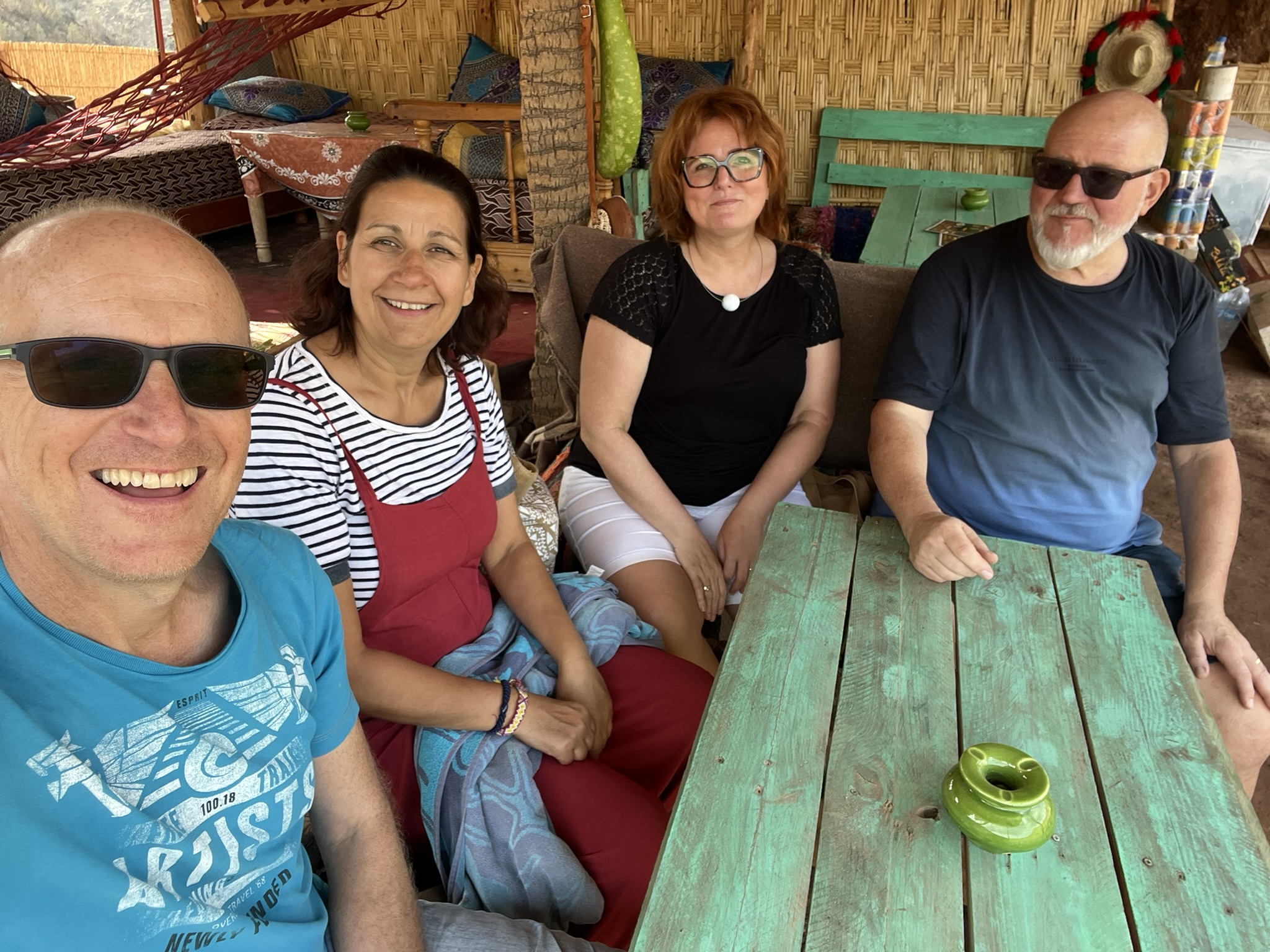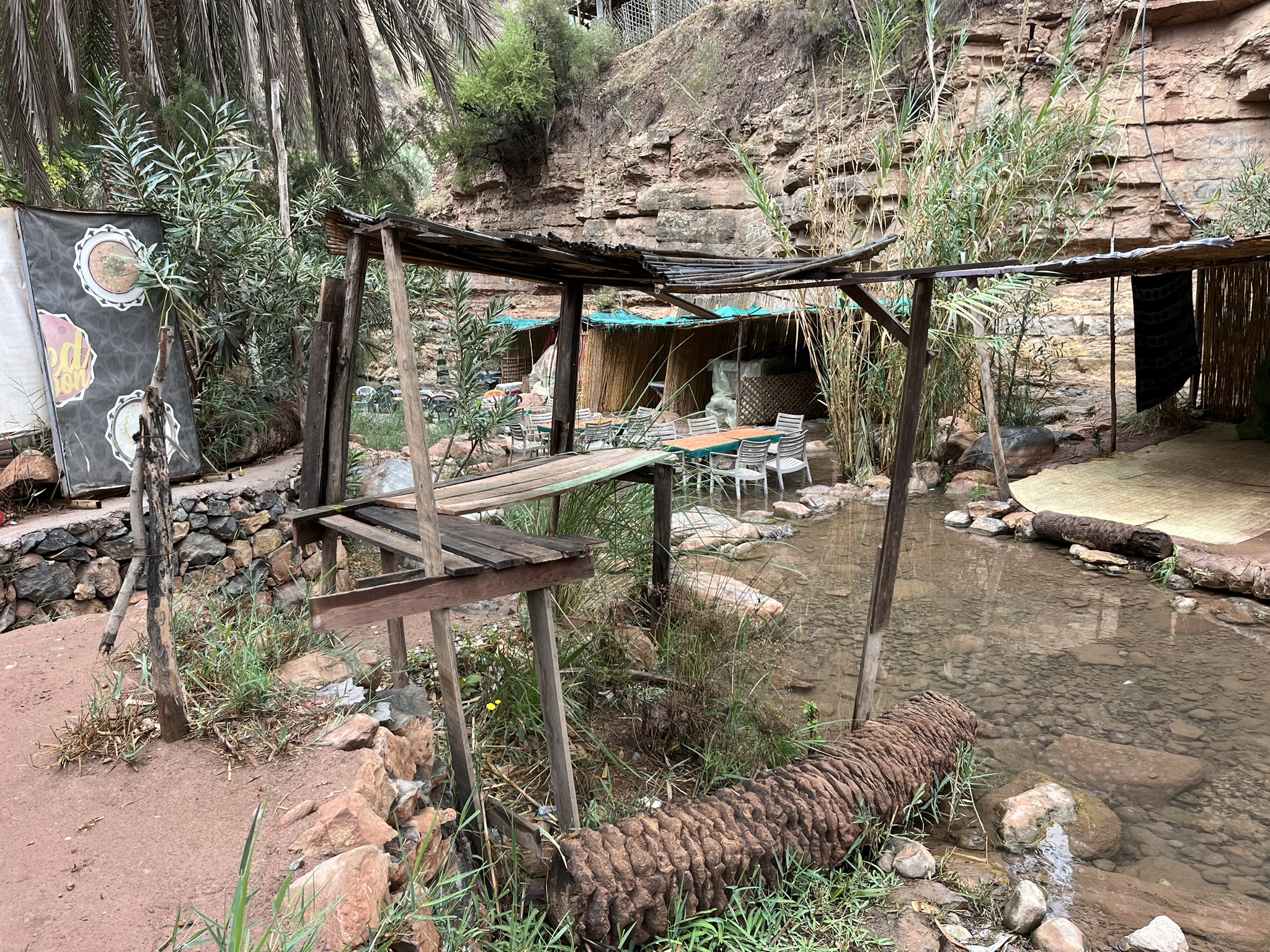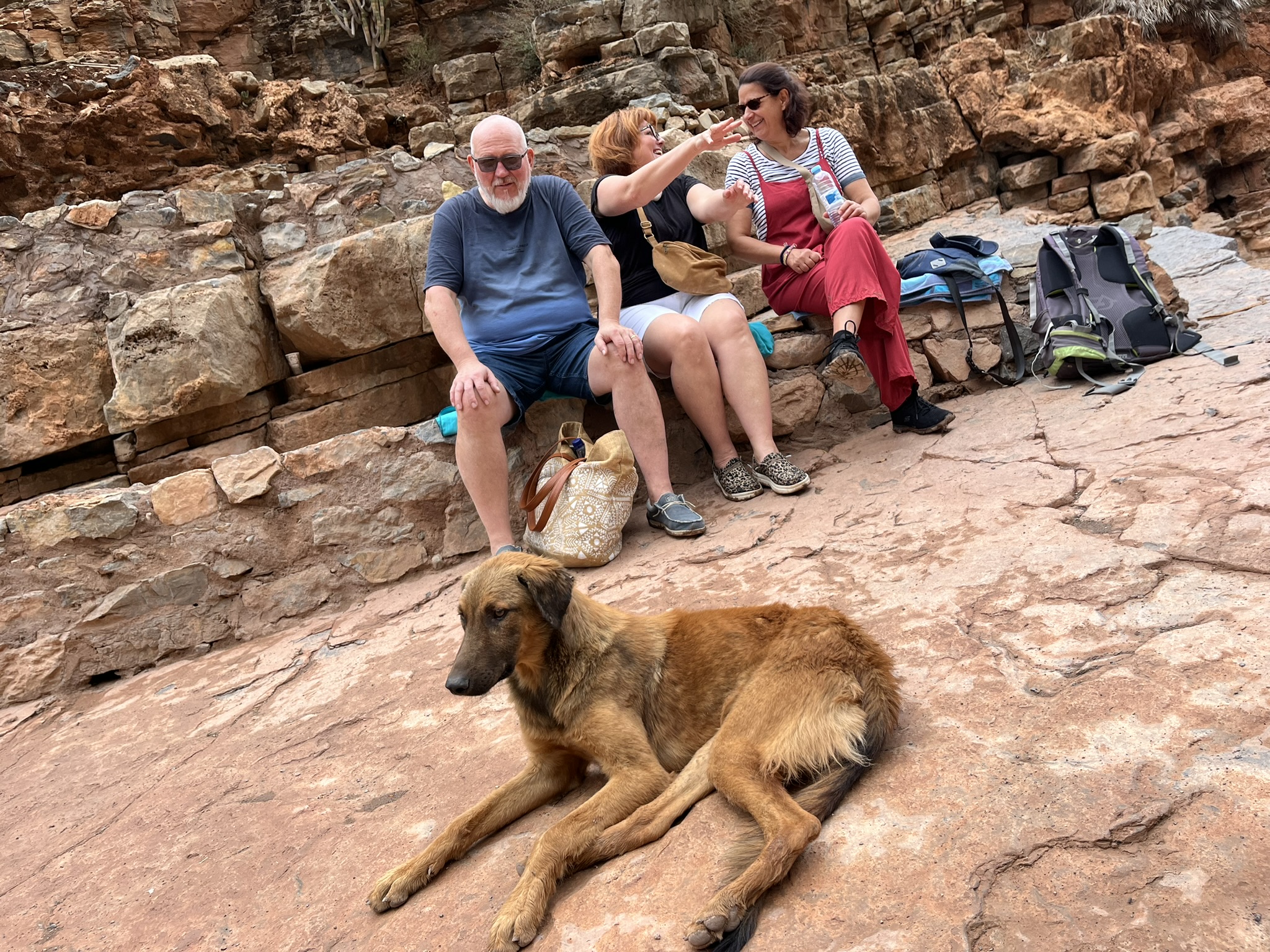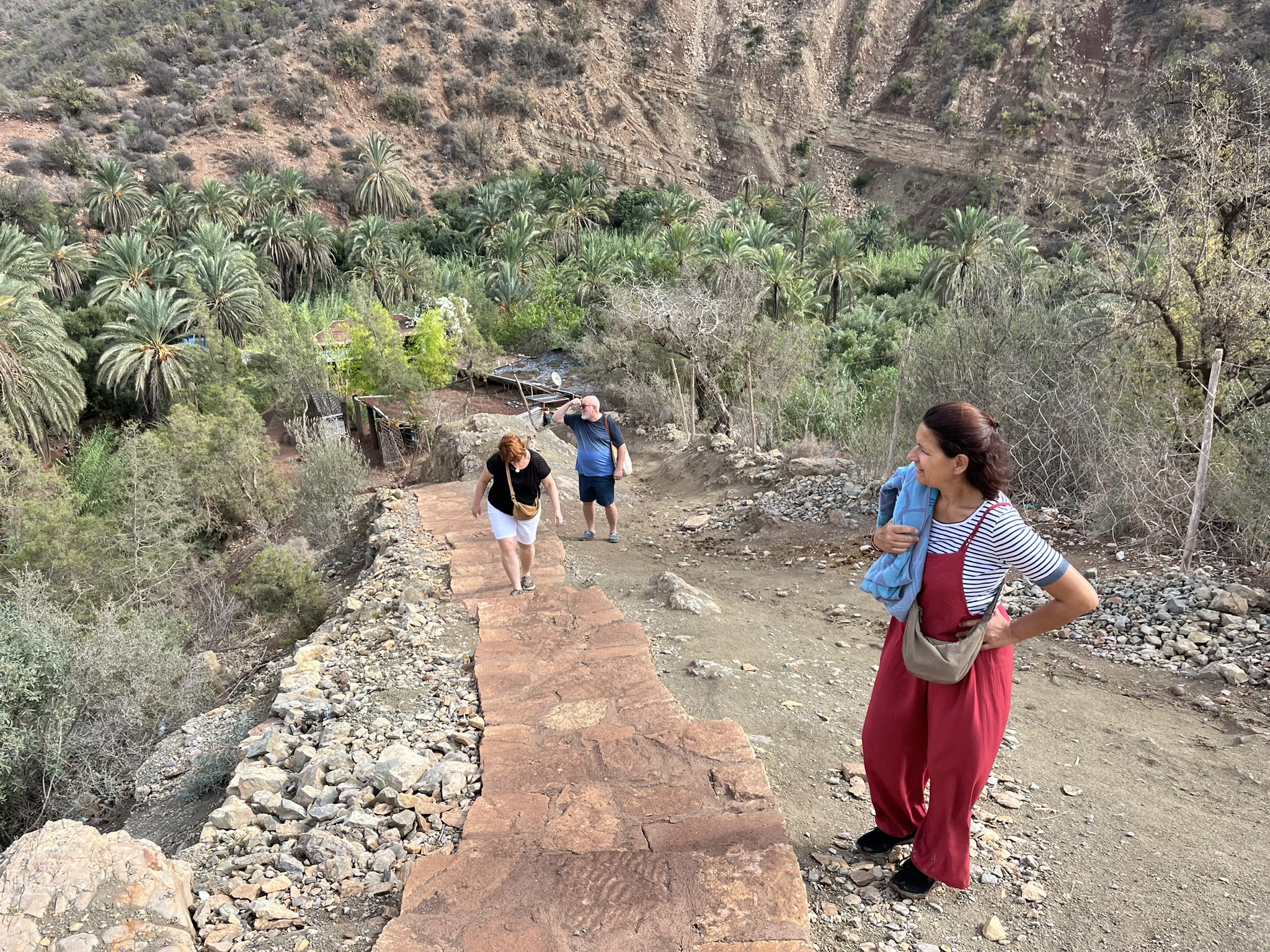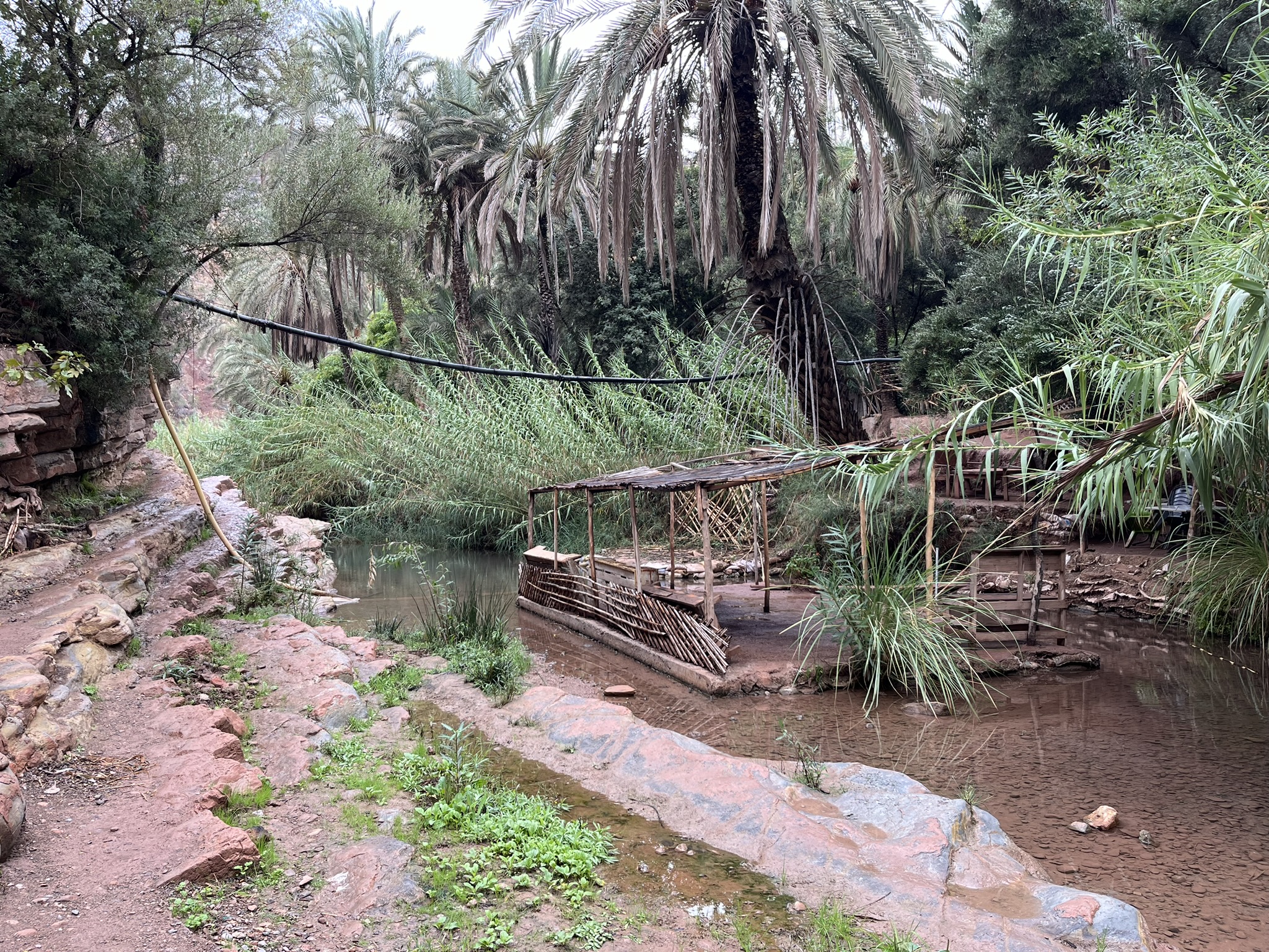 Wir mieten uns einen Dacia Logan und machen erstmal einen Tagesausflug mit Achim und Alexandra ins Paradies Village etwa eine Stunde von Agadir entfernt. Leider hat es in der Nacht geregnet, und da das Paradies Valley hauptsächlich aus Wegen mit Lehm und Erde besteht, kann man sich denken wie wir dort rumeierten. Es war eine ordentliche Rutschpartie die Berge rauf und runter und der ein oder andere hat sich auch mal auf den Hosenboden gelegt. Ansonsten ist es aber sehr schön dort. Das Tal wird aus Palmen gesäumt und in dem Flüsschen unten sind immer wieder kleine Kaffees wo man z.B. einen Smoothie trinken kann. Da es immer wieder etwas nachregnet, laufen wir den Weg nicht bis zum Ende zu den Wasserfällen. Es ist einfach zu rutschig. Da trinken wir doch lieber einen Smoothie und essen einen Crêpe. Zwischendurch adoptiert uns ein Hund der nicht mehr von der Seite weicht, und andere Hunde die auch mitmöchten, verscheucht.
