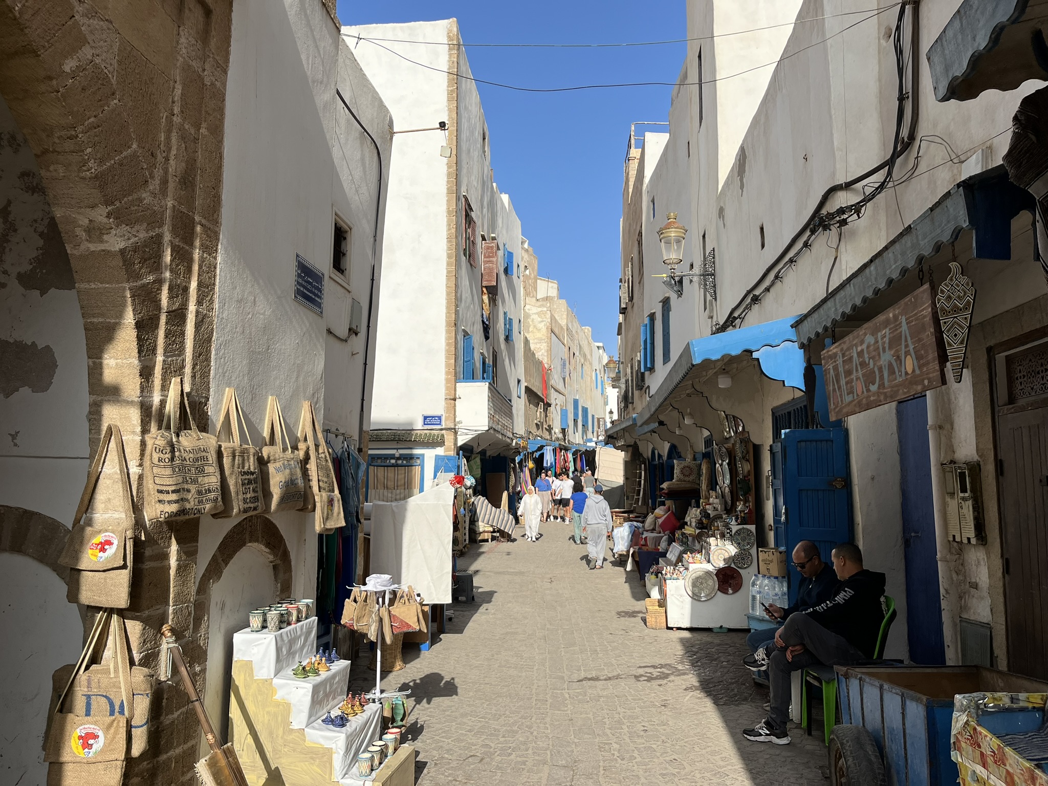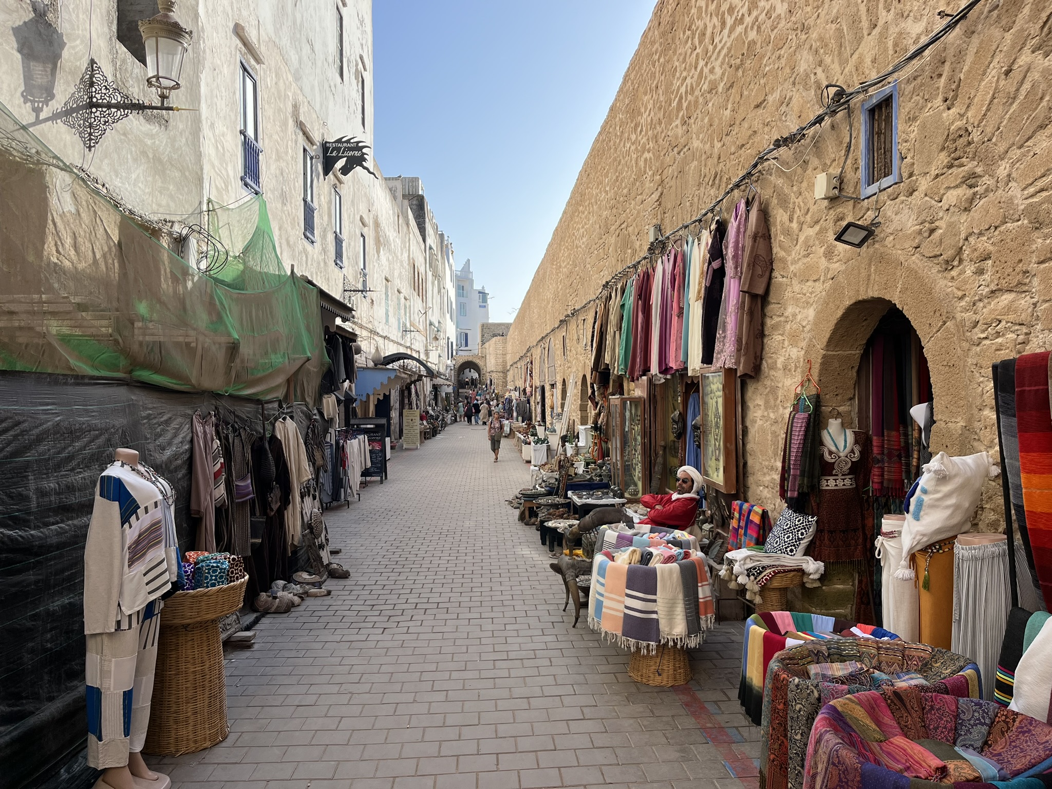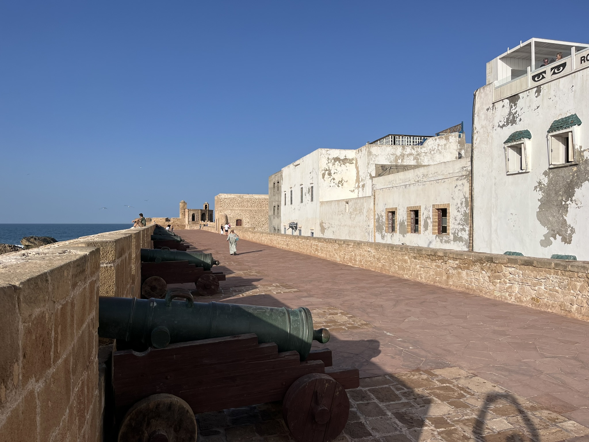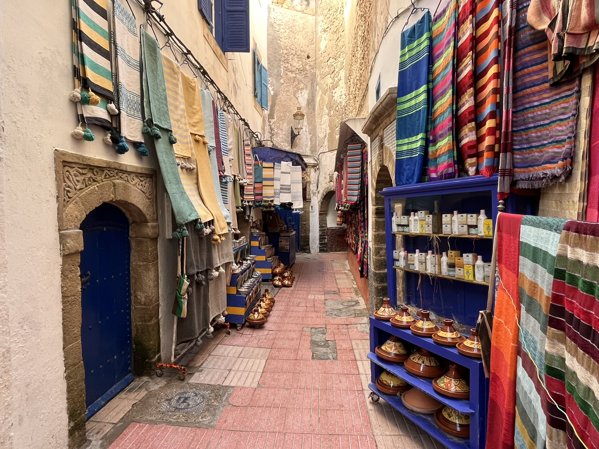Unsere erste Station ist die Stadt Essaouira 180km nördlich von Agadir. Diese gilt als eine der schönsten Städte des Landes mit einer tollen Medina. Wir mieten uns in ein kleines Hotel in der Altstadt in einem Riad ein. Das sind traditionelle Häuser die innen offen sind, und dort meistens einen begrünten mit schönen Kacheln versehenen Innenhof haben. Unser Riad gefällt uns auf anhieb. Das Zimmer ist einfach aber nett gestaltet und Frühstück gibt es im Innenhof. Los geht es, wir müssen nur die Haustür verlassen und sind mitten im Trubel. Im Prinzip besteht die Altstadt größtenteils aus Händlern die Themenweise in der Stadt verteilt sind, und aus ihren Häusern hinaus ihre Waren anbieten. Es gibt Straßenzüge für Lebensmittel, für Kunstwaren und auch spezielle für die Touristen mit Souvenirs und was man sonst so gerne kauft. Die Skipperin würde den Markt am liebsten leer kaufen. Zwischendurch sind immer wieder mehr oder weniger einfache Restaurants und Cafés. Die gesamte Medina ist von einer Mauer mit Kanonen umgeben. Wir laufen die ersten Stunden die Stadt ziellos rauf und runter und lassen alles auf uns wirken. Am Abend gehen wir einen leckeren Tajine (marokkanischer Eintopf) essen. Alkohol findet man hier übrigens kaum, fast alle normalen Restaurants bieten nur Getränke ohne an.