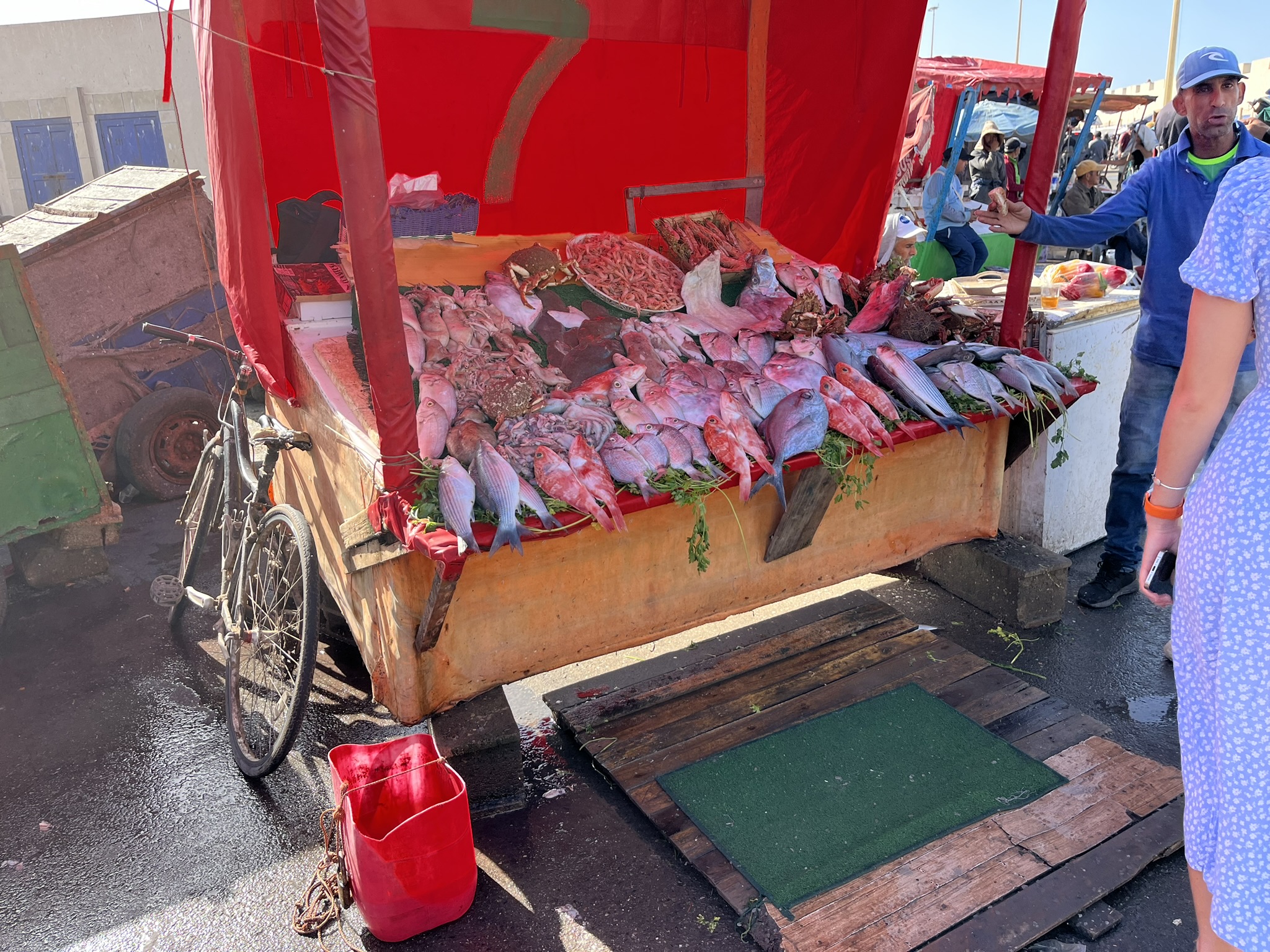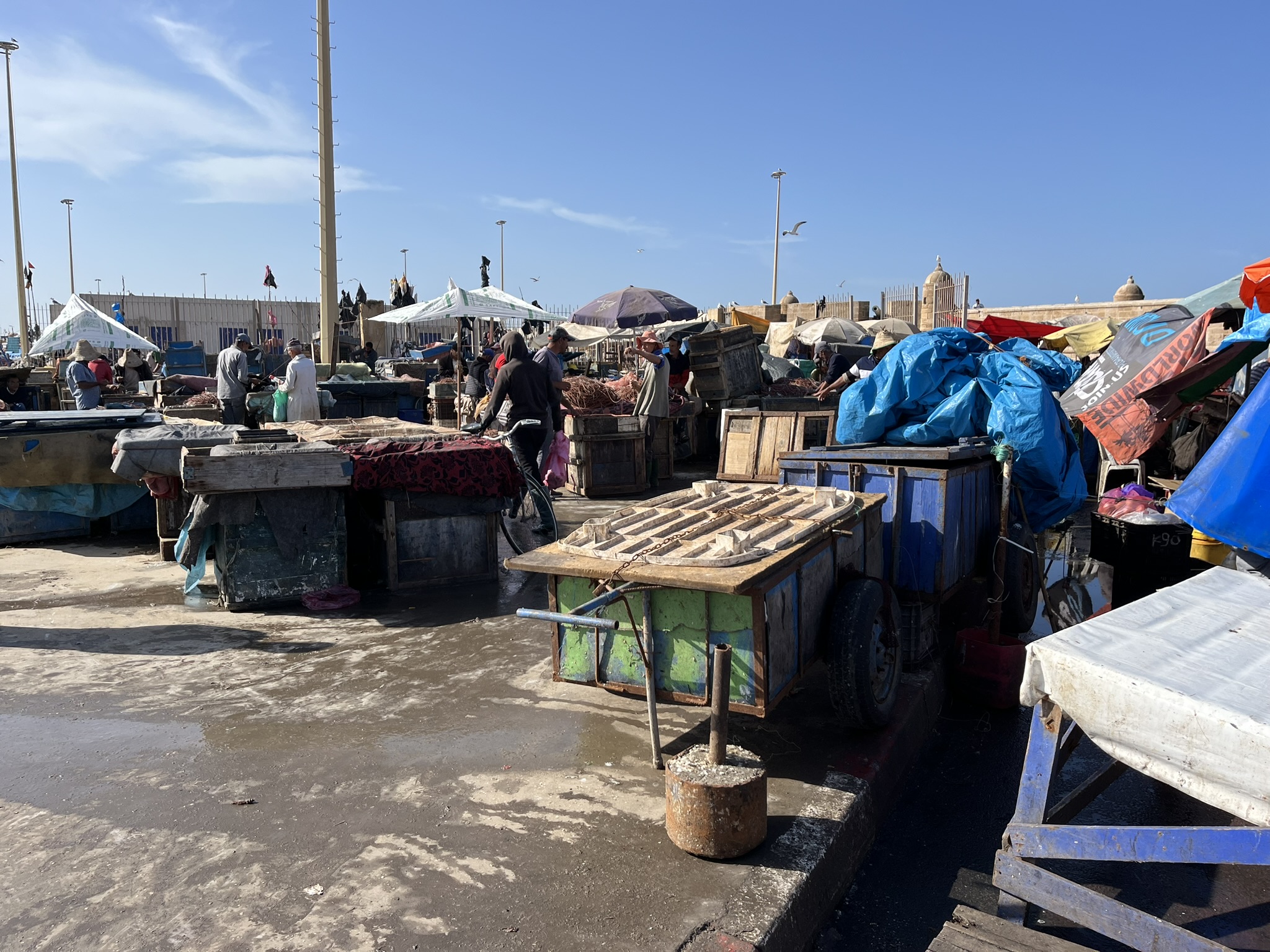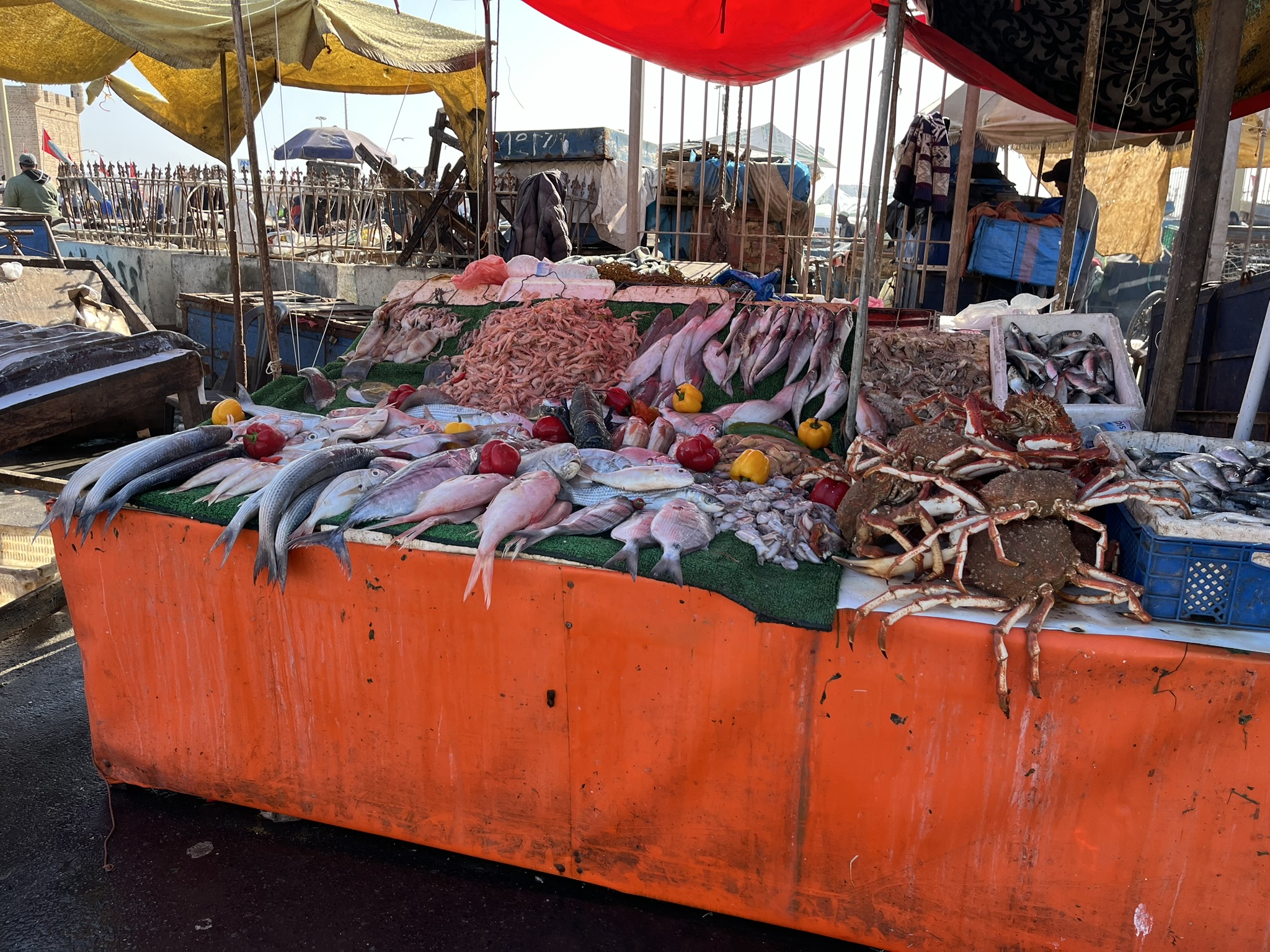 Morgens um halb 6 weckt uns dann der Ruf des Muezzins, um zum heiligen Gebet zu rufen. Die Minarette haben außen alle Lautsprecher, damit er auch nicht überhört wird. Insgesamt tun die das 5 mal am Tag und man gewöhnt sich recht schnell daran. Nach dem reichhaltigen Frühstück gehen wir zum Hafen wo täglich der Fischmarkt ist. Die Fischer verkaufen hier den fangfrischen Fisch und man kann sich vorstellen, dass ordentlich was los ist. Es gibt die kleinen Stände wo die Fischer die nur ein kleines Boot haben ihre überschaubare Menge anbieten. Und es gibt auch ein paar sehr große Boote wo die Fische direkt in Eis gelegt werden um mit Lastern abtransportiert zu werden. Wir sind von dem Angebot wirklich beeindruckt. Teilweise sind die Auslagen sehr appetitlich gestaltet, und es ist schade, dass wir hier keine Möglichkeit haben etwas zu kaufen und selber zuzubereiten. Der Königsfang dieser Nacht ist ein 350kg Thunfisch wie uns der Verkäufer stolz erzählt. Am Mittag wollen wir noch die Kamele am Strand besuchen, brechen aber den Marsch dorthin auf Grund der Hitze bald ab. Stattdessen gehen wir lieber auf ein kühles Getränk in eine der Strandbars. Zurück in der Medina statten wir noch der Galerie Kasbah einen Besuch ab. Man sieht auf mehreren Ebenen in vielen Räumen Bilder von marokkanischen Künstlern unterschiedlichster Richtung.