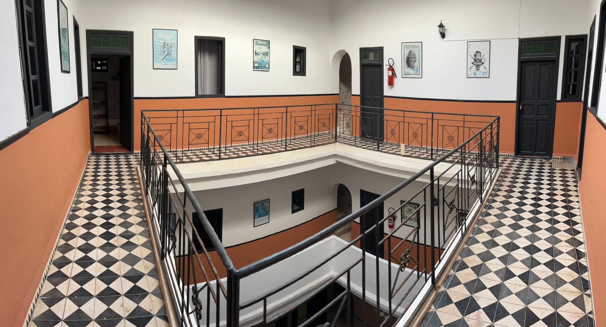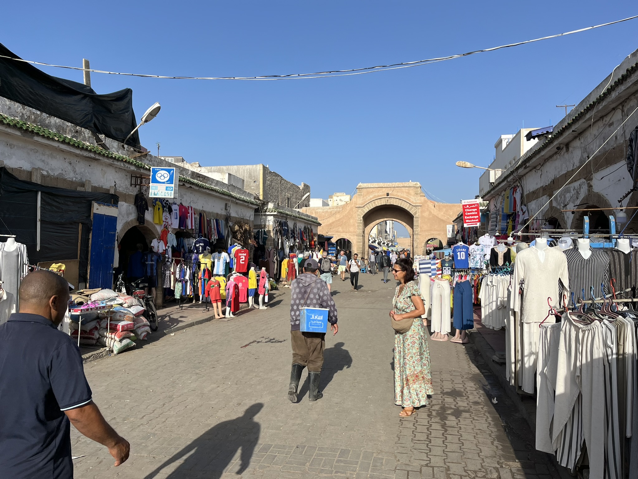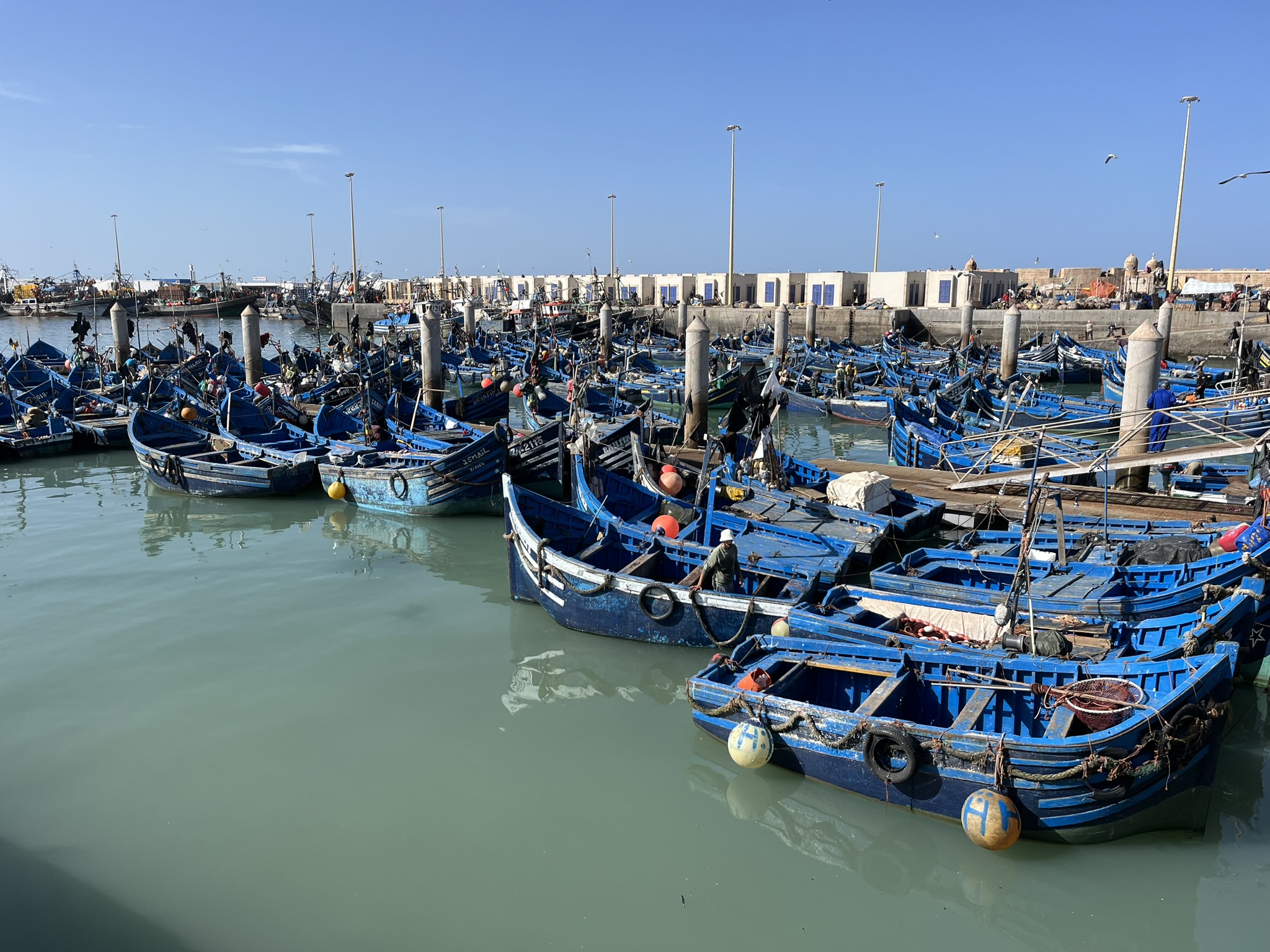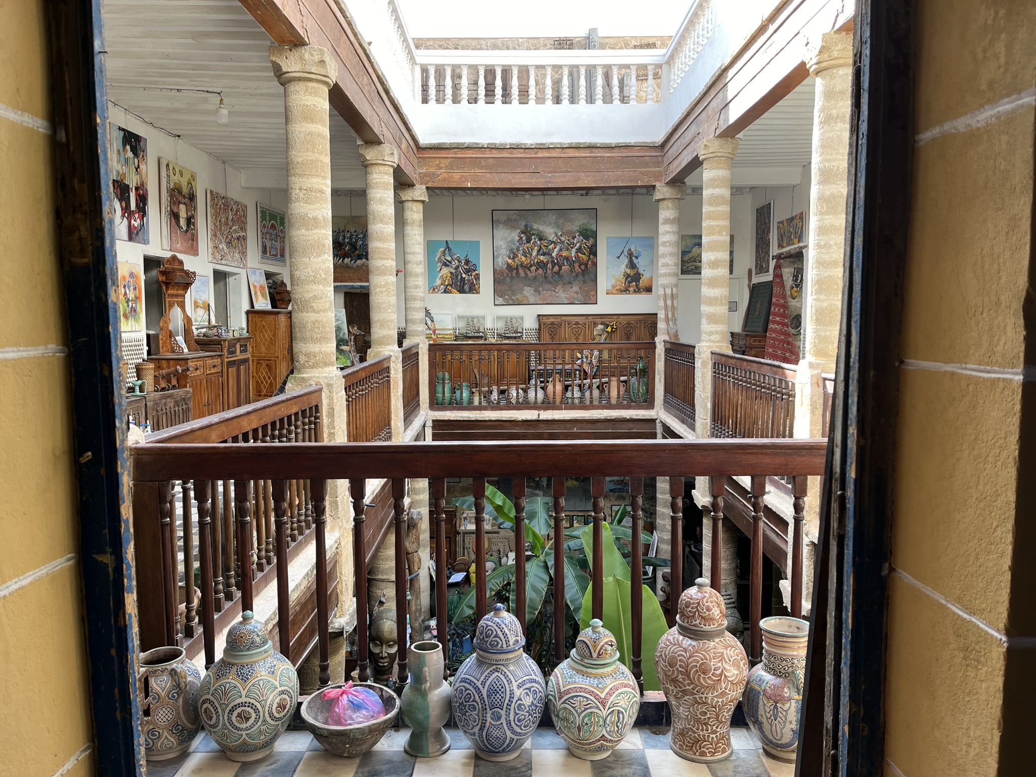 Morgens um halb 6 weckt uns dann der Ruf des Muezzins, um zum heiligen Gebet zu rufen. Die Minarette haben außen alle Lautsprecher, damit er auch nicht überhört wird. Insgesamt tun die das 5 mal am Tag und man gewöhnt sich recht schnell daran. Nach dem reichhaltigen Frühstück gehen wir zum Hafen wo täglich der Fischmarkt ist. Die Fischer verkaufen hier den fangfrischen Fisch und man kann sich vorstellen, dass ordentlich was los ist. Es gibt die kleinen Stände wo die Fischer die nur ein kleines Boot haben ihre überschaubare Menge anbieten. Und es gibt auch ein paar sehr große Boote wo die Fische direkt in Eis gelegt werden um mit Lastern abtransportiert zu werden. Wir sind von dem Angebot wirklich beeindruckt. Teilweise sind die Auslagen sehr appetitlich gestaltet, und es ist schade, dass wir hier keine Möglichkeit haben etwas zu kaufen und selber zuzubereiten. Der Königsfang dieser Nacht ist ein 350kg Thunfisch wie uns der Verkäufer stolz erzählt. Am Mittag wollen wir noch die Kamele am Strand besuchen, brechen aber den Marsch dorthin auf Grund der Hitze bald ab. Stattdessen gehen wir lieber auf ein kühles Getränk in eine der Strandbars. Zurück in der Medina statten wir noch der Galerie Kasbah einen Besuch ab. Man sieht auf mehreren Ebenen in vielen Räumen Bilder von marokkanischen Künstlern unterschiedlichster Richtung.