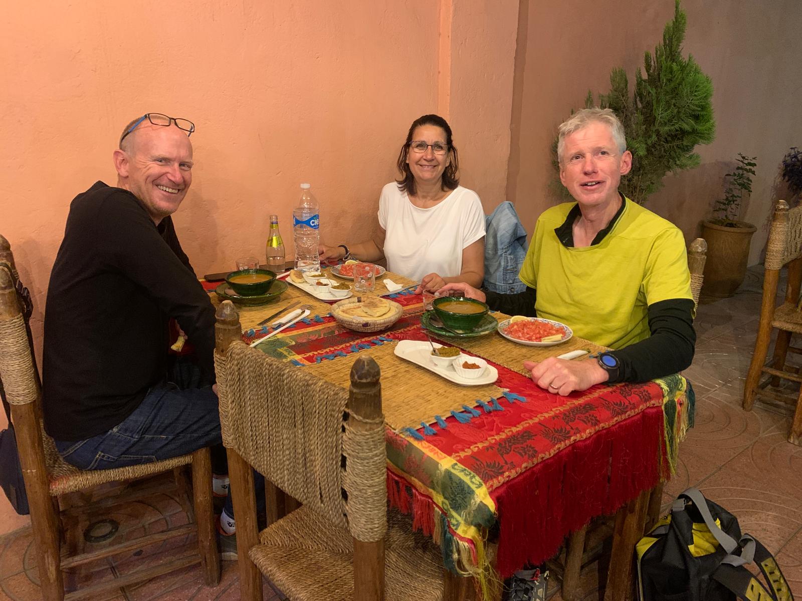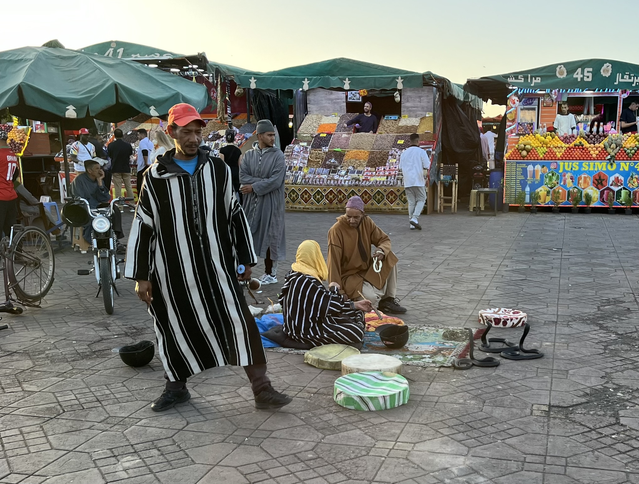 Am Abend haben wir uns zum Essen mit unserem Segelfreund Bernd verabredet der zufällig auch gerade hier ist. Wir hatten uns zuletzt in Schottland getroffen und dort einige Etappen zusammen zurückgelegt. Er hat das Segelboot mit dem Fahrrad getauscht und macht eine beeindruckende Tour durch Marokko und das Atlas Gebirge. Auf dem Weg zu dem Restaurant kommen wir am Platz der Gaukler vorbei. Das ist ein wahrhaft riesiger Platz auf dem am Abend das Leben erwacht. Es gibt sehr viele Essenstände, etwas Flohmarkt und die Gaukler. Das sind z.B. verkleidete Menschen die Darbietungen aufführen, Schlangenbeschwörer, Veranstalter von Glücksspielen, Musiker und Tänzer und noch vieles mehr. Ein Wahnsinn was hier los ist wenn es dunkel wird. Mit Bernd verbringen wir einen netten Abend und reden diesmal nicht mehr so viel über das Segeln wie noch beim letzten Treffen im hohen Norden.