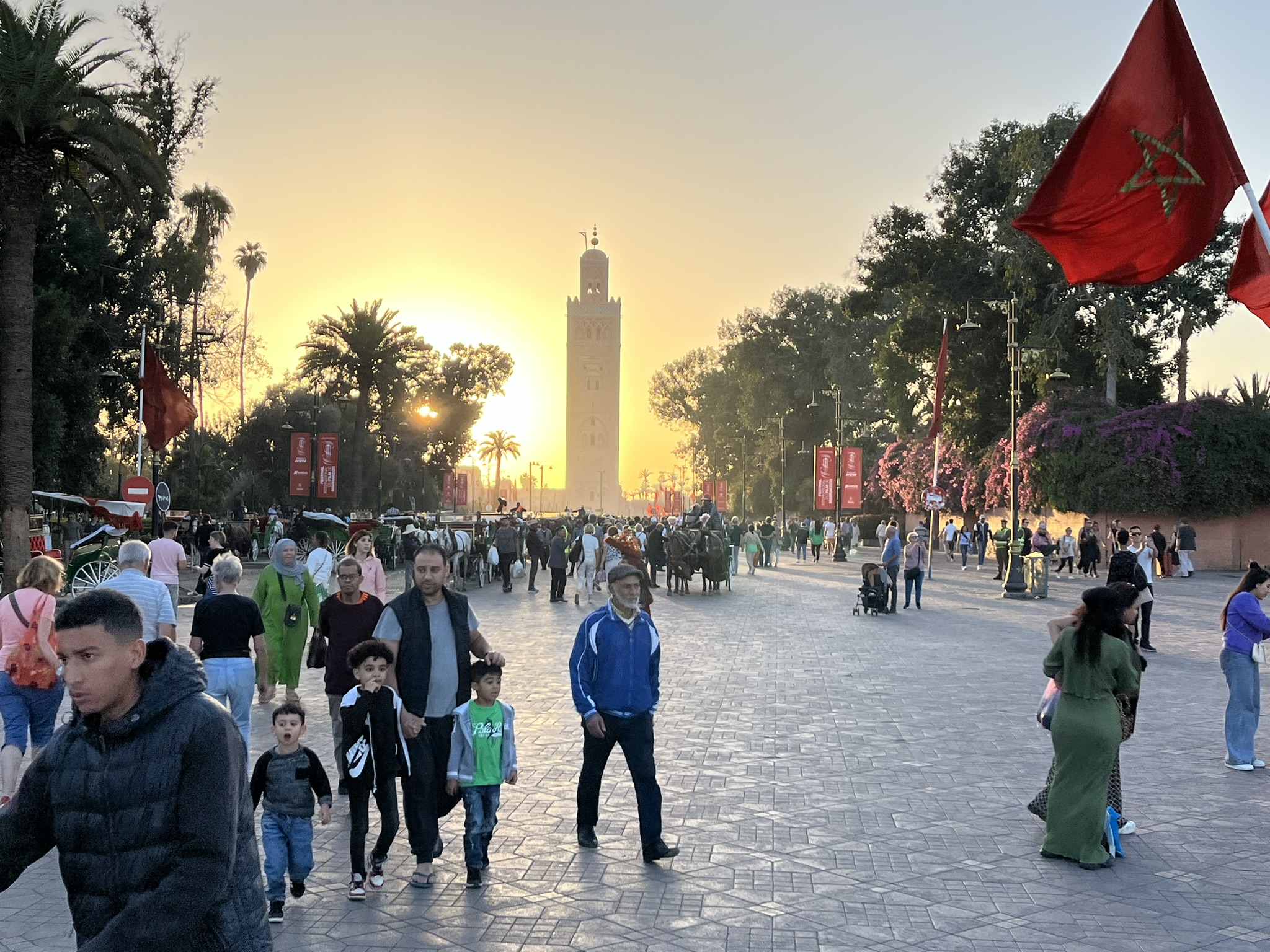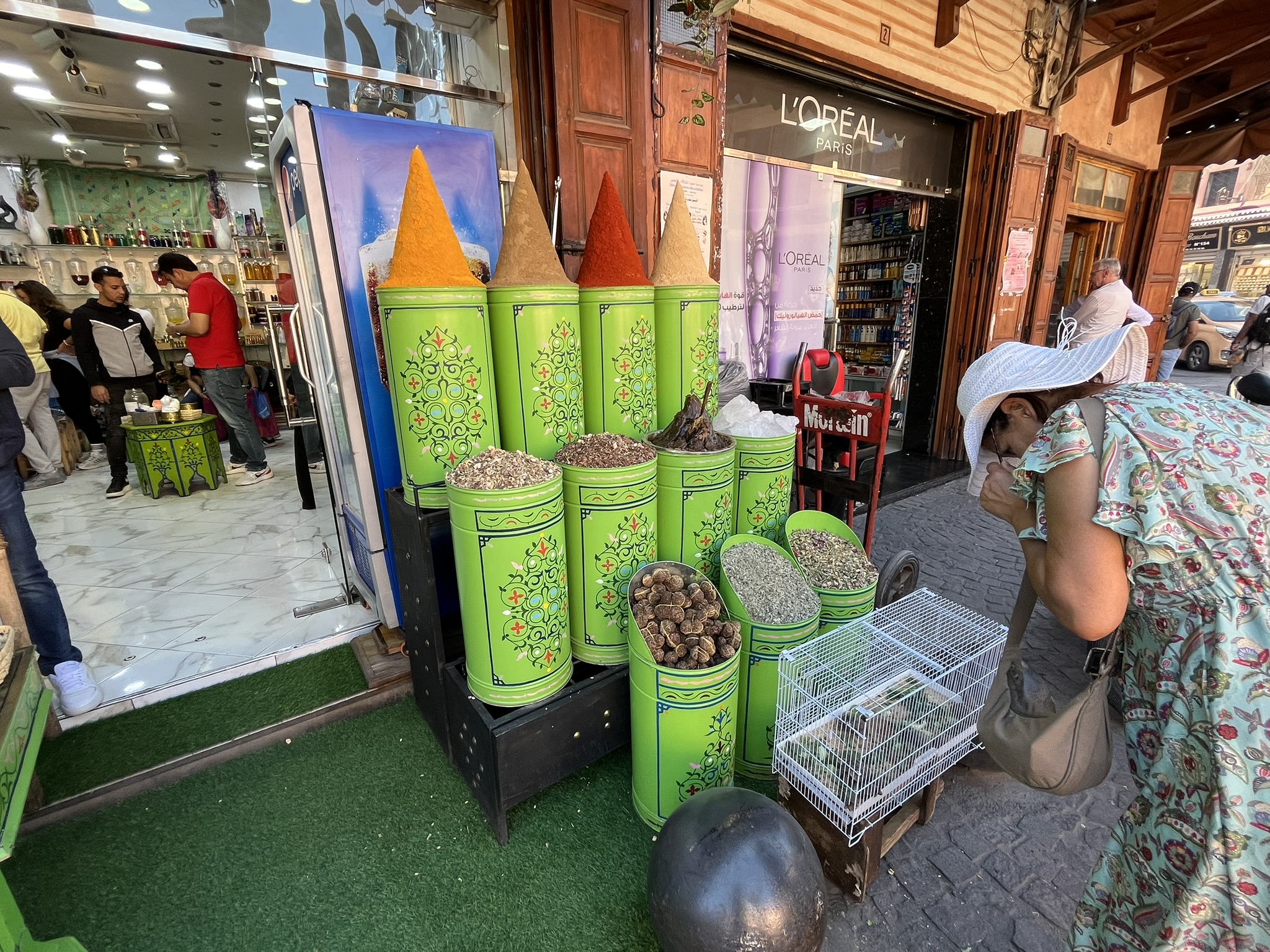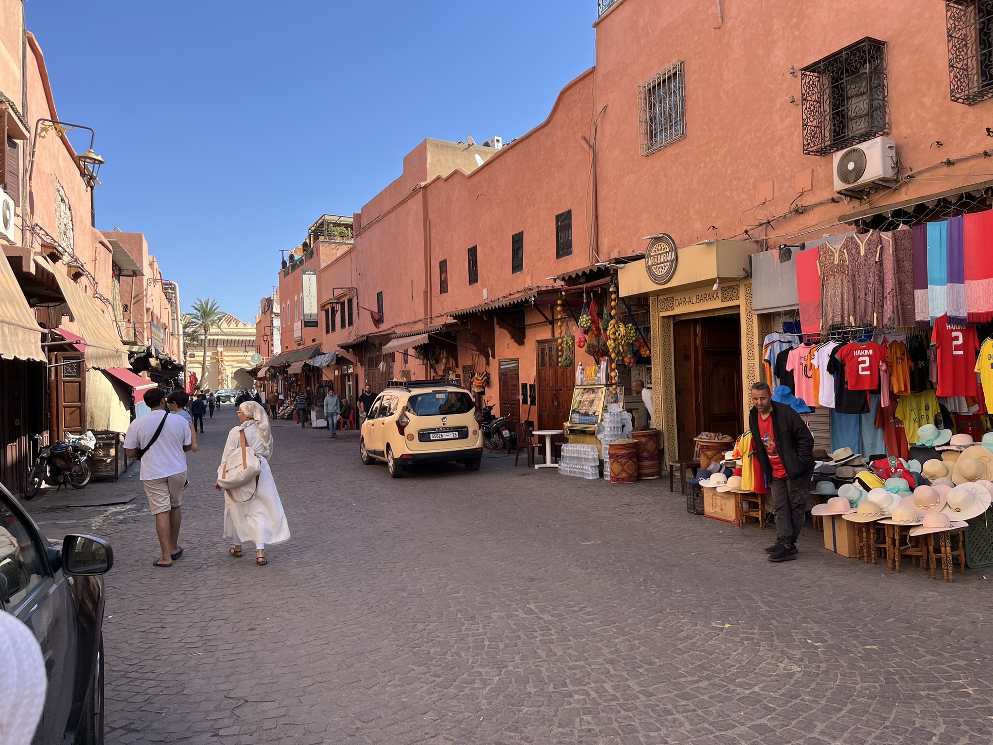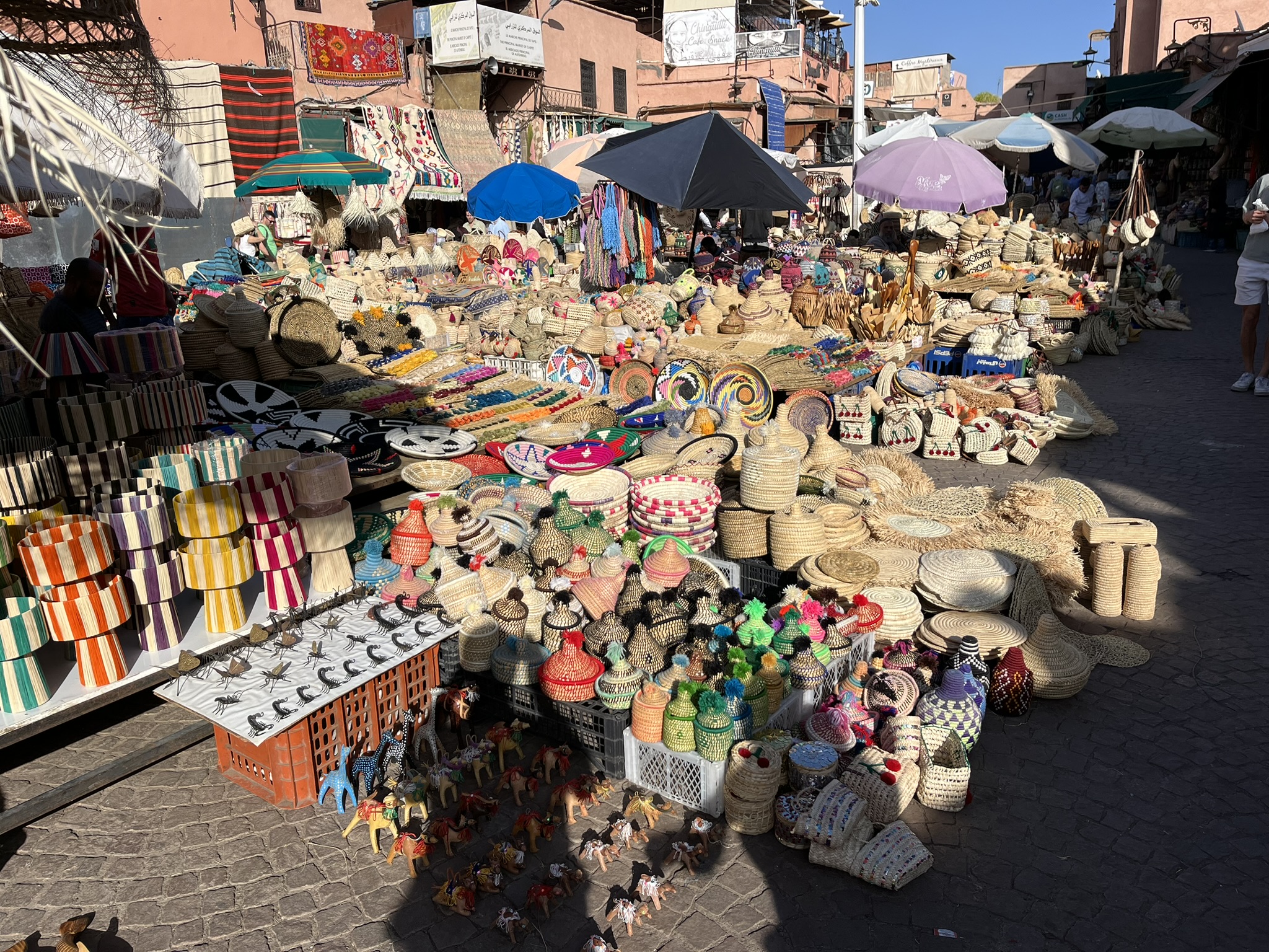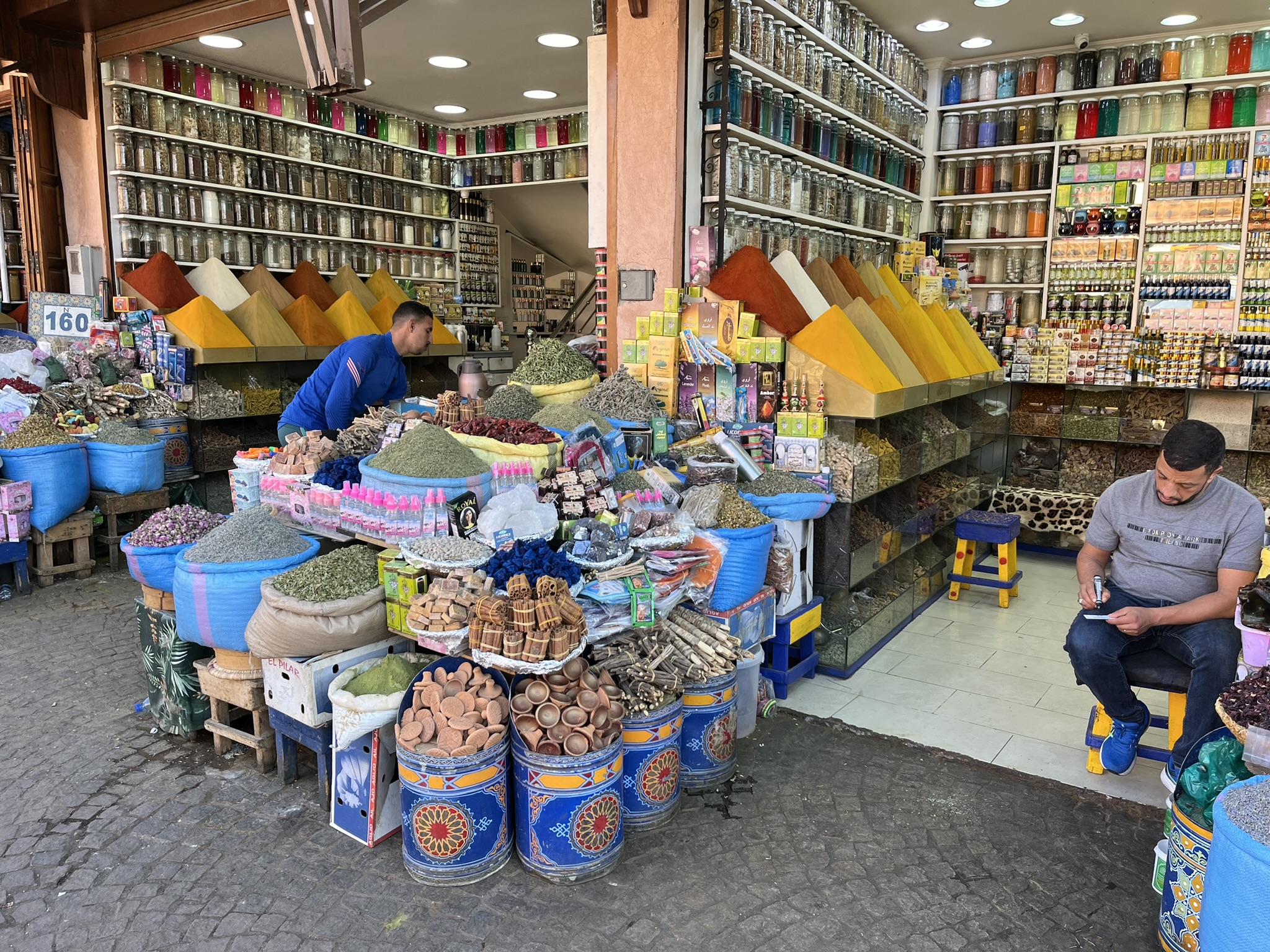 Auf geht’s ins Gewühl nach Marrakesch. Die Fahrt in die Stadt hinein ist schon spannend, aber wenn man sich der nicht gerade defensiven Fahrweise etwas anpasst, und im Strom mitschwimmt, geht es eigentlich. Google Maps will uns dann mitten durch die Altstadt führen was komplett ausgeschlossen ist. Zum Glück ist dort wo wir abbrechen ein Parkplatz, der uns einen guten Platz für die 2 Tage anbietet. Von dort müssen wir noch 20min durch das Gewühl der Altstadt bis zu unserer Unterkunft dem nächsten Riad laufen. Die Lage ist wieder super aber insgesamt ist das Riad nicht so schön wie in Essaouira. Nach einer kurzen Pause stürzen wir uns in die Medina (Altstadt) von Marrakesch und sind sehr beeindruckt. Dagegen ist Essaouira ein Kindergarten. Hunderte von Händlern bieten lautstark in den Gassen ihre Waren an. Es gibt beeindruckende Läden die durchaus eine anständige Qualität und Auswahl anbieten. Das grundsätzliche Problem ist halt, man ist sich nie sicher wie denn ein fairer Verkaufspreis wäre, und hat erstmal Bedenken über den Tisch gezogen zu werden. Man muss sehen was es einem Wert ist und vergleichen. Ganz so schlimm wie befürchtet ist es insgesamt aber nicht. Man wird sicherlich öfters angesprochen als man es möchte, aber das gehört nun mal dazu. Und wenn man freundlich ablehnt wird es auch freundlich akzeptiert. Etwas kritisch sind die vielen Motoradfahrer, die relativ rücksichtslos durch die Medina und die Menschmengen fahren. Dadurch ist man ständig auf der Hut und muss sich immer schön rechts halten. Wir finden es ein Wunder, dass da nicht ständig was passiert.
