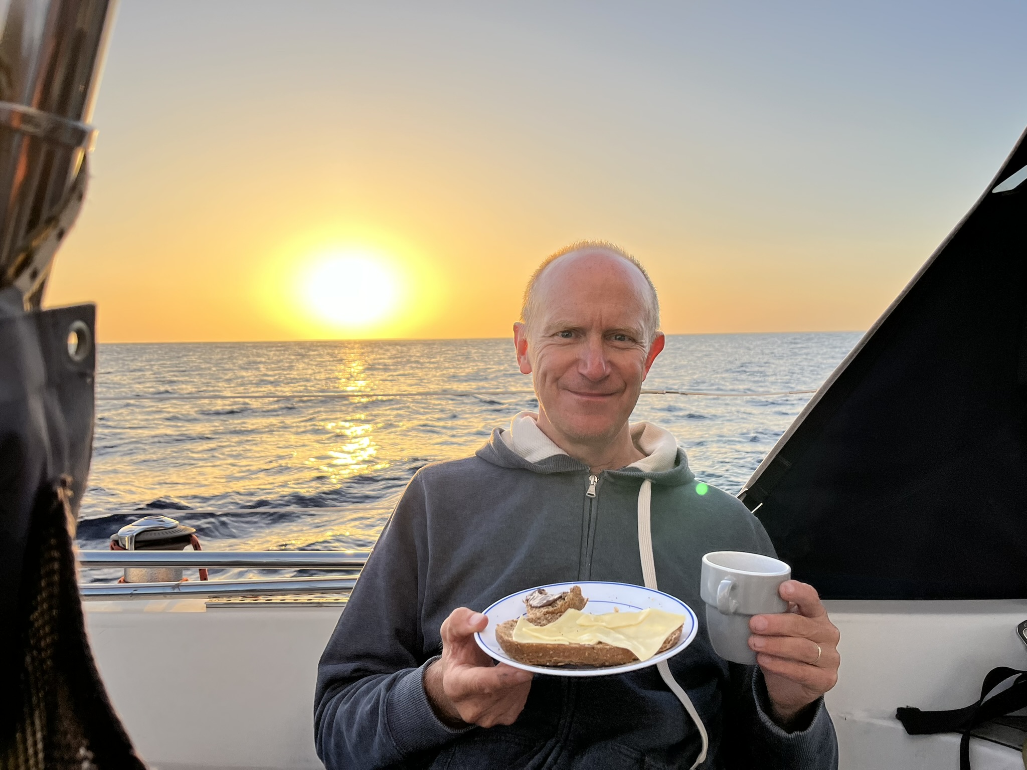 Zur Überfahrt selber: Die Geduld des Skippers wird auf eine harte Probe gestellt. Selten war die Windvorhersage so falsch wie auf diesem Turn. Nicht nur die Windstärke war völlig daneben, oft war auch die Windrichtung komplett woanders her. Dadurch lief der Motor wieder deutlich mehr als geplant, zum Glück waren wir in Agadir noch tanken. Um wenigstens die leichten Windphasen zu segeln, sind wir unter dem Strich deutlich langsamer gewesen und werden es nicht schaffen bei Tageslicht anzukommen. Die Wachwechsel klappen wieder sehr gut, wir haben den bewährten 3-Stunden Rhythmus eingehalten und kamen so gut durch die 3 Nächte. Da bald Neumond ist, war es nachts tief schwarz. Bis auf die erste Nacht mit den schlechtbeleuchteten marokkanischen Fischerbooten war das aber nicht so schlimm, weil wir ziemlich alleine waren. Immer wieder erwähnenswert ist die wunderbare Begleitung der Delfine.